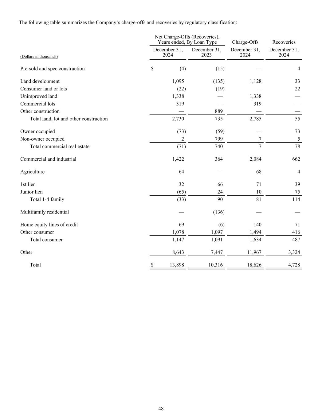 The following table summarizes the Company’s charge-offs and recoveries by regulatory classification: Net Charge-Offs (Recoveries), Years ended, By Loan Type Charge-Offs Recoveries (Dollars in thousands) December 31, 2024 December 31, 2023 December 31, 2024 December 31, 2024 Pre-sold and spec construction $ (4) (15) — 4 Land development 1,095 (135) 1,128 33 Consumer land or lots (22) (19) — 22 Unimproved land 1,338 — 1,338 — Commercial lots 319 — 319 — Other construction — 889 — — Total land, lot and other construction 2,730 735 2,785 55 Owner occupied (73) (59) — 73 Non-owner occupied 2 799 7 5 Total commercial real estate (71) 740 7 78 Commercial and industrial 1,422 364 2,084 662 Agriculture 64 — 68 4 1st lien 32 66 71 39 Junior lien (65) 24 10 75 Total 1-4 family (33) 90 81 114 Multifamily residential — (136) — — Home equity lines of credit 69 (6) 140 71 Other consumer 1,078 1,097 1,494 416 Total consumer 1,147 1,091 1,634 487 Other 8,643 7,447 11,967 3,324 Total $ 13,898 10,316 18,626 4,728 48