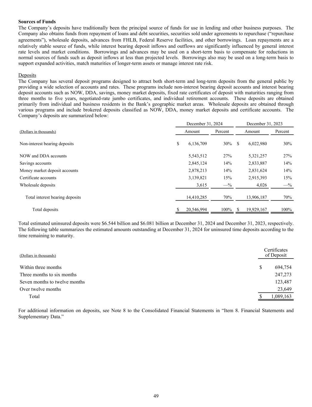 Sources of Funds The Company’s deposits have traditionally been the principal source of funds for use in lending and other business purposes. The Company also obtains funds from repayment of loans and debt securities, securities sold under agreements to repurchase (“repurchase agreements”), wholesale deposits, advances from FHLB, Federal Reserve facilities, and other borrowings. Loan repayments are a relatively stable source of funds, while interest bearing deposit inflows and outflows are significantly influenced by general interest rate levels and market conditions. Borrowings and advances may be used on a short-term basis to compensate for reductions in normal sources of funds such as deposit inflows at less than projected levels. Borrowings also may be used on a long-term basis to support expanded activities, match maturities of longer-term assets or manage interest rate risk. Deposits The Company has several deposit programs designed to attract both short-term and long-term deposits from the general public by providing a wide selection of accounts and rates. These programs include non-interest bearing deposit accounts and interest bearing deposit accounts such as NOW, DDA, savings, money market deposits, fixed rate certificates of deposit with maturities ranging from three months to five years, negotiated-rate jumbo certificates, and individual retirement accounts. These deposits are obtained primarily from individual and business residents in the Bank’s geographic market areas. Wholesale deposits are obtained through various programs and include brokered deposits classified as NOW, DDA, money market deposits and certificate accounts. The Company’s deposits are summarized below: December 31, 2024 December 31, 2023 (Dollars in thousands) Amount Percent Amount Percent Non-interest bearing deposits $ 6,136,709 30% $ 6,022,980 30% NOW and DDA accounts 5,543,512 27% 5,321,257 27% Savings accounts 2,845,124 14% 2,833,887 14% Money market deposit accounts 2,878,213 14% 2,831,624 14% Certificate accounts 3,139,821 15% 2,915,393 15% Wholesale deposits 3,615 —% 4,026 —% Total interest bearing deposits 14,410,285 70% 13,906,187 70% Total deposits $ 20,546,994 100% $ 19,929,167 100% Total estimated uninsured deposits were $6.544 billion and $6.081 billion at December 31, 2024 and December 31, 2023, respectively. The following table summarizes the estimated amounts outstanding at December 31, 2024 for uninsured time deposits according to the time remaining to maturity. (Dollars in thousands) Certificates of Deposit Within three months $ 694,754 Three months to six months 247,273 Seven months to twelve months 123,487 Over twelve months 23,649 Total $ 1,089,163 For additional information on deposits, see Note 8 to the Consolidated Financial Statements in “Item 8. Financial Statements and Supplementary Data.” 49
