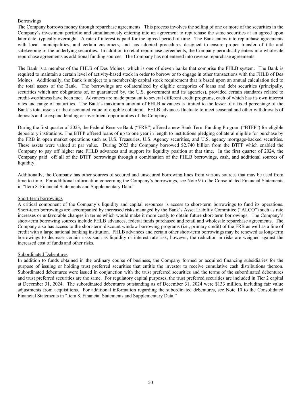 Borrowings The Company borrows money through repurchase agreements. This process involves the selling of one or more of the securities in the Company’s investment portfolio and simultaneously entering into an agreement to repurchase the same securities at an agreed upon later date, typically overnight. A rate of interest is paid for the agreed period of time. The Bank enters into repurchase agreements with local municipalities, and certain customers, and has adopted procedures designed to ensure proper transfer of title and safekeeping of the underlying securities. In addition to retail repurchase agreements, the Company periodically enters into wholesale repurchase agreements as additional funding sources. The Company has not entered into reverse repurchase agreements. The Bank is a member of the FHLB of Des Moines, which is one of eleven banks that comprise the FHLB system. The Bank is required to maintain a certain level of activity-based stock in order to borrow or to engage in other transactions with the FHLB of Des Moines. Additionally, the Bank is subject to a membership capital stock requirement that is based upon an annual calculation tied to the total assets of the Bank. The borrowings are collateralized by eligible categories of loans and debt securities (principally, securities which are obligations of, or guaranteed by, the U.S. government and its agencies), provided certain standards related to credit-worthiness have been met. Advances are made pursuant to several different credit programs, each of which has its own interest rates and range of maturities. The Bank’s maximum amount of FHLB advances is limited to the lesser of a fixed percentage of the Bank’s total assets or the discounted value of eligible collateral. FHLB advances fluctuate to meet seasonal and other withdrawals of deposits and to expand lending or investment opportunities of the Company. During the first quarter of 2023, the Federal Reserve Bank (“FRB”) offered a new Bank Term Funding Program (“BTFP”) for eligible depository institutions. The BTFP offered loans of up to one year in length to institutions pledging collateral eligible for purchase by the FRB in open market operations such as U.S. Treasuries, U.S. Agency securities, and U.S. agency mortgage-backed securities. These assets were valued at par value. During 2023 the Company borrowed $2.740 billion from the BTFP which enabled the Company to pay off higher rate FHLB advances and support its liquidity position at that time. In the first quarter of 2024, the Company paid off all of the BTFP borrowings through a combination of the FHLB borrowings, cash, and additional sources of liquidity. Additionally, the Company has other sources of secured and unsecured borrowing lines from various sources that may be used from time to time. For additional information concerning the Company’s borrowings, see Note 9 to the Consolidated Financial Statements in “Item 8. Financial Statements and Supplementary Data.” Short-term borrowings A critical component of the Company’s liquidity and capital resources is access to short-term borrowings to fund its operations. Short-term borrowings are accompanied by increased risks managed by the Bank’s Asset Liability Committee (“ALCO”) such as rate increases or unfavorable changes in terms which would make it more costly to obtain future short-term borrowings. The Company’s short-term borrowing sources include FHLB advances, federal funds purchased and retail and wholesale repurchase agreements. The Company also has access to the short-term discount window borrowing programs (i.e., primary credit) of the FRB as well as a line of credit with a large national banking institution. FHLB advances and certain other short-term borrowings may be renewed as long-term borrowings to decrease certain risks such as liquidity or interest rate risk; however, the reduction in risks are weighed against the increased cost of funds and other risks. Subordinated Debentures In addition to funds obtained in the ordinary course of business, the Company formed or acquired financing subsidiaries for the purpose of issuing or holding trust preferred securities that entitle the investor to receive cumulative cash distributions thereon. Subordinated debentures were issued in conjunction with the trust preferred securities and the terms of the subordinated debentures and trust preferred securities are the same. For regulatory capital purposes, the trust preferred securities are included in Tier 2 capital at December 31, 2024. The subordinated debentures outstanding as of December 31, 2024 were $133 million, including fair value adjustments from acquisitions. For additional information regarding the subordinated debentures, see Note 10 to the Consolidated Financial Statements in “Item 8. Financial Statements and Supplementary Data.” 50