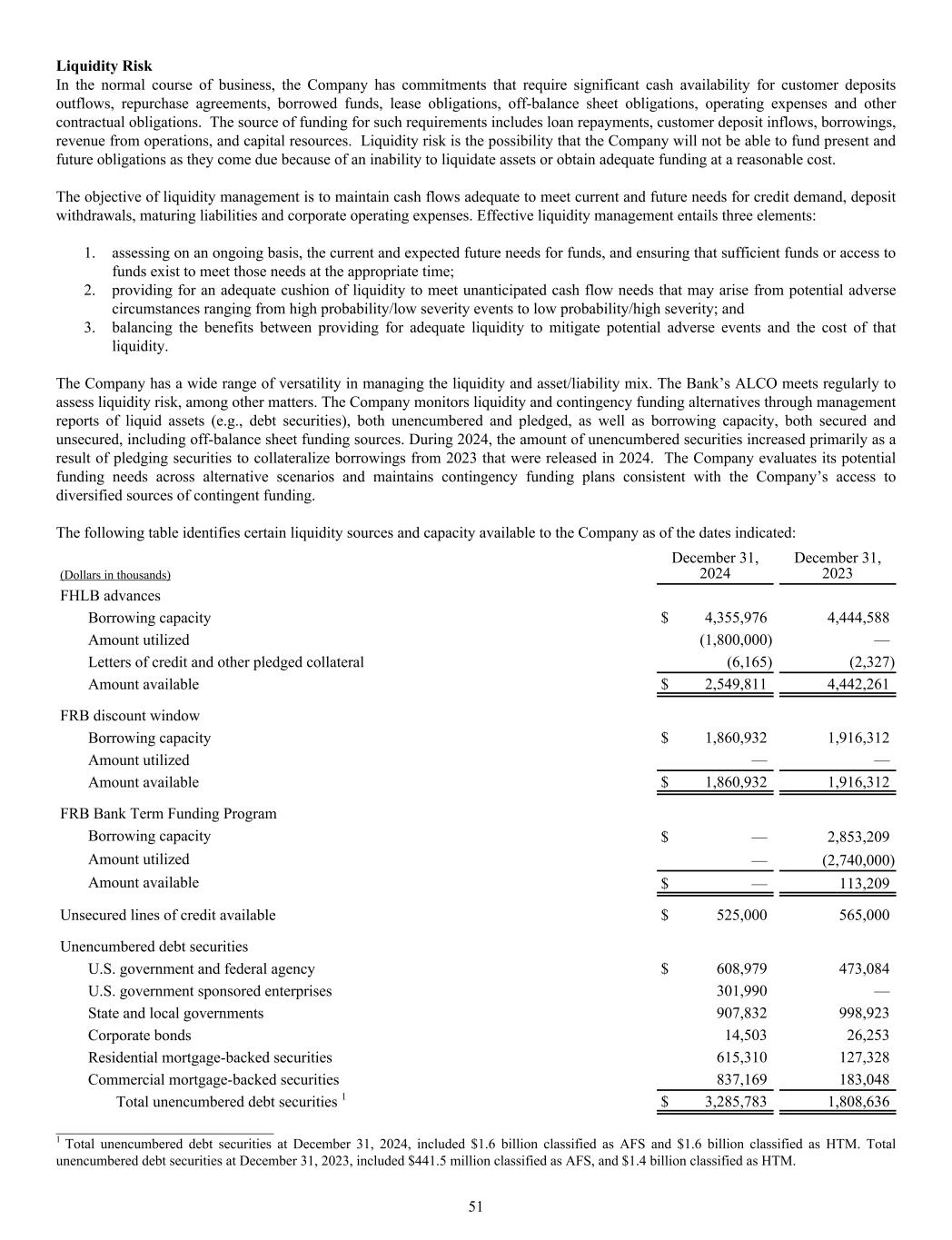Liquidity Risk In the normal course of business, the Company has commitments that require significant cash availability for customer deposits outflows, repurchase agreements, borrowed funds, lease obligations, off-balance sheet obligations, operating expenses and other contractual obligations. The source of funding for such requirements includes loan repayments, customer deposit inflows, borrowings, revenue from operations, and capital resources. Liquidity risk is the possibility that the Company will not be able to fund present and future obligations as they come due because of an inability to liquidate assets or obtain adequate funding at a reasonable cost. The objective of liquidity management is to maintain cash flows adequate to meet current and future needs for credit demand, deposit withdrawals, maturing liabilities and corporate operating expenses. Effective liquidity management entails three elements: 1. assessing on an ongoing basis, the current and expected future needs for funds, and ensuring that sufficient funds or access to funds exist to meet those needs at the appropriate time; 2. providing for an adequate cushion of liquidity to meet unanticipated cash flow needs that may arise from potential adverse circumstances ranging from high probability/low severity events to low probability/high severity; and 3. balancing the benefits between providing for adequate liquidity to mitigate potential adverse events and the cost of that liquidity. The Company has a wide range of versatility in managing the liquidity and asset/liability mix. The Bank’s ALCO meets regularly to assess liquidity risk, among other matters. The Company monitors liquidity and contingency funding alternatives through management reports of liquid assets (e.g., debt securities), both unencumbered and pledged, as well as borrowing capacity, both secured and unsecured, including off-balance sheet funding sources. During 2024, the amount of unencumbered securities increased primarily as a result of pledging securities to collateralize borrowings from 2023 that were released in 2024. The Company evaluates its potential funding needs across alternative scenarios and maintains contingency funding plans consistent with the Company’s access to diversified sources of contingent funding. The following table identifies certain liquidity sources and capacity available to the Company as of the dates indicated: (Dollars in thousands) December 31, 2024 December 31, 2023 FHLB advances Borrowing capacity $ 4,355,976 4,444,588 Amount utilized (1,800,000) — Letters of credit and other pledged collateral (6,165) (2,327) Amount available $ 2,549,811 4,442,261 FRB discount window Borrowing capacity $ 1,860,932 1,916,312 Amount utilized — — Amount available $ 1,860,932 1,916,312 FRB Bank Term Funding Program Borrowing capacity $ — 2,853,209 Amount utilized — (2,740,000) Amount available $ — 113,209 Unsecured lines of credit available $ 525,000 565,000 Unencumbered debt securities U.S. government and federal agency $ 608,979 473,084 U.S. government sponsored enterprises 301,990 — State and local governments 907,832 998,923 Corporate bonds 14,503 26,253 Residential mortgage-backed securities 615,310 127,328 Commercial mortgage-backed securities 837,169 183,048 Total unencumbered debt securities 1 $ 3,285,783 1,808,636 ____________________________ 1 Total unencumbered debt securities at December 31, 2024, included $1.6 billion classified as AFS and $1.6 billion classified as HTM. Total unencumbered debt securities at December 31, 2023, included $441.5 million classified as AFS, and $1.4 billion classified as HTM. 51
