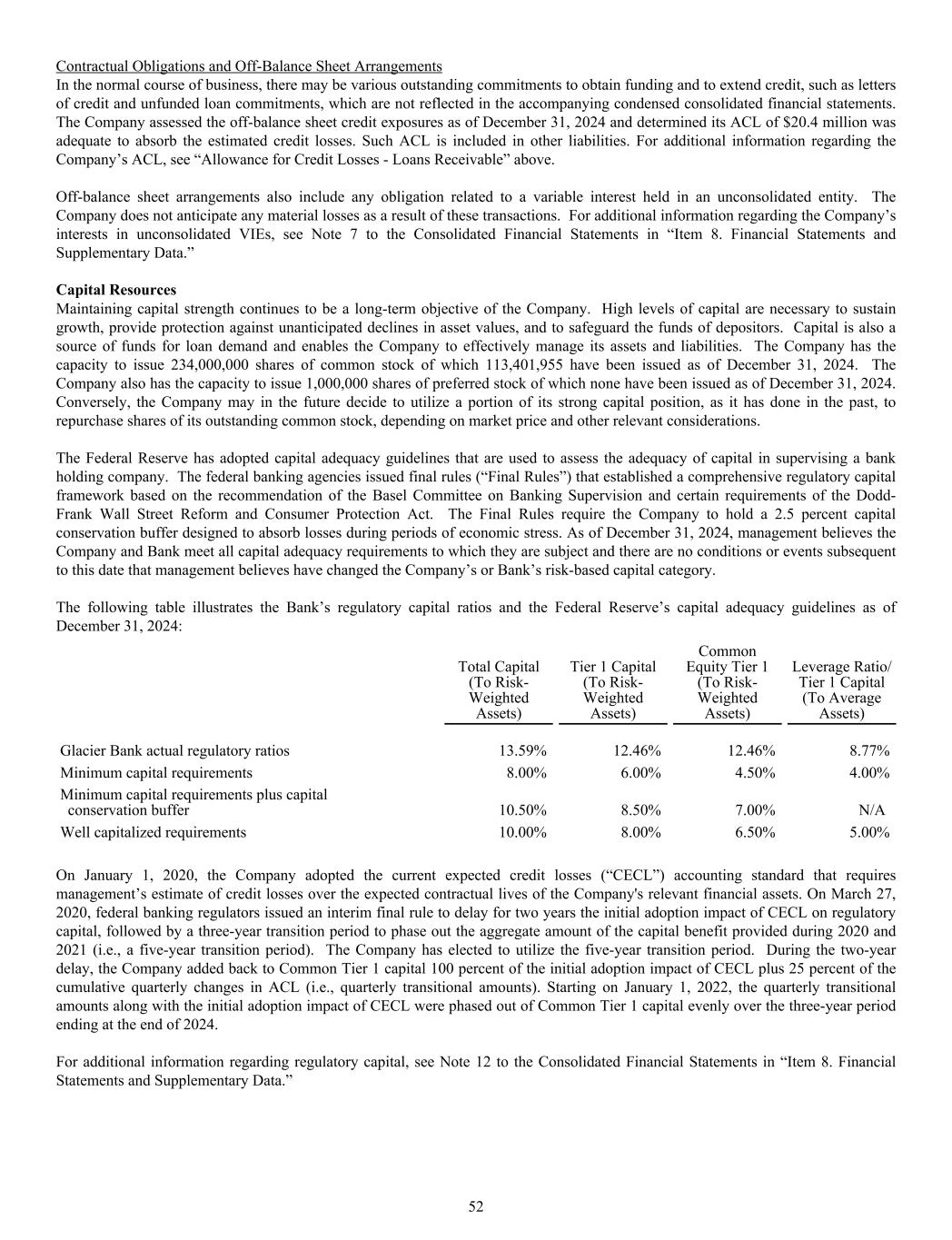 Contractual Obligations and Off-Balance Sheet Arrangements In the normal course of business, there may be various outstanding commitments to obtain funding and to extend credit, such as letters of credit and unfunded loan commitments, which are not reflected in the accompanying condensed consolidated financial statements. The Company assessed the off-balance sheet credit exposures as of December 31, 2024 and determined its ACL of $20.4 million was adequate to absorb the estimated credit losses. Such ACL is included in other liabilities. For additional information regarding the Company’s ACL, see “Allowance for Credit Losses - Loans Receivable” above. Off-balance sheet arrangements also include any obligation related to a variable interest held in an unconsolidated entity. The Company does not anticipate any material losses as a result of these transactions. For additional information regarding the Company’s interests in unconsolidated VIEs, see Note 7 to the Consolidated Financial Statements in “Item 8. Financial Statements and Supplementary Data.” Capital Resources Maintaining capital strength continues to be a long-term objective of the Company. High levels of capital are necessary to sustain growth, provide protection against unanticipated declines in asset values, and to safeguard the funds of depositors. Capital is also a source of funds for loan demand and enables the Company to effectively manage its assets and liabilities. The Company has the capacity to issue 234,000,000 shares of common stock of which 113,401,955 have been issued as of December 31, 2024. The Company also has the capacity to issue 1,000,000 shares of preferred stock of which none have been issued as of December 31, 2024. Conversely, the Company may in the future decide to utilize a portion of its strong capital position, as it has done in the past, to repurchase shares of its outstanding common stock, depending on market price and other relevant considerations. The Federal Reserve has adopted capital adequacy guidelines that are used to assess the adequacy of capital in supervising a bank holding company. The federal banking agencies issued final rules (“Final Rules”) that established a comprehensive regulatory capital framework based on the recommendation of the Basel Committee on Banking Supervision and certain requirements of the Dodd- Frank Wall Street Reform and Consumer Protection Act. The Final Rules require the Company to hold a 2.5 percent capital conservation buffer designed to absorb losses during periods of economic stress. As of December 31, 2024, management believes the Company and Bank meet all capital adequacy requirements to which they are subject and there are no conditions or events subsequent to this date that management believes have changed the Company’s or Bank’s risk-based capital category. The following table illustrates the Bank’s regulatory capital ratios and the Federal Reserve’s capital adequacy guidelines as of December 31, 2024: Total Capital (To Risk- Weighted Assets) Tier 1 Capital (To Risk- Weighted Assets) Common Equity Tier 1 (To Risk- Weighted Assets) Leverage Ratio/ Tier 1 Capital (To Average Assets) Glacier Bank actual regulatory ratios 13.59% 12.46% 12.46% 8.77% Minimum capital requirements 8.00% 6.00% 4.50% 4.00% Minimum capital requirements plus capital conservation buffer 10.50% 8.50% 7.00% N/A Well capitalized requirements 10.00% 8.00% 6.50% 5.00% On January 1, 2020, the Company adopted the current expected credit losses (“CECL”) accounting standard that requires management’s estimate of credit losses over the expected contractual lives of the Company's relevant financial assets. On March 27, 2020, federal banking regulators issued an interim final rule to delay for two years the initial adoption impact of CECL on regulatory capital, followed by a three-year transition period to phase out the aggregate amount of the capital benefit provided during 2020 and 2021 (i.e., a five-year transition period). The Company has elected to utilize the five-year transition period. During the two-year delay, the Company added back to Common Tier 1 capital 100 percent of the initial adoption impact of CECL plus 25 percent of the cumulative quarterly changes in ACL (i.e., quarterly transitional amounts). Starting on January 1, 2022, the quarterly transitional amounts along with the initial adoption impact of CECL were phased out of Common Tier 1 capital evenly over the three-year period ending at the end of 2024. For additional information regarding regulatory capital, see Note 12 to the Consolidated Financial Statements in “Item 8. Financial Statements and Supplementary Data.” 52