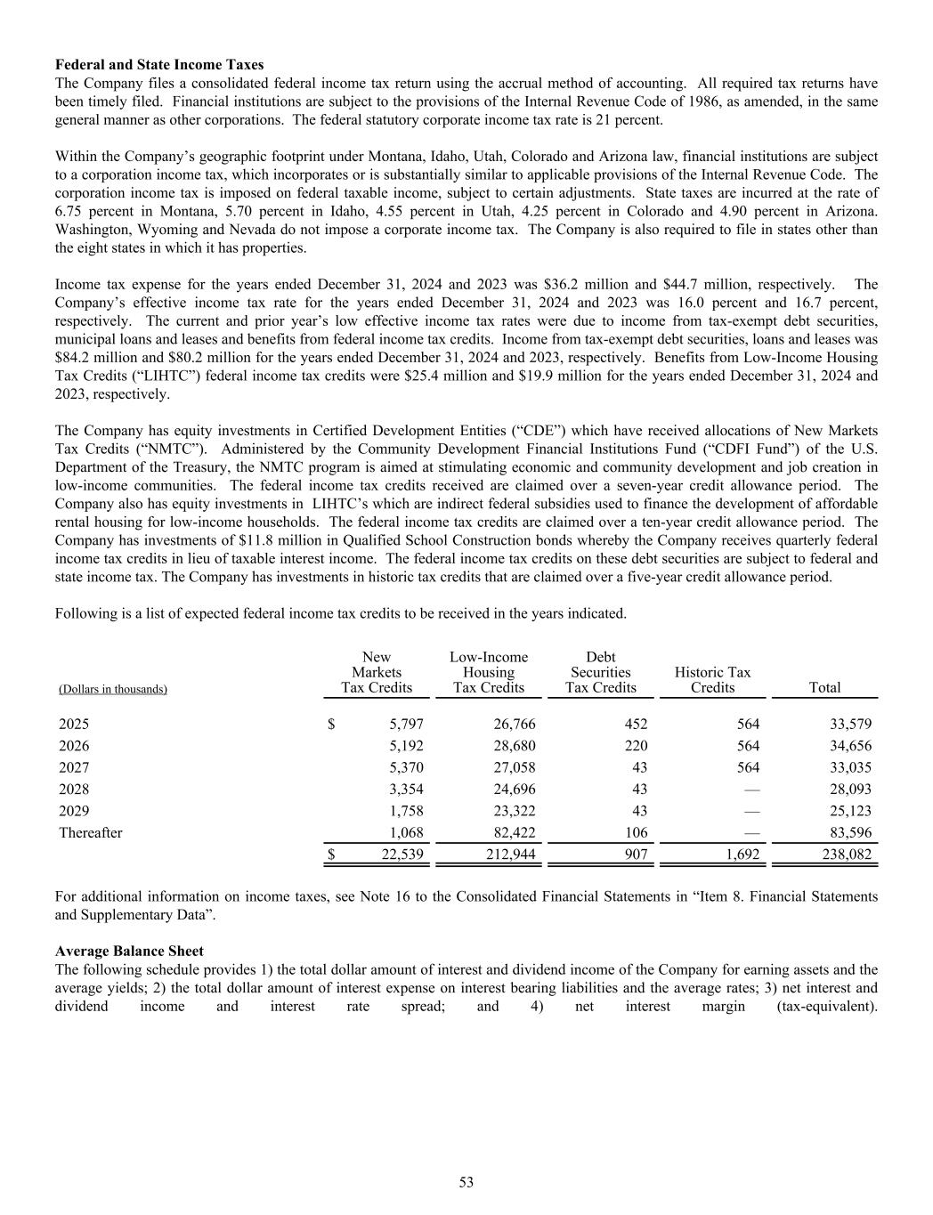 Federal and State Income Taxes The Company files a consolidated federal income tax return using the accrual method of accounting. All required tax returns have been timely filed. Financial institutions are subject to the provisions of the Internal Revenue Code of 1986, as amended, in the same general manner as other corporations. The federal statutory corporate income tax rate is 21 percent. Within the Company’s geographic footprint under Montana, Idaho, Utah, Colorado and Arizona law, financial institutions are subject to a corporation income tax, which incorporates or is substantially similar to applicable provisions of the Internal Revenue Code. The corporation income tax is imposed on federal taxable income, subject to certain adjustments. State taxes are incurred at the rate of 6.75 percent in Montana, 5.70 percent in Idaho, 4.55 percent in Utah, 4.25 percent in Colorado and 4.90 percent in Arizona. Washington, Wyoming and Nevada do not impose a corporate income tax. The Company is also required to file in states other than the eight states in which it has properties. Income tax expense for the years ended December 31, 2024 and 2023 was $36.2 million and $44.7 million, respectively. The Company’s effective income tax rate for the years ended December 31, 2024 and 2023 was 16.0 percent and 16.7 percent, respectively. The current and prior year’s low effective income tax rates were due to income from tax-exempt debt securities, municipal loans and leases and benefits from federal income tax credits. Income from tax-exempt debt securities, loans and leases was $84.2 million and $80.2 million for the years ended December 31, 2024 and 2023, respectively. Benefits from Low-Income Housing Tax Credits (“LIHTC”) federal income tax credits were $25.4 million and $19.9 million for the years ended December 31, 2024 and 2023, respectively. The Company has equity investments in Certified Development Entities (“CDE”) which have received allocations of New Markets Tax Credits (“NMTC”). Administered by the Community Development Financial Institutions Fund (“CDFI Fund”) of the U.S. Department of the Treasury, the NMTC program is aimed at stimulating economic and community development and job creation in low-income communities. The federal income tax credits received are claimed over a seven-year credit allowance period. The Company also has equity investments in LIHTC’s which are indirect federal subsidies used to finance the development of affordable rental housing for low-income households. The federal income tax credits are claimed over a ten-year credit allowance period. The Company has investments of $11.8 million in Qualified School Construction bonds whereby the Company receives quarterly federal income tax credits in lieu of taxable interest income. The federal income tax credits on these debt securities are subject to federal and state income tax. The Company has investments in historic tax credits that are claimed over a five-year credit allowance period. Following is a list of expected federal income tax credits to be received in the years indicated. (Dollars in thousands) New Markets Tax Credits Low-Income Housing Tax Credits Debt Securities Tax Credits Historic Tax Credits Total 2025 $ 5,797 26,766 452 564 33,579 2026 5,192 28,680 220 564 34,656 2027 5,370 27,058 43 564 33,035 2028 3,354 24,696 43 — 28,093 2029 1,758 23,322 43 — 25,123 Thereafter 1,068 82,422 106 — 83,596 $ 22,539 212,944 907 1,692 238,082 For additional information on income taxes, see Note 16 to the Consolidated Financial Statements in “Item 8. Financial Statements and Supplementary Data”. Average Balance Sheet The following schedule provides 1) the total dollar amount of interest and dividend income of the Company for earning assets and the average yields; 2) the total dollar amount of interest expense on interest bearing liabilities and the average rates; 3) net interest and dividend income and interest rate spread; and 4) net interest margin (tax-equivalent). 53