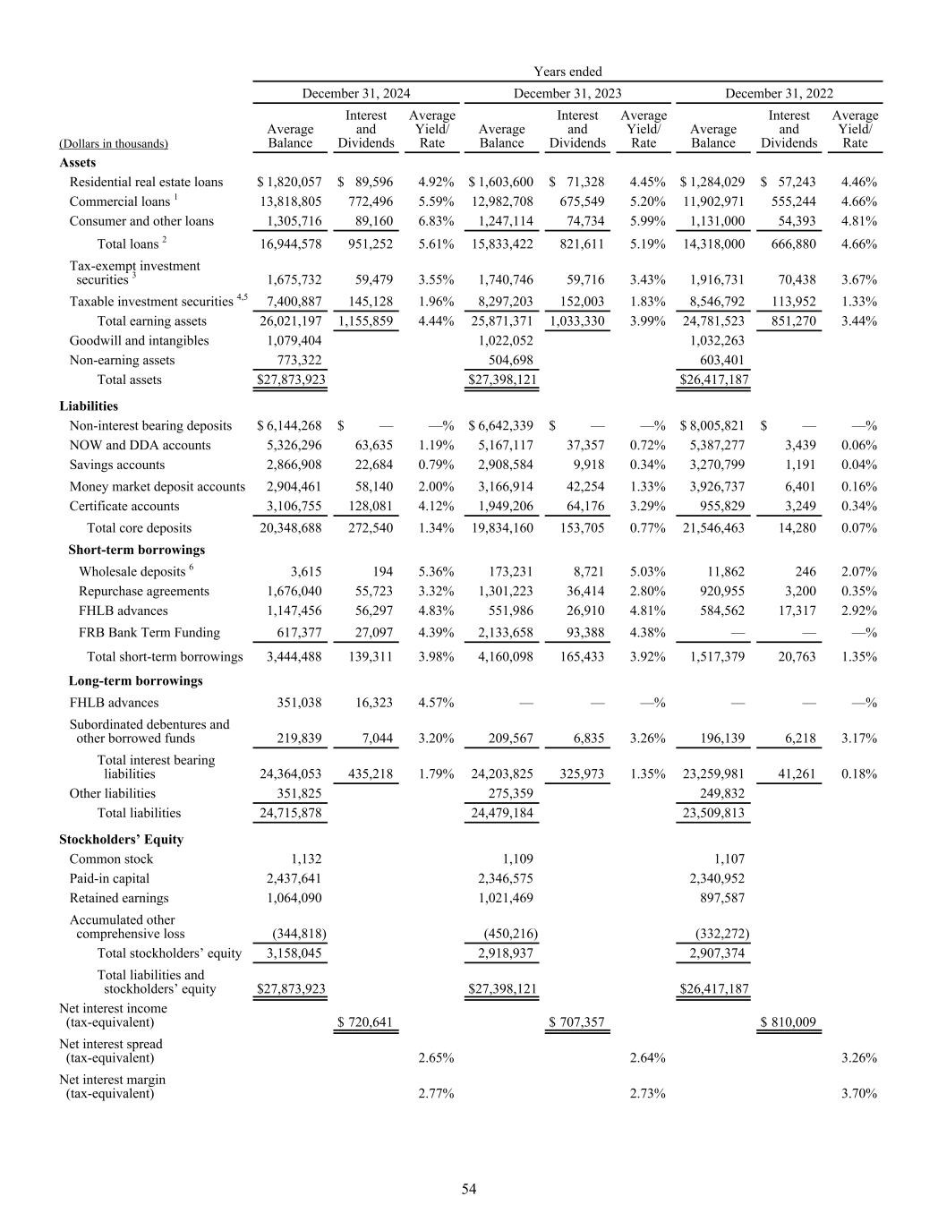 Years ended December 31, 2024 December 31, 2023 December 31, 2022 (Dollars in thousands) Average Balance Interest and Dividends Average Yield/ Rate Average Balance Interest and Dividends Average Yield/ Rate Average Balance Interest and Dividends Average Yield/ Rate Assets Residential real estate loans $ 1,820,057 $ 89,596 4.92% $ 1,603,600 $ 71,328 4.45% $ 1,284,029 $ 57,243 4.46% Commercial loans 1 13,818,805 772,496 5.59% 12,982,708 675,549 5.20% 11,902,971 555,244 4.66% Consumer and other loans 1,305,716 89,160 6.83% 1,247,114 74,734 5.99% 1,131,000 54,393 4.81% Total loans 2 16,944,578 951,252 5.61% 15,833,422 821,611 5.19% 14,318,000 666,880 4.66% Tax-exempt investment securities 3 1,675,732 59,479 3.55% 1,740,746 59,716 3.43% 1,916,731 70,438 3.67% Taxable investment securities 4,5 7,400,887 145,128 1.96% 8,297,203 152,003 1.83% 8,546,792 113,952 1.33% Total earning assets 26,021,197 1,155,859 4.44% 25,871,371 1,033,330 3.99% 24,781,523 851,270 3.44% Goodwill and intangibles 1,079,404 1,022,052 1,032,263 Non-earning assets 773,322 504,698 603,401 Total assets $ 27,873,923 $ 27,398,121 $ 26,417,187 Liabilities Non-interest bearing deposits $ 6,144,268 $ — —% $ 6,642,339 $ — —% $ 8,005,821 $ — —% NOW and DDA accounts 5,326,296 63,635 1.19% 5,167,117 37,357 0.72% 5,387,277 3,439 0.06% Savings accounts 2,866,908 22,684 0.79% 2,908,584 9,918 0.34% 3,270,799 1,191 0.04% Money market deposit accounts 2,904,461 58,140 2.00% 3,166,914 42,254 1.33% 3,926,737 6,401 0.16% Certificate accounts 3,106,755 128,081 4.12% 1,949,206 64,176 3.29% 955,829 3,249 0.34% Total core deposits 20,348,688 272,540 1.34% 19,834,160 153,705 0.77% 21,546,463 14,280 0.07% Short-term borrowings Wholesale deposits 6 3,615 194 5.36% 173,231 8,721 5.03% 11,862 246 2.07% Repurchase agreements 1,676,040 55,723 3.32% 1,301,223 36,414 2.80% 920,955 3,200 0.35% FHLB advances 1,147,456 56,297 4.83% 551,986 26,910 4.81% 584,562 17,317 2.92% FRB Bank Term Funding 617,377 27,097 4.39% 2,133,658 93,388 4.38% — — —% Total short-term borrowings 3,444,488 139,311 3.98% 4,160,098 165,433 3.92% 1,517,379 20,763 1.35% Long-term borrowings FHLB advances 351,038 16,323 4.57% — — —% — — —% Subordinated debentures and other borrowed funds 219,839 7,044 3.20% 209,567 6,835 3.26% 196,139 6,218 3.17% Total interest bearing liabilities 24,364,053 435,218 1.79% 24,203,825 325,973 1.35% 23,259,981 41,261 0.18% Other liabilities 351,825 275,359 249,832 Total liabilities 24,715,878 24,479,184 23,509,813 Stockholders’ Equity Common stock 1,132 1,109 1,107 Paid-in capital 2,437,641 2,346,575 2,340,952 Retained earnings 1,064,090 1,021,469 897,587 Accumulated other comprehensive loss (344,818) (450,216) (332,272) Total stockholders’ equity 3,158,045 2,918,937 2,907,374 Total liabilities and stockholders’ equity $ 27,873,923 $ 27,398,121 $ 26,417,187 Net interest income (tax-equivalent) $ 720,641 $ 707,357 $ 810,009 Net interest spread (tax-equivalent) 2.65% 2.64% 3.26% Net interest margin (tax-equivalent) 2.77% 2.73% 3.70% 54