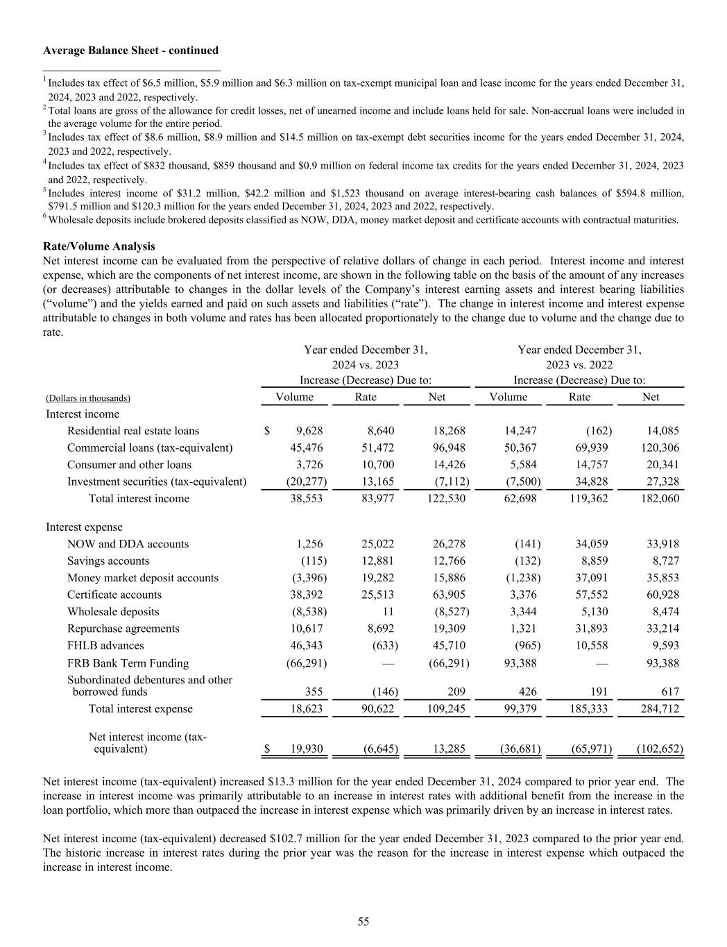 Average Balance Sheet - continued ______________________________ 1 Includes tax effect of $6.5 million, $5.9 million and $6.3 million on tax-exempt municipal loan and lease income for the years ended December 31, 2024, 2023 and 2022, respectively. 2 Total loans are gross of the allowance for credit losses, net of unearned income and include loans held for sale. Non-accrual loans were included in the average volume for the entire period. 3 Includes tax effect of $8.6 million, $8.9 million and $14.5 million on tax-exempt debt securities income for the years ended December 31, 2024, 2023 and 2022, respectively. 4 Includes tax effect of $832 thousand, $859 thousand and $0.9 million on federal income tax credits for the years ended December 31, 2024, 2023 and 2022, respectively. 5 Includes interest income of $31.2 million, $42.2 million and $1,523 thousand on average interest-bearing cash balances of $594.8 million, $791.5 million and $120.3 million for the years ended December 31, 2024, 2023 and 2022, respectively. 6 Wholesale deposits include brokered deposits classified as NOW, DDA, money market deposit and certificate accounts with contractual maturities. Rate/Volume Analysis Net interest income can be evaluated from the perspective of relative dollars of change in each period. Interest income and interest expense, which are the components of net interest income, are shown in the following table on the basis of the amount of any increases (or decreases) attributable to changes in the dollar levels of the Company’s interest earning assets and interest bearing liabilities (“volume”) and the yields earned and paid on such assets and liabilities (“rate”). The change in interest income and interest expense attributable to changes in both volume and rates has been allocated proportionately to the change due to volume and the change due to rate. Year ended December 31, Year ended December 31, 2024 vs. 2023 2023 vs. 2022 Increase (Decrease) Due to: Increase (Decrease) Due to: (Dollars in thousands) Volume Rate Net Volume Rate Net Interest income Residential real estate loans $ 9,628 8,640 18,268 14,247 (162) 14,085 Commercial loans (tax-equivalent) 45,476 51,472 96,948 50,367 69,939 120,306 Consumer and other loans 3,726 10,700 14,426 5,584 14,757 20,341 Investment securities (tax-equivalent) (20,277) 13,165 (7,112) (7,500) 34,828 27,328 Total interest income 38,553 83,977 122,530 62,698 119,362 182,060 Interest expense NOW and DDA accounts 1,256 25,022 26,278 (141) 34,059 33,918 Savings accounts (115) 12,881 12,766 (132) 8,859 8,727 Money market deposit accounts (3,396) 19,282 15,886 (1,238) 37,091 35,853 Certificate accounts 38,392 25,513 63,905 3,376 57,552 60,928 Wholesale deposits (8,538) 11 (8,527) 3,344 5,130 8,474 Repurchase agreements 10,617 8,692 19,309 1,321 31,893 33,214 FHLB advances 46,343 (633) 45,710 (965) 10,558 9,593 FRB Bank Term Funding (66,291) — (66,291) 93,388 — 93,388 Subordinated debentures and other borrowed funds 355 (146) 209 426 191 617 Total interest expense 18,623 90,622 109,245 99,379 185,333 284,712 Net interest income (tax- equivalent) $ 19,930 (6,645) 13,285 (36,681) (65,971) (102,652) Net interest income (tax-equivalent) increased $13.3 million for the year ended December 31, 2024 compared to prior year end. The increase in interest income was primarily attributable to an increase in interest rates with additional benefit from the increase in the loan portfolio, which more than outpaced the increase in interest expense which was primarily driven by an increase in interest rates. Net interest income (tax-equivalent) decreased $102.7 million for the year ended December 31, 2023 compared to the prior year end. The historic increase in interest rates during the prior year was the reason for the increase in interest expense which outpaced the increase in interest income. 55