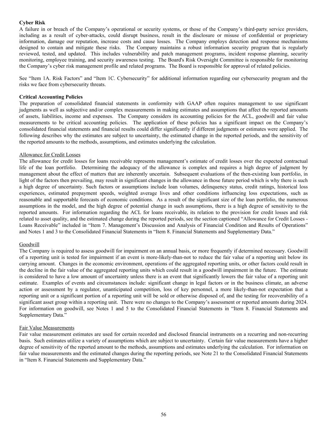 Cyber Risk A failure in or breach of the Company’s operational or security systems, or those of the Company’s third-party service providers, including as a result of cyber-attacks, could disrupt business, result in the disclosure or misuse of confidential or proprietary information, damage our reputation, increase costs and cause losses. The Company employs detection and response mechanisms designed to contain and mitigate these risks. The Company maintains a robust information security program that is regularly reviewed, tested, and updated. This includes vulnerability and patch management programs, incident response planning, security monitoring, employee training, and security awareness testing. The Board's Risk Oversight Committee is responsible for monitoring the Company’s cyber risk management profile and related programs. The Board is responsible for approval of related policies. See “Item 1A. Risk Factors” and “Item 1C. Cybersecurity” for additional information regarding our cybersecurity program and the risks we face from cybersecurity threats. Critical Accounting Policies The preparation of consolidated financial statements in conformity with GAAP often requires management to use significant judgments as well as subjective and/or complex measurements in making estimates and assumptions that affect the reported amounts of assets, liabilities, income and expenses. The Company considers its accounting policies for the ACL, goodwill and fair value measurements to be critical accounting policies. The application of these policies has a significant impact on the Company’s consolidated financial statements and financial results could differ significantly if different judgments or estimates were applied. The following describes why the estimates are subject to uncertainty, the estimated change in the reported periods, and the sensitivity of the reported amounts to the methods, assumptions, and estimates underlying the calculation. Allowance for Credit Losses The allowance for credit losses for loans receivable represents management’s estimate of credit losses over the expected contractual life of the loan portfolio. Determining the adequacy of the allowance is complex and requires a high degree of judgment by management about the effect of matters that are inherently uncertain. Subsequent evaluations of the then-existing loan portfolio, in light of the factors then prevailing, may result in significant changes in the allowance in those future period which is why there is such a high degree of uncertainty. Such factors or assumptions include loan volumes, delinquency status, credit ratings, historical loss experiences, estimated prepayment speeds, weighted average lives and other conditions influencing loss expectations, such as reasonable and supportable forecasts of economic conditions. As a result of the significant size of the loan portfolio, the numerous assumptions in the model, and the high degree of potential change in such assumptions, there is a high degree of sensitivity to the reported amounts. For information regarding the ACL for loans receivable, its relation to the provision for credit losses and risk related to asset quality, and the estimated change during the reported periods, see the section captioned “Allowance for Credit Losses - Loans Receivable” included in “Item 7. Management’s Discussion and Analysis of Financial Condition and Results of Operations” and Notes 1 and 3 to the Consolidated Financial Statements in “Item 8. Financial Statements and Supplementary Data.” Goodwill The Company is required to assess goodwill for impairment on an annual basis, or more frequently if determined necessary. Goodwill of a reporting unit is tested for impairment if an event is more-likely-than-not to reduce the fair value of a reporting unit below its carrying amount. Changes in the economic environment, operations of the aggregated reporting units, or other factors could result in the decline in the fair value of the aggregated reporting units which could result in a goodwill impairment in the future. The estimate is considered to have a low amount of uncertainty unless there is an event that significantly lowers the fair value of a reporting unit estimate. Examples of events and circumstances include: significant change in legal factors or in the business climate, an adverse action or assessment by a regulator, unanticipated competition, loss of key personnel, a more likely-than-not expectation that a reporting unit or a significant portion of a reporting unit will be sold or otherwise disposed of, and the testing for recoverability of a significant asset group within a reporting unit. There were no changes to the Company’s assessment or reported amounts during 2024. For information on goodwill, see Notes 1 and 5 to the Consolidated Financial Statements in “Item 8. Financial Statements and Supplementary Data.” Fair Value Measurements Fair value measurement estimates are used for certain recorded and disclosed financial instruments on a recurring and non-recurring basis. Such estimates utilize a variety of assumptions which are subject to uncertainty. Certain fair value measurements have a higher degree of sensitivity of the reported amount to the methods, assumptions and estimates underlying the calculation. For information on fair value measurements and the estimated changes during the reporting periods, see Note 21 to the Consolidated Financial Statements in “Item 8. Financial Statements and Supplementary Data.” 56