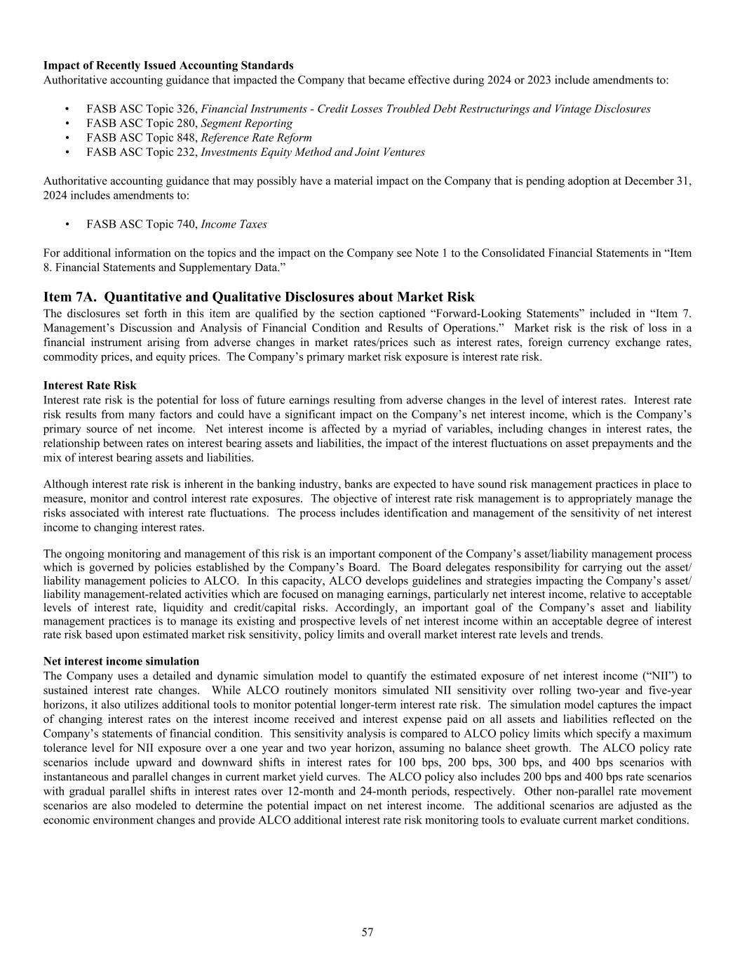 Impact of Recently Issued Accounting Standards Authoritative accounting guidance that impacted the Company that became effective during 2024 or 2023 include amendments to: • FASB ASC Topic 326, Financial Instruments - Credit Losses Troubled Debt Restructurings and Vintage Disclosures • FASB ASC Topic 280, Segment Reporting • FASB ASC Topic 848, Reference Rate Reform • FASB ASC Topic 232, Investments Equity Method and Joint Ventures Authoritative accounting guidance that may possibly have a material impact on the Company that is pending adoption at December 31, 2024 includes amendments to: • FASB ASC Topic 740, Income Taxes For additional information on the topics and the impact on the Company see Note 1 to the Consolidated Financial Statements in “Item 8. Financial Statements and Supplementary Data.” Item 7A. Quantitative and Qualitative Disclosures about Market Risk The disclosures set forth in this item are qualified by the section captioned “Forward-Looking Statements” included in “Item 7. Management’s Discussion and Analysis of Financial Condition and Results of Operations.” Market risk is the risk of loss in a financial instrument arising from adverse changes in market rates/prices such as interest rates, foreign currency exchange rates, commodity prices, and equity prices. The Company’s primary market risk exposure is interest rate risk. Interest Rate Risk Interest rate risk is the potential for loss of future earnings resulting from adverse changes in the level of interest rates. Interest rate risk results from many factors and could have a significant impact on the Company’s net interest income, which is the Company’s primary source of net income. Net interest income is affected by a myriad of variables, including changes in interest rates, the relationship between rates on interest bearing assets and liabilities, the impact of the interest fluctuations on asset prepayments and the mix of interest bearing assets and liabilities. Although interest rate risk is inherent in the banking industry, banks are expected to have sound risk management practices in place to measure, monitor and control interest rate exposures. The objective of interest rate risk management is to appropriately manage the risks associated with interest rate fluctuations. The process includes identification and management of the sensitivity of net interest income to changing interest rates. The ongoing monitoring and management of this risk is an important component of the Company’s asset/liability management process which is governed by policies established by the Company’s Board. The Board delegates responsibility for carrying out the asset/ liability management policies to ALCO. In this capacity, ALCO develops guidelines and strategies impacting the Company’s asset/ liability management-related activities which are focused on managing earnings, particularly net interest income, relative to acceptable levels of interest rate, liquidity and credit/capital risks. Accordingly, an important goal of the Company’s asset and liability management practices is to manage its existing and prospective levels of net interest income within an acceptable degree of interest rate risk based upon estimated market risk sensitivity, policy limits and overall market interest rate levels and trends. Net interest income simulation The Company uses a detailed and dynamic simulation model to quantify the estimated exposure of net interest income (“NII”) to sustained interest rate changes. While ALCO routinely monitors simulated NII sensitivity over rolling two-year and five-year horizons, it also utilizes additional tools to monitor potential longer-term interest rate risk. The simulation model captures the impact of changing interest rates on the interest income received and interest expense paid on all assets and liabilities reflected on the Company’s statements of financial condition. This sensitivity analysis is compared to ALCO policy limits which specify a maximum tolerance level for NII exposure over a one year and two year horizon, assuming no balance sheet growth. The ALCO policy rate scenarios include upward and downward shifts in interest rates for 100 bps, 200 bps, 300 bps, and 400 bps scenarios with instantaneous and parallel changes in current market yield curves. The ALCO policy also includes 200 bps and 400 bps rate scenarios with gradual parallel shifts in interest rates over 12-month and 24-month periods, respectively. Other non-parallel rate movement scenarios are also modeled to determine the potential impact on net interest income. The additional scenarios are adjusted as the economic environment changes and provide ALCO additional interest rate risk monitoring tools to evaluate current market conditions. 57