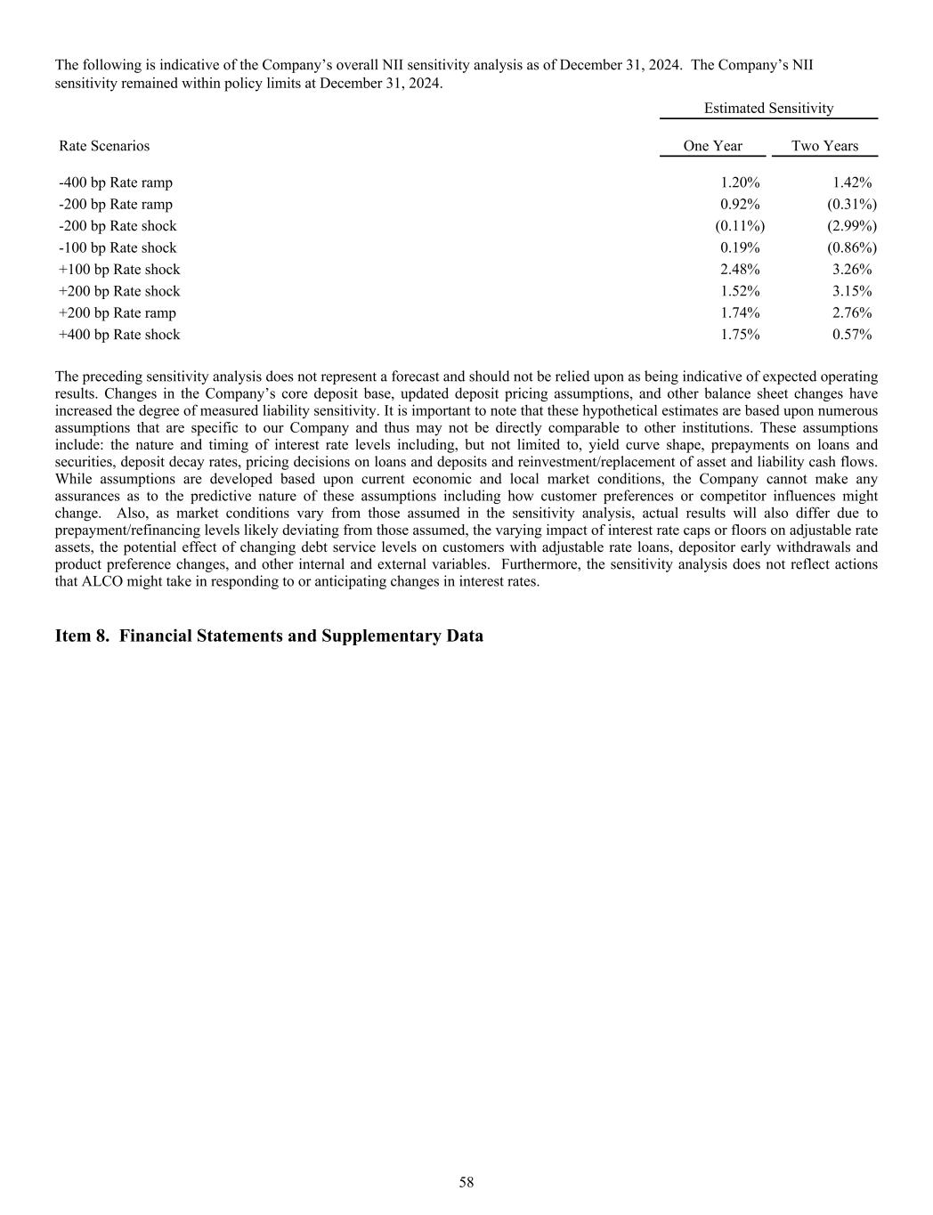 The following is indicative of the Company’s overall NII sensitivity analysis as of December 31, 2024. The Company’s NII sensitivity remained within policy limits at December 31, 2024. Estimated Sensitivity Rate Scenarios One Year Two Years -400 bp Rate ramp 1.20% 1.42% -200 bp Rate ramp 0.92% (0.31%) -200 bp Rate shock (0.11%) (2.99%) -100 bp Rate shock 0.19% (0.86%) +100 bp Rate shock 2.48% 3.26% +200 bp Rate shock 1.52% 3.15% +200 bp Rate ramp 1.74% 2.76% +400 bp Rate shock 1.75% 0.57% The preceding sensitivity analysis does not represent a forecast and should not be relied upon as being indicative of expected operating results. Changes in the Company’s core deposit base, updated deposit pricing assumptions, and other balance sheet changes have increased the degree of measured liability sensitivity. It is important to note that these hypothetical estimates are based upon numerous assumptions that are specific to our Company and thus may not be directly comparable to other institutions. These assumptions include: the nature and timing of interest rate levels including, but not limited to, yield curve shape, prepayments on loans and securities, deposit decay rates, pricing decisions on loans and deposits and reinvestment/replacement of asset and liability cash flows. While assumptions are developed based upon current economic and local market conditions, the Company cannot make any assurances as to the predictive nature of these assumptions including how customer preferences or competitor influences might change. Also, as market conditions vary from those assumed in the sensitivity analysis, actual results will also differ due to prepayment/refinancing levels likely deviating from those assumed, the varying impact of interest rate caps or floors on adjustable rate assets, the potential effect of changing debt service levels on customers with adjustable rate loans, depositor early withdrawals and product preference changes, and other internal and external variables. Furthermore, the sensitivity analysis does not reflect actions that ALCO might take in responding to or anticipating changes in interest rates. Item 8. Financial Statements and Supplementary Data 58