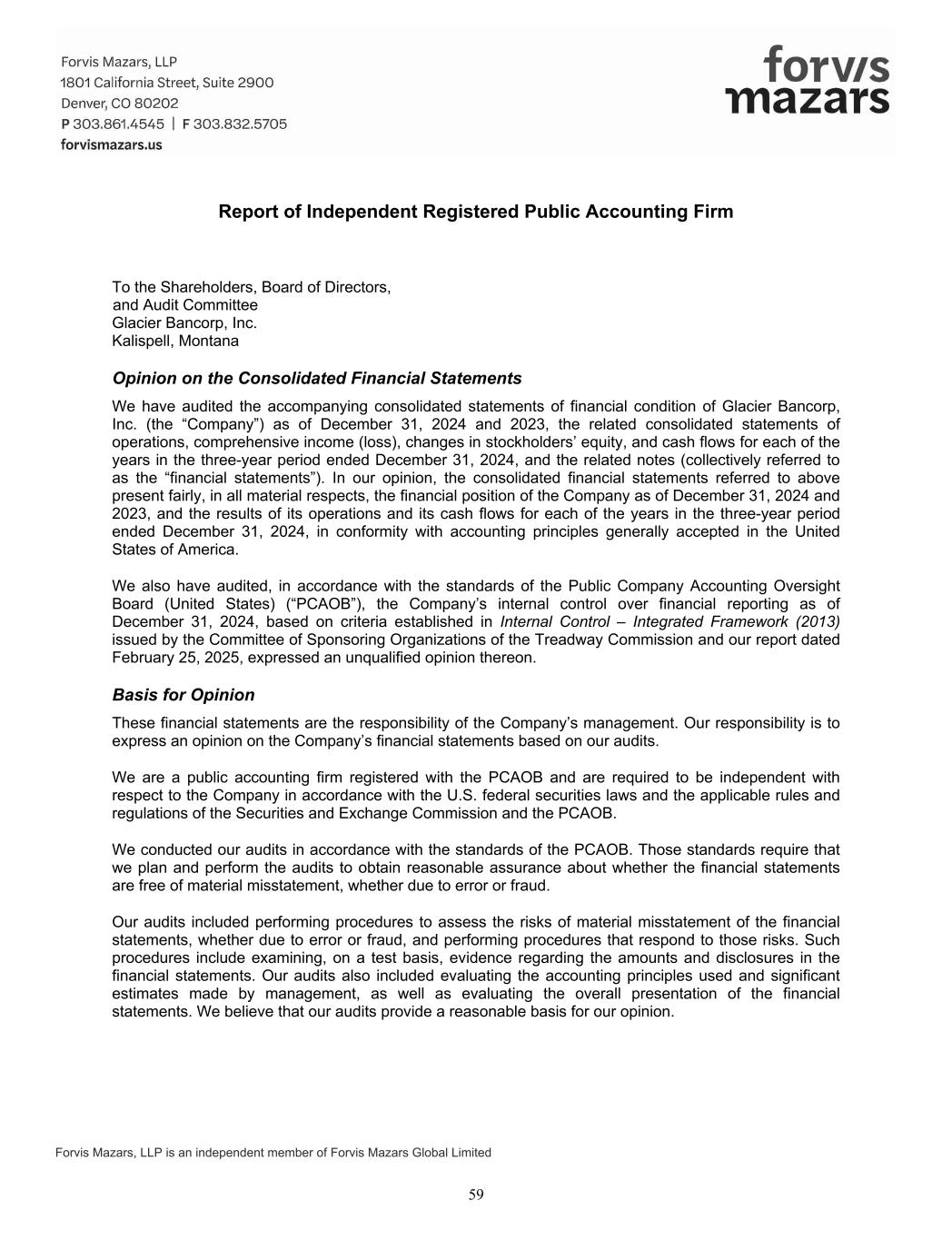 Forvis Mazars, LLP is an independent member of Forvis Mazars Global Limited Report of Independent Registered Public Accounting Firm To the Shareholders, Board of Directors, and Audit Committee Glacier Bancorp, Inc. Kalispell, Montana Opinion on the Consolidated Financial Statements We have audited the accompanying consolidated statements of financial condition of Glacier Bancorp, Inc. (the “Company”) as of December 31, 2024 and 2023, the related consolidated statements of operations, comprehensive income (loss), changes in stockholders’ equity, and cash flows for each of the years in the three-year period ended December 31, 2024, and the related notes (collectively referred to as the “financial statements”). In our opinion, the consolidated financial statements referred to above present fairly, in all material respects, the financial position of the Company as of December 31, 2024 and 2023, and the results of its operations and its cash flows for each of the years in the three-year period ended December 31, 2024, in conformity with accounting principles generally accepted in the United States of America. We also have audited, in accordance with the standards of the Public Company Accounting Oversight Board (United States) (“PCAOB”), the Company’s internal control over financial reporting as of December 31, 2024, based on criteria established in Internal Control – Integrated Framework (2013) issued by the Committee of Sponsoring Organizations of the Treadway Commission and our report dated February 25, 2025, expressed an unqualified opinion thereon. Basis for Opinion These financial statements are the responsibility of the Company’s management. Our responsibility is to express an opinion on the Company’s financial statements based on our audits. We are a public accounting firm registered with the PCAOB and are required to be independent with respect to the Company in accordance with the U.S. federal securities laws and the applicable rules and regulations of the Securities and Exchange Commission and the PCAOB. We conducted our audits in accordance with the standards of the PCAOB. Those standards require that we plan and perform the audits to obtain reasonable assurance about whether the financial statements are free of material misstatement, whether due to error or fraud. Our audits included performing procedures to assess the risks of material misstatement of the financial statements, whether due to error or fraud, and performing procedures that respond to those risks. Such procedures include examining, on a test basis, evidence regarding the amounts and disclosures in the financial statements. Our audits also included evaluating the accounting principles used and significant estimates made by management, as well as evaluating the overall presentation of the financial statements. We believe that our audits provide a reasonable basis for our opinion. 59
