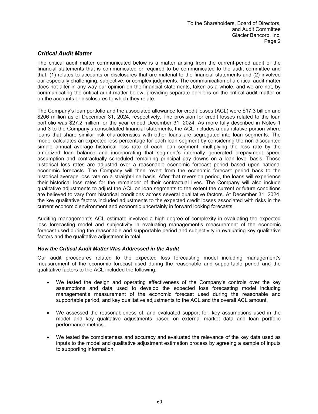 To the Shareholders, Board of Directors, and Audit Committee Glacier Bancorp, Inc. Page 2 Critical Audit Matter The critical audit matter communicated below is a matter arising from the current-period audit of the financial statements that is communicated or required to be communicated to the audit committee and that: (1) relates to accounts or disclosures that are material to the financial statements and (2) involved our especially challenging, subjective, or complex judgments. The communication of a critical audit matter does not alter in any way our opinion on the financial statements, taken as a whole, and we are not, by communicating the critical audit matter below, providing separate opinions on the critical audit matter or on the accounts or disclosures to which they relate. The Company’s loan portfolio and the associated allowance for credit losses (ACL) were $17.3 billion and $206 million as of December 31, 2024, respectively. The provision for credit losses related to the loan portfolio was $27.2 million for the year ended December 31, 2024. As more fully described in Notes 1 and 3 to the Company’s consolidated financial statements, the ACL includes a quantitative portion where loans that share similar risk characteristics with other loans are segregated into loan segments. The model calculates an expected loss percentage for each loan segment by considering the non-discounted simple annual average historical loss rate of each loan segment, multiplying the loss rate by the amortized loan balance and incorporating that segment’s internally generated prepayment speed assumption and contractually scheduled remaining principal pay downs on a loan level basis. Those historical loss rates are adjusted over a reasonable economic forecast period based upon national economic forecasts. The Company will then revert from the economic forecast period back to the historical average loss rate on a straight-line basis. After that reversion period, the loans will experience their historical loss rates for the remainder of their contractual lives. The Company will also include qualitative adjustments to adjust the ACL on loan segments to the extent the current or future conditions are believed to vary from historical conditions across several qualitative factors. At December 31, 2024, the key qualitative factors included adjustments to the expected credit losses associated with risks in the current economic environment and economic uncertainly in forward looking forecasts. Auditing management’s ACL estimate involved a high degree of complexity in evaluating the expected loss forecasting model and subjectivity in evaluating management’s measurement of the economic forecast used during the reasonable and supportable period and subjectivity in evaluating key qualitative factors and the qualitative adjustment in total. How the Critical Audit Matter Was Addressed in the Audit Our audit procedures related to the expected loss forecasting model including management’s measurement of the economic forecast used during the reasonable and supportable period and the qualitative factors to the ACL included the following: We tested the design and operating effectiveness of the Company’s controls over the key assumptions and data used to develop the expected loss forecasting model including management’s measurement of the economic forecast used during the reasonable and supportable period, and key qualitative adjustments to the ACL and the overall ACL amount. We assessed the reasonableness of, and evaluated support for, key assumptions used in the model and key qualitative adjustments based on external market data and loan portfolio performance metrics. We tested the completeness and accuracy and evaluated the relevance of the key data used as inputs to the model and qualitative adjustment estimation process by agreeing a sample of inputs to supporting information. 60