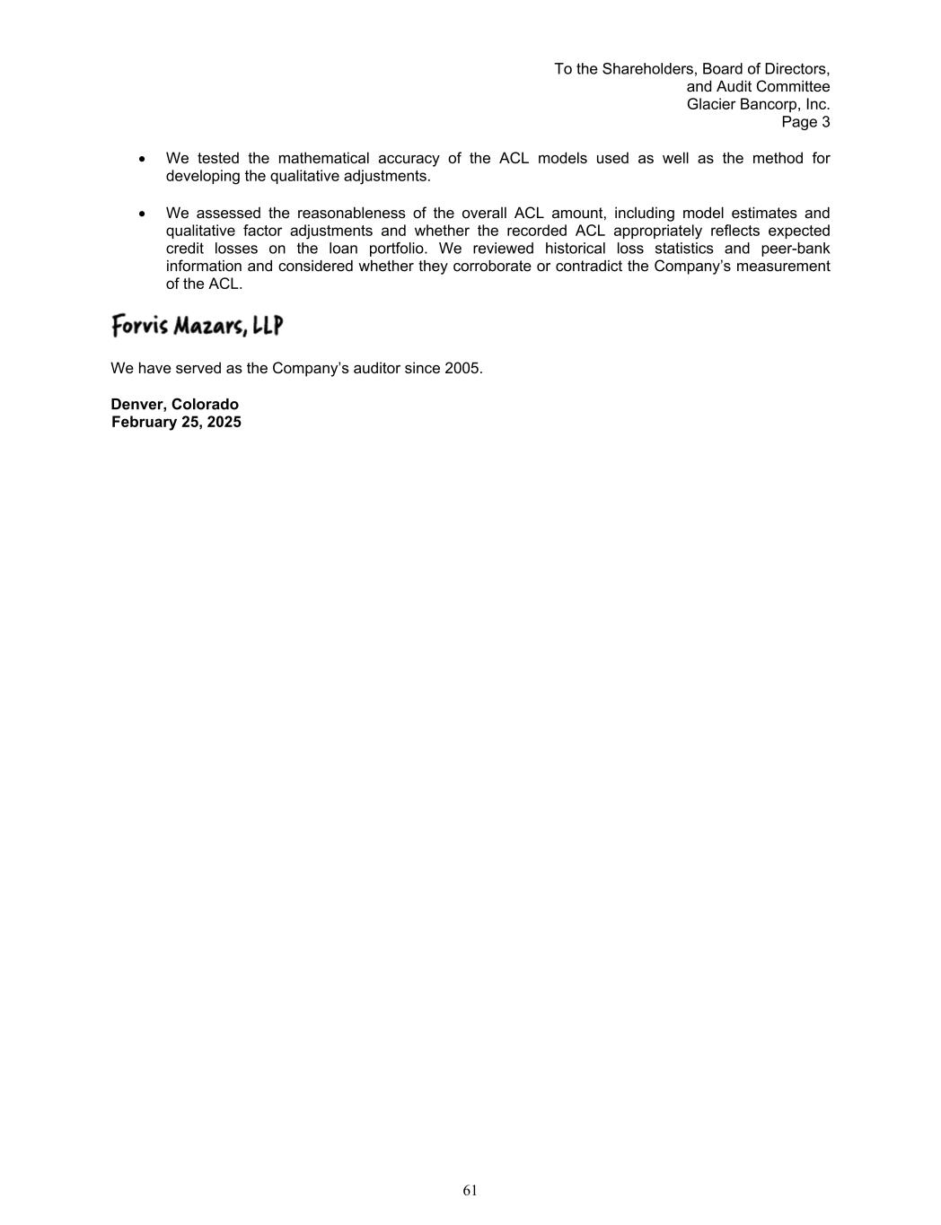 To the Shareholders, Board of Directors, and Audit Committee Glacier Bancorp, Inc. Page 3 We tested the mathematical accuracy of the ACL models used as well as the method for developing the qualitative adjustments. We assessed the reasonableness of the overall ACL amount, including model estimates and qualitative factor adjustments and whether the recorded ACL appropriately reflects expected credit losses on the loan portfolio. We reviewed historical loss statistics and peer-bank information and considered whether they corroborate or contradict the Company’s measurement of the ACL. We have served as the Company’s auditor since 2005. Denver, Colorado February 25, 2025 61