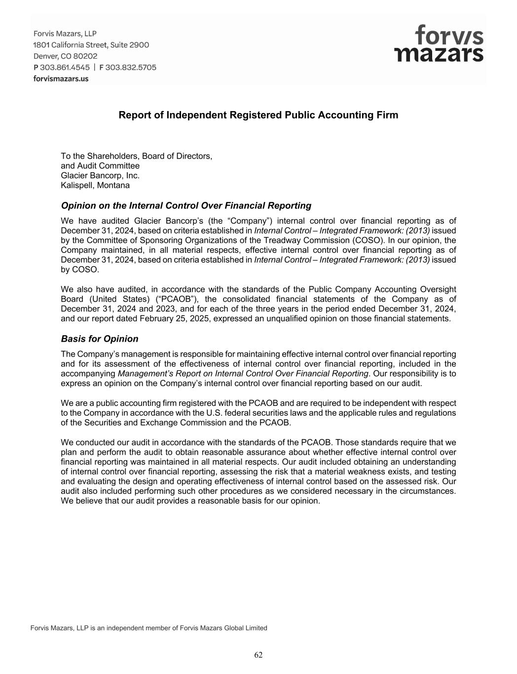 Forvis Mazars, LLP is an independent member of Forvis Mazars Global Limited Report of Independent Registered Public Accounting Firm To the Shareholders, Board of Directors, and Audit Committee Glacier Bancorp, Inc. Kalispell, Montana Opinion on the Internal Control Over Financial Reporting We have audited Glacier Bancorp’s (the “Company”) internal control over financial reporting as of December 31, 2024, based on criteria established in Internal Control – Integrated Framework: (2013) issued by the Committee of Sponsoring Organizations of the Treadway Commission (COSO). In our opinion, the Company maintained, in all material respects, effective internal control over financial reporting as of December 31, 2024, based on criteria established in Internal Control – Integrated Framework: (2013) issued by COSO. We also have audited, in accordance with the standards of the Public Company Accounting Oversight Board (United States) (“PCAOB”), the consolidated financial statements of the Company as of December 31, 2024 and 2023, and for each of the three years in the period ended December 31, 2024, and our report dated February 25, 2025, expressed an unqualified opinion on those financial statements. Basis for Opinion The Company’s management is responsible for maintaining effective internal control over financial reporting and for its assessment of the effectiveness of internal control over financial reporting, included in the accompanying Management’s Report on Internal Control Over Financial Reporting. Our responsibility is to express an opinion on the Company’s internal control over financial reporting based on our audit. We are a public accounting firm registered with the PCAOB and are required to be independent with respect to the Company in accordance with the U.S. federal securities laws and the applicable rules and regulations of the Securities and Exchange Commission and the PCAOB. We conducted our audit in accordance with the standards of the PCAOB. Those standards require that we plan and perform the audit to obtain reasonable assurance about whether effective internal control over financial reporting was maintained in all material respects. Our audit included obtaining an understanding of internal control over financial reporting, assessing the risk that a material weakness exists, and testing and evaluating the design and operating effectiveness of internal control based on the assessed risk. Our audit also included performing such other procedures as we considered necessary in the circumstances. We believe that our audit provides a reasonable basis for our opinion. 62