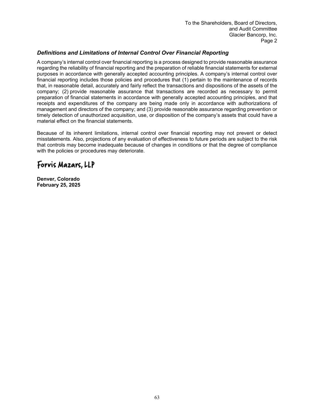 To the Shareholders, Board of Directors, and Audit Committee Glacier Bancorp, Inc. Page 2 Definitions and Limitations of Internal Control Over Financial Reporting A company’s internal control over financial reporting is a process designed to provide reasonable assurance regarding the reliability of financial reporting and the preparation of reliable financial statements for external purposes in accordance with generally accepted accounting principles. A company’s internal control over financial reporting includes those policies and procedures that (1) pertain to the maintenance of records that, in reasonable detail, accurately and fairly reflect the transactions and dispositions of the assets of the company; (2) provide reasonable assurance that transactions are recorded as necessary to permit preparation of financial statements in accordance with generally accepted accounting principles, and that receipts and expenditures of the company are being made only in accordance with authorizations of management and directors of the company; and (3) provide reasonable assurance regarding prevention or timely detection of unauthorized acquisition, use, or disposition of the company’s assets that could have a material effect on the financial statements. Because of its inherent limitations, internal control over financial reporting may not prevent or detect misstatements. Also, projections of any evaluation of effectiveness to future periods are subject to the risk that controls may become inadequate because of changes in conditions or that the degree of compliance with the policies or procedures may deteriorate. Denver, Colorado February 25, 2025 63