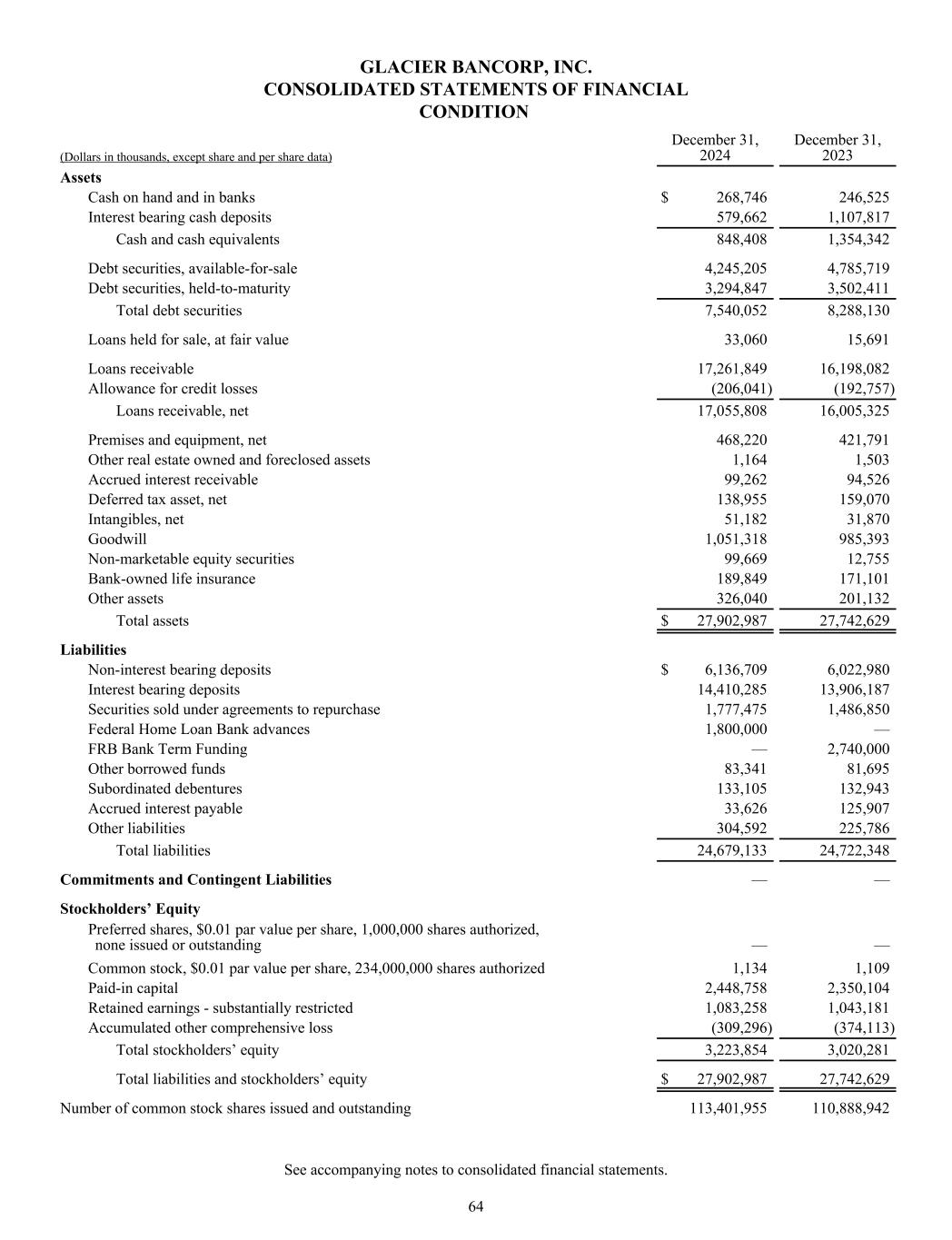 GLACIER BANCORP, INC. CONSOLIDATED STATEMENTS OF FINANCIAL CONDITION (Dollars in thousands, except share and per share data) December 31, 2024 December 31, 2023 Assets Cash on hand and in banks $ 268,746 246,525 Interest bearing cash deposits 579,662 1,107,817 Cash and cash equivalents 848,408 1,354,342 Debt securities, available-for-sale 4,245,205 4,785,719 Debt securities, held-to-maturity 3,294,847 3,502,411 Total debt securities 7,540,052 8,288,130 Loans held for sale, at fair value 33,060 15,691 Loans receivable 17,261,849 16,198,082 Allowance for credit losses (206,041) (192,757) Loans receivable, net 17,055,808 16,005,325 Premises and equipment, net 468,220 421,791 Other real estate owned and foreclosed assets 1,164 1,503 Accrued interest receivable 99,262 94,526 Deferred tax asset, net 138,955 159,070 Intangibles, net 51,182 31,870 Goodwill 1,051,318 985,393 Non-marketable equity securities 99,669 12,755 Bank-owned life insurance 189,849 171,101 Other assets 326,040 201,132 Total assets $ 27,902,987 27,742,629 Liabilities Non-interest bearing deposits $ 6,136,709 6,022,980 Interest bearing deposits 14,410,285 13,906,187 Securities sold under agreements to repurchase 1,777,475 1,486,850 Federal Home Loan Bank advances 1,800,000 — FRB Bank Term Funding — 2,740,000 Other borrowed funds 83,341 81,695 Subordinated debentures 133,105 132,943 Accrued interest payable 33,626 125,907 Other liabilities 304,592 225,786 Total liabilities 24,679,133 24,722,348 Commitments and Contingent Liabilities — — Stockholders’ Equity Preferred shares, $0.01 par value per share, 1,000,000 shares authorized, none issued or outstanding — — Common stock, $0.01 par value per share, 234,000,000 shares authorized 1,134 1,109 Paid-in capital 2,448,758 2,350,104 Retained earnings - substantially restricted 1,083,258 1,043,181 Accumulated other comprehensive loss (309,296) (374,113) Total stockholders’ equity 3,223,854 3,020,281 Total liabilities and stockholders’ equity $ 27,902,987 27,742,629 Number of common stock shares issued and outstanding 113,401,955 110,888,942 See accompanying notes to consolidated financial statements. 64