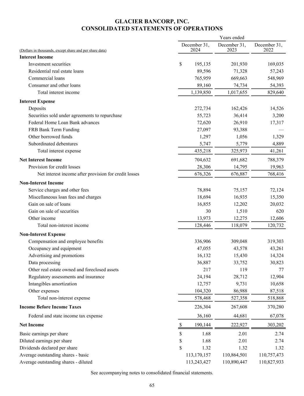 GLACIER BANCORP, INC. CONSOLIDATED STATEMENTS OF OPERATIONS Years ended (Dollars in thousands, except share and per share data) December 31, 2024 December 31, 2023 December 31, 2022 Interest Income Investment securities $ 195,135 201,930 169,035 Residential real estate loans 89,596 71,328 57,243 Commercial loans 765,959 669,663 548,969 Consumer and other loans 89,160 74,734 54,393 Total interest income 1,139,850 1,017,655 829,640 Interest Expense Deposits 272,734 162,426 14,526 Securities sold under agreements to repurchase 55,723 36,414 3,200 Federal Home Loan Bank advances 72,620 26,910 17,317 FRB Bank Term Funding 27,097 93,388 — Other borrowed funds 1,297 1,056 1,329 Subordinated debentures 5,747 5,779 4,889 Total interest expense 435,218 325,973 41,261 Net Interest Income 704,632 691,682 788,379 Provision for credit losses 28,306 14,795 19,963 Net interest income after provision for credit losses 676,326 676,887 768,416 Non-Interest Income Service charges and other fees 78,894 75,157 72,124 Miscellaneous loan fees and charges 18,694 16,935 15,350 Gain on sale of loans 16,855 12,202 20,032 Gain on sale of securities 30 1,510 620 Other income 13,973 12,275 12,606 Total non-interest income 128,446 118,079 120,732 Non-Interest Expense Compensation and employee benefits 336,906 309,048 319,303 Occupancy and equipment 47,055 43,578 43,261 Advertising and promotions 16,132 15,430 14,324 Data processing 36,887 33,752 30,823 Other real estate owned and foreclosed assets 217 119 77 Regulatory assessments and insurance 24,194 28,712 12,904 Intangibles amortization 12,757 9,731 10,658 Other expenses 104,320 86,988 87,518 Total non-interest expense 578,468 527,358 518,868 Income Before Income Taxes 226,304 267,608 370,280 Federal and state income tax expense 36,160 44,681 67,078 Net Income $ 190,144 222,927 303,202 Basic earnings per share $ 1.68 2.01 2.74 Diluted earnings per share $ 1.68 2.01 2.74 Dividends declared per share $ 1.32 1.32 1.32 Average outstanding shares - basic 113,170,157 110,864,501 110,757,473 Average outstanding shares - diluted 113,243,427 110,890,447 110,827,933 See accompanying notes to consolidated financial statements. 65
