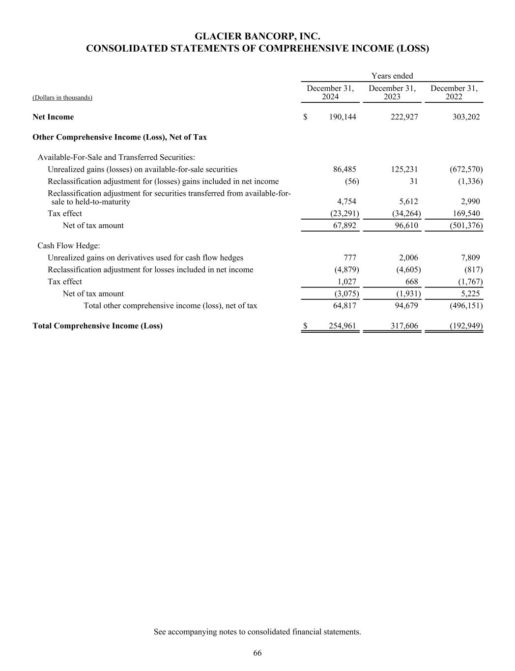 GLACIER BANCORP, INC. CONSOLIDATED STATEMENTS OF COMPREHENSIVE INCOME (LOSS) Years ended (Dollars in thousands) December 31, 2024 December 31, 2023 December 31, 2022 Net Income $ 190,144 222,927 303,202 Other Comprehensive Income (Loss), Net of Tax Available-For-Sale and Transferred Securities: Unrealized gains (losses) on available-for-sale securities 86,485 125,231 (672,570) Reclassification adjustment for (losses) gains included in net income (56) 31 (1,336) Reclassification adjustment for securities transferred from available-for- sale to held-to-maturity 4,754 5,612 2,990 Tax effect (23,291) (34,264) 169,540 Net of tax amount 67,892 96,610 (501,376) Cash Flow Hedge: Unrealized gains on derivatives used for cash flow hedges 777 2,006 7,809 Reclassification adjustment for losses included in net income (4,879) (4,605) (817) Tax effect 1,027 668 (1,767) Net of tax amount (3,075) (1,931) 5,225 Total other comprehensive income (loss), net of tax 64,817 94,679 (496,151) Total Comprehensive Income (Loss) $ 254,961 317,606 (192,949) See accompanying notes to consolidated financial statements. 66