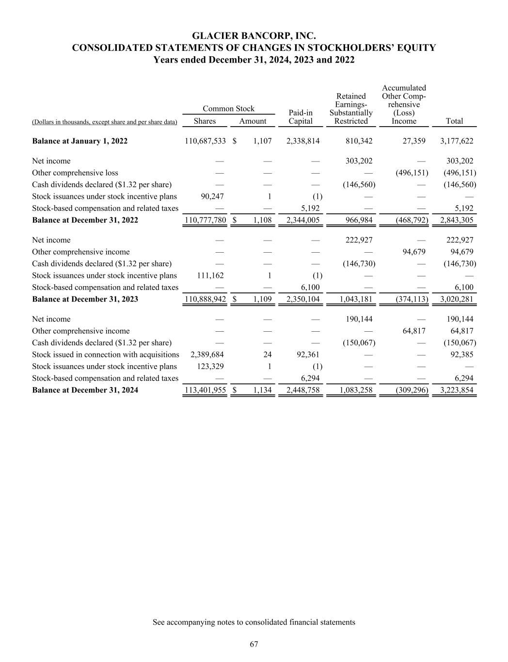 GLACIER BANCORP, INC. CONSOLIDATED STATEMENTS OF CHANGES IN STOCKHOLDERS’ EQUITY Years ended December 31, 2024, 2023 and 2022 (Dollars in thousands, except share and per share data) Common Stock Paid-in Capital Retained Earnings- Substantially Restricted Accumulated Other Comp- rehensive (Loss) Income Shares Amount Total Balance at January 1, 2022 110,687,533 $ 1,107 2,338,814 810,342 27,359 3,177,622 Net income — — — 303,202 — 303,202 Other comprehensive loss — — — — (496,151) (496,151) Cash dividends declared ($1.32 per share) — — — (146,560) — (146,560) Stock issuances under stock incentive plans 90,247 1 (1) — — — Stock-based compensation and related taxes — — 5,192 — — 5,192 Balance at December 31, 2022 110,777,780 $ 1,108 2,344,005 966,984 (468,792) 2,843,305 Net income — — — 222,927 — 222,927 Other comprehensive income — — — — 94,679 94,679 Cash dividends declared ($1.32 per share) — — — (146,730) — (146,730) Stock issuances under stock incentive plans 111,162 1 (1) — — — Stock-based compensation and related taxes — — 6,100 — — 6,100 Balance at December 31, 2023 110,888,942 $ 1,109 2,350,104 1,043,181 (374,113) 3,020,281 Net income — — — 190,144 — 190,144 Other comprehensive income — — — — 64,817 64,817 Cash dividends declared ($1.32 per share) — — — (150,067) — (150,067) Stock issued in connection with acquisitions 2,389,684 24 92,361 — — 92,385 Stock issuances under stock incentive plans 123,329 1 (1) — — — Stock-based compensation and related taxes — — 6,294 — — 6,294 Balance at December 31, 2024 113,401,955 $ 1,134 2,448,758 1,083,258 (309,296) 3,223,854 See accompanying notes to consolidated financial statements 67