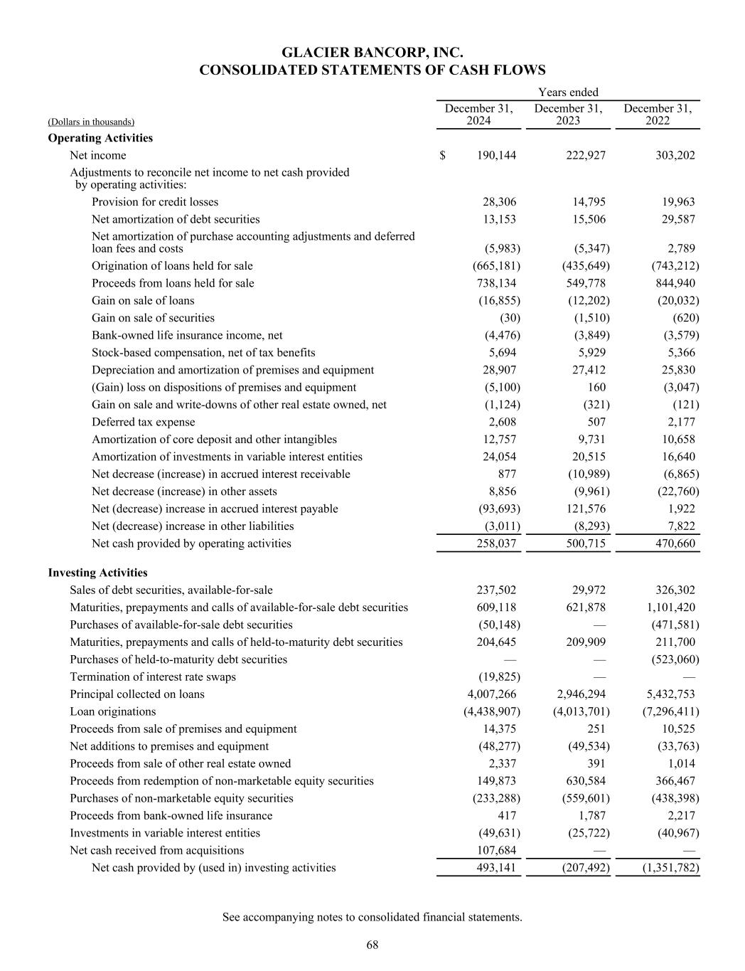 GLACIER BANCORP, INC. CONSOLIDATED STATEMENTS OF CASH FLOWS Years ended (Dollars in thousands) December 31, 2024 December 31, 2023 December 31, 2022 Operating Activities Net income $ 190,144 222,927 303,202 Adjustments to reconcile net income to net cash provided by operating activities: Provision for credit losses 28,306 14,795 19,963 Net amortization of debt securities 13,153 15,506 29,587 Net amortization of purchase accounting adjustments and deferred loan fees and costs (5,983) (5,347) 2,789 Origination of loans held for sale (665,181) (435,649) (743,212) Proceeds from loans held for sale 738,134 549,778 844,940 Gain on sale of loans (16,855) (12,202) (20,032) Gain on sale of securities (30) (1,510) (620) Bank-owned life insurance income, net (4,476) (3,849) (3,579) Stock-based compensation, net of tax benefits 5,694 5,929 5,366 Depreciation and amortization of premises and equipment 28,907 27,412 25,830 (Gain) loss on dispositions of premises and equipment (5,100) 160 (3,047) Gain on sale and write-downs of other real estate owned, net (1,124) (321) (121) Deferred tax expense 2,608 507 2,177 Amortization of core deposit and other intangibles 12,757 9,731 10,658 Amortization of investments in variable interest entities 24,054 20,515 16,640 Net decrease (increase) in accrued interest receivable 877 (10,989) (6,865) Net decrease (increase) in other assets 8,856 (9,961) (22,760) Net (decrease) increase in accrued interest payable (93,693) 121,576 1,922 Net (decrease) increase in other liabilities (3,011) (8,293) 7,822 Net cash provided by operating activities 258,037 500,715 470,660 Investing Activities Sales of debt securities, available-for-sale 237,502 29,972 326,302 Maturities, prepayments and calls of available-for-sale debt securities 609,118 621,878 1,101,420 Purchases of available-for-sale debt securities (50,148) — (471,581) Maturities, prepayments and calls of held-to-maturity debt securities 204,645 209,909 211,700 Purchases of held-to-maturity debt securities — — (523,060) Termination of interest rate swaps (19,825) — — Principal collected on loans 4,007,266 2,946,294 5,432,753 Loan originations (4,438,907) (4,013,701) (7,296,411) Proceeds from sale of premises and equipment 14,375 251 10,525 Net additions to premises and equipment (48,277) (49,534) (33,763) Proceeds from sale of other real estate owned 2,337 391 1,014 Proceeds from redemption of non-marketable equity securities 149,873 630,584 366,467 Purchases of non-marketable equity securities (233,288) (559,601) (438,398) Proceeds from bank-owned life insurance 417 1,787 2,217 Investments in variable interest entities (49,631) (25,722) (40,967) Net cash received from acquisitions 107,684 — — Net cash provided by (used in) investing activities 493,141 (207,492) (1,351,782) See accompanying notes to consolidated financial statements. 68
