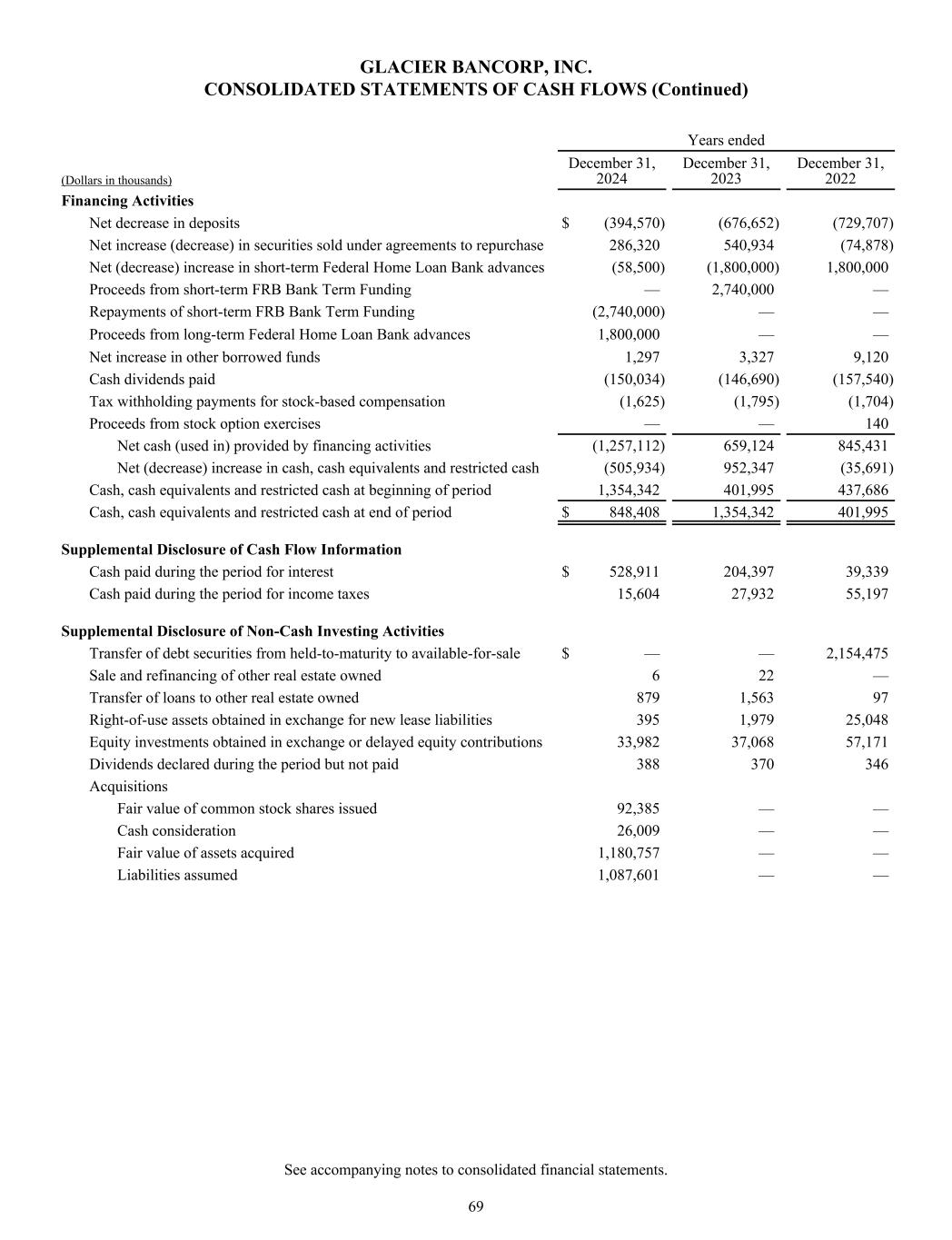 GLACIER BANCORP, INC. CONSOLIDATED STATEMENTS OF CASH FLOWS (Continued) Years ended (Dollars in thousands) December 31, 2024 December 31, 2023 December 31, 2022 Financing Activities Net decrease in deposits $ (394,570) (676,652) (729,707) Net increase (decrease) in securities sold under agreements to repurchase 286,320 540,934 (74,878) Net (decrease) increase in short-term Federal Home Loan Bank advances (58,500) (1,800,000) 1,800,000 Proceeds from short-term FRB Bank Term Funding — 2,740,000 — Repayments of short-term FRB Bank Term Funding (2,740,000) — — Proceeds from long-term Federal Home Loan Bank advances 1,800,000 — — Net increase in other borrowed funds 1,297 3,327 9,120 Cash dividends paid (150,034) (146,690) (157,540) Tax withholding payments for stock-based compensation (1,625) (1,795) (1,704) Proceeds from stock option exercises — — 140 Net cash (used in) provided by financing activities (1,257,112) 659,124 845,431 Net (decrease) increase in cash, cash equivalents and restricted cash (505,934) 952,347 (35,691) Cash, cash equivalents and restricted cash at beginning of period 1,354,342 401,995 437,686 Cash, cash equivalents and restricted cash at end of period $ 848,408 1,354,342 401,995 Supplemental Disclosure of Cash Flow Information Cash paid during the period for interest $ 528,911 204,397 39,339 Cash paid during the period for income taxes 15,604 27,932 55,197 Supplemental Disclosure of Non-Cash Investing Activities Transfer of debt securities from held-to-maturity to available-for-sale $ — — 2,154,475 Sale and refinancing of other real estate owned 6 22 — Transfer of loans to other real estate owned 879 1,563 97 Right-of-use assets obtained in exchange for new lease liabilities 395 1,979 25,048 Equity investments obtained in exchange or delayed equity contributions 33,982 37,068 57,171 Dividends declared during the period but not paid 388 370 346 Acquisitions Fair value of common stock shares issued 92,385 — — Cash consideration 26,009 — — Fair value of assets acquired 1,180,757 — — Liabilities assumed 1,087,601 — — See accompanying notes to consolidated financial statements. 69