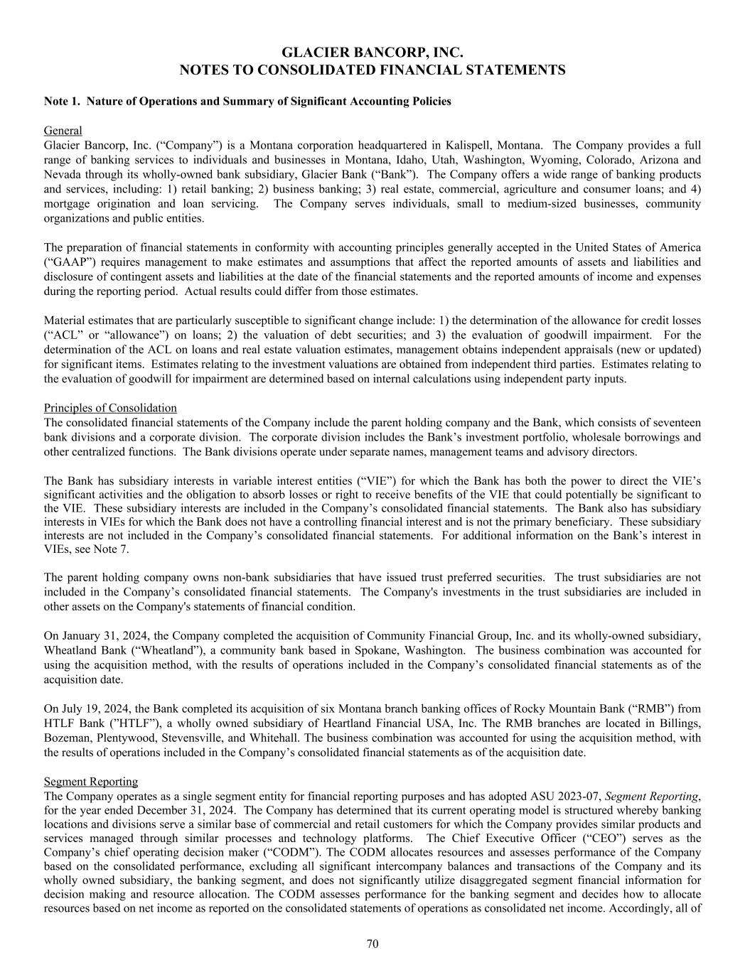 GLACIER BANCORP, INC. NOTES TO CONSOLIDATED FINANCIAL STATEMENTS Note 1. Nature of Operations and Summary of Significant Accounting Policies General Glacier Bancorp, Inc. (“Company”) is a Montana corporation headquartered in Kalispell, Montana. The Company provides a full range of banking services to individuals and businesses in Montana, Idaho, Utah, Washington, Wyoming, Colorado, Arizona and Nevada through its wholly-owned bank subsidiary, Glacier Bank (“Bank”). The Company offers a wide range of banking products and services, including: 1) retail banking; 2) business banking; 3) real estate, commercial, agriculture and consumer loans; and 4) mortgage origination and loan servicing. The Company serves individuals, small to medium-sized businesses, community organizations and public entities. The preparation of financial statements in conformity with accounting principles generally accepted in the United States of America (“GAAP”) requires management to make estimates and assumptions that affect the reported amounts of assets and liabilities and disclosure of contingent assets and liabilities at the date of the financial statements and the reported amounts of income and expenses during the reporting period. Actual results could differ from those estimates. Material estimates that are particularly susceptible to significant change include: 1) the determination of the allowance for credit losses (“ACL” or “allowance”) on loans; 2) the valuation of debt securities; and 3) the evaluation of goodwill impairment. For the determination of the ACL on loans and real estate valuation estimates, management obtains independent appraisals (new or updated) for significant items. Estimates relating to the investment valuations are obtained from independent third parties. Estimates relating to the evaluation of goodwill for impairment are determined based on internal calculations using independent party inputs. Principles of Consolidation The consolidated financial statements of the Company include the parent holding company and the Bank, which consists of seventeen bank divisions and a corporate division. The corporate division includes the Bank’s investment portfolio, wholesale borrowings and other centralized functions. The Bank divisions operate under separate names, management teams and advisory directors. The Bank has subsidiary interests in variable interest entities (“VIE”) for which the Bank has both the power to direct the VIE’s significant activities and the obligation to absorb losses or right to receive benefits of the VIE that could potentially be significant to the VIE. These subsidiary interests are included in the Company’s consolidated financial statements. The Bank also has subsidiary interests in VIEs for which the Bank does not have a controlling financial interest and is not the primary beneficiary. These subsidiary interests are not included in the Company’s consolidated financial statements. For additional information on the Bank’s interest in VIEs, see Note 7. The parent holding company owns non-bank subsidiaries that have issued trust preferred securities. The trust subsidiaries are not included in the Company’s consolidated financial statements. The Company's investments in the trust subsidiaries are included in other assets on the Company's statements of financial condition. On January 31, 2024, the Company completed the acquisition of Community Financial Group, Inc. and its wholly-owned subsidiary, Wheatland Bank (“Wheatland”), a community bank based in Spokane, Washington. The business combination was accounted for using the acquisition method, with the results of operations included in the Company’s consolidated financial statements as of the acquisition date. On July 19, 2024, the Bank completed its acquisition of six Montana branch banking offices of Rocky Mountain Bank (“RMB”) from HTLF Bank (”HTLF”), a wholly owned subsidiary of Heartland Financial USA, Inc. The RMB branches are located in Billings, Bozeman, Plentywood, Stevensville, and Whitehall. The business combination was accounted for using the acquisition method, with the results of operations included in the Company’s consolidated financial statements as of the acquisition date. Segment Reporting The Company operates as a single segment entity for financial reporting purposes and has adopted ASU 2023-07, Segment Reporting, for the year ended December 31, 2024. The Company has determined that its current operating model is structured whereby banking locations and divisions serve a similar base of commercial and retail customers for which the Company provides similar products and services managed through similar processes and technology platforms. The Chief Executive Officer (“CEO”) serves as the Company’s chief operating decision maker (“CODM”). The CODM allocates resources and assesses performance of the Company based on the consolidated performance, excluding all significant intercompany balances and transactions of the Company and its wholly owned subsidiary, the banking segment, and does not significantly utilize disaggregated segment financial information for decision making and resource allocation. The CODM assesses performance for the banking segment and decides how to allocate resources based on net income as reported on the consolidated statements of operations as consolidated net income. Accordingly, all of 70