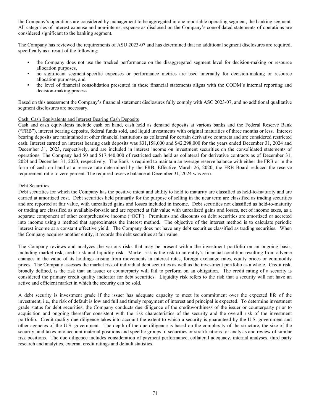 the Company’s operations are considered by management to be aggregated in one reportable operating segment, the banking segment. All categories of interest expense and non-interest expense as disclosed on the Company’s consolidated statements of operations are considered significant to the banking segment. The Company has reviewed the requirements of ASU 2023-07 and has determined that no additional segment disclosures are required, specifically as a result of the following; ▪ the Company does not use the tracked performance on the disaggregated segment level for decision-making or resource allocation purposes, ▪ no significant segment-specific expenses or performance metrics are used internally for decision-making or resource allocation purposes, and ▪ the level of financial consolidation presented in these financial statements aligns with the CODM’s internal reporting and decision-making process Based on this assessment the Company’s financial statement disclosures fully comply with ASC 2023-07, and no additional qualitative segment disclosures are necessary. Cash, Cash Equivalents and Interest Bearing Cash Deposits Cash and cash equivalents include cash on hand, cash held as demand deposits at various banks and the Federal Reserve Bank (“FRB”), interest bearing deposits, federal funds sold, and liquid investments with original maturities of three months or less. Interest bearing deposits are maintained at other financial institutions as collateral for certain derivative contracts and are considered restricted cash. Interest earned on interest bearing cash deposits was $31,158,000 and $42,298,000 for the years ended December 31, 2024 and December 31, 2023, respectively, and are included in interest income on investment securities on the consolidated statements of operations. The Company had $0 and $17,440,000 of restricted cash held as collateral for derivative contracts as of December 31, 2024 and December 31, 2023, respectively. The Bank is required to maintain an average reserve balance with either the FRB or in the form of cash on hand at a reserve rate determined by the FRB. Effective March 26, 2020, the FRB Board reduced the reserve requirement ratio to zero percent. The required reserve balance at December 31, 2024 was zero. Debt Securities Debt securities for which the Company has the positive intent and ability to hold to maturity are classified as held-to-maturity and are carried at amortized cost. Debt securities held primarily for the purpose of selling in the near term are classified as trading securities and are reported at fair value, with unrealized gains and losses included in income. Debt securities not classified as held-to-maturity or trading are classified as available-for-sale and are reported at fair value with unrealized gains and losses, net of income taxes, as a separate component of other comprehensive income (“OCI”). Premiums and discounts on debt securities are amortized or accreted into income using a method that approximates the interest method. The objective of the interest method is to calculate periodic interest income at a constant effective yield. The Company does not have any debt securities classified as trading securities. When the Company acquires another entity, it records the debt securities at fair value. The Company reviews and analyzes the various risks that may be present within the investment portfolio on an ongoing basis, including market risk, credit risk and liquidity risk. Market risk is the risk to an entity’s financial condition resulting from adverse changes in the value of its holdings arising from movements in interest rates, foreign exchange rates, equity prices or commodity prices. The Company assesses the market risk of individual debt securities as well as the investment portfolio as a whole. Credit risk, broadly defined, is the risk that an issuer or counterparty will fail to perform on an obligation. The credit rating of a security is considered the primary credit quality indicator for debt securities. Liquidity risk refers to the risk that a security will not have an active and efficient market in which the security can be sold. A debt security is investment grade if the issuer has adequate capacity to meet its commitment over the expected life of the investment, i.e., the risk of default is low and full and timely repayment of interest and principal is expected. To determine investment grade status for debt securities, the Company conducts due diligence of the creditworthiness of the issuer or counterparty prior to acquisition and ongoing thereafter consistent with the risk characteristics of the security and the overall risk of the investment portfolio. Credit quality due diligence takes into account the extent to which a security is guaranteed by the U.S. government and other agencies of the U.S. government. The depth of the due diligence is based on the complexity of the structure, the size of the security, and takes into account material positions and specific groups of securities or stratifications for analysis and review of similar risk positions. The due diligence includes consideration of payment performance, collateral adequacy, internal analyses, third party research and analytics, external credit ratings and default statistics. 71