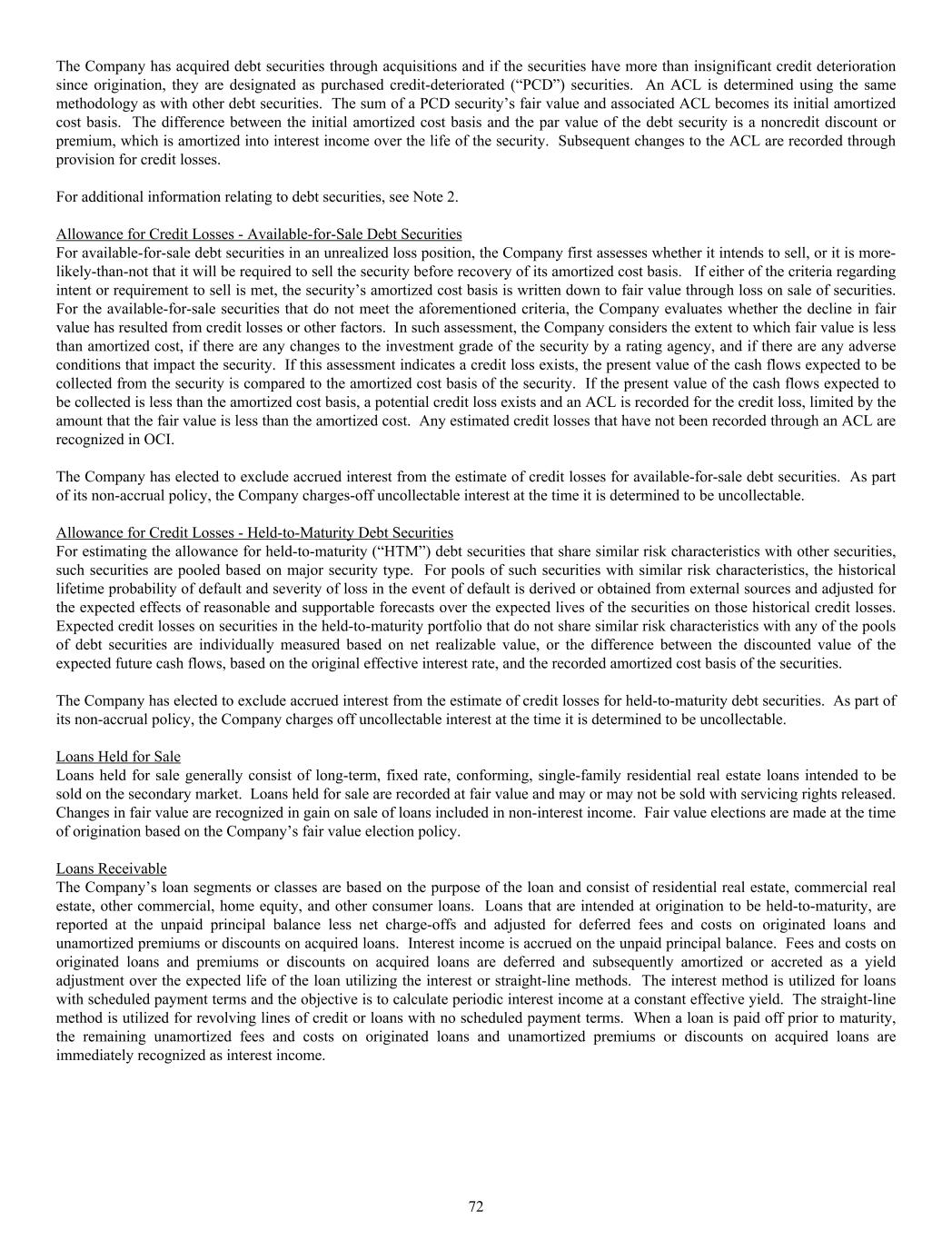 The Company has acquired debt securities through acquisitions and if the securities have more than insignificant credit deterioration since origination, they are designated as purchased credit-deteriorated (“PCD”) securities. An ACL is determined using the same methodology as with other debt securities. The sum of a PCD security’s fair value and associated ACL becomes its initial amortized cost basis. The difference between the initial amortized cost basis and the par value of the debt security is a noncredit discount or premium, which is amortized into interest income over the life of the security. Subsequent changes to the ACL are recorded through provision for credit losses. For additional information relating to debt securities, see Note 2. Allowance for Credit Losses - Available-for-Sale Debt Securities For available-for-sale debt securities in an unrealized loss position, the Company first assesses whether it intends to sell, or it is more- likely-than-not that it will be required to sell the security before recovery of its amortized cost basis. If either of the criteria regarding intent or requirement to sell is met, the security’s amortized cost basis is written down to fair value through loss on sale of securities. For the available-for-sale securities that do not meet the aforementioned criteria, the Company evaluates whether the decline in fair value has resulted from credit losses or other factors. In such assessment, the Company considers the extent to which fair value is less than amortized cost, if there are any changes to the investment grade of the security by a rating agency, and if there are any adverse conditions that impact the security. If this assessment indicates a credit loss exists, the present value of the cash flows expected to be collected from the security is compared to the amortized cost basis of the security. If the present value of the cash flows expected to be collected is less than the amortized cost basis, a potential credit loss exists and an ACL is recorded for the credit loss, limited by the amount that the fair value is less than the amortized cost. Any estimated credit losses that have not been recorded through an ACL are recognized in OCI. The Company has elected to exclude accrued interest from the estimate of credit losses for available-for-sale debt securities. As part of its non-accrual policy, the Company charges-off uncollectable interest at the time it is determined to be uncollectable. Allowance for Credit Losses - Held-to-Maturity Debt Securities For estimating the allowance for held-to-maturity (“HTM”) debt securities that share similar risk characteristics with other securities, such securities are pooled based on major security type. For pools of such securities with similar risk characteristics, the historical lifetime probability of default and severity of loss in the event of default is derived or obtained from external sources and adjusted for the expected effects of reasonable and supportable forecasts over the expected lives of the securities on those historical credit losses. Expected credit losses on securities in the held-to-maturity portfolio that do not share similar risk characteristics with any of the pools of debt securities are individually measured based on net realizable value, or the difference between the discounted value of the expected future cash flows, based on the original effective interest rate, and the recorded amortized cost basis of the securities. The Company has elected to exclude accrued interest from the estimate of credit losses for held-to-maturity debt securities. As part of its non-accrual policy, the Company charges off uncollectable interest at the time it is determined to be uncollectable. Loans Held for Sale Loans held for sale generally consist of long-term, fixed rate, conforming, single-family residential real estate loans intended to be sold on the secondary market. Loans held for sale are recorded at fair value and may or may not be sold with servicing rights released. Changes in fair value are recognized in gain on sale of loans included in non-interest income. Fair value elections are made at the time of origination based on the Company’s fair value election policy. Loans Receivable The Company’s loan segments or classes are based on the purpose of the loan and consist of residential real estate, commercial real estate, other commercial, home equity, and other consumer loans. Loans that are intended at origination to be held-to-maturity, are reported at the unpaid principal balance less net charge-offs and adjusted for deferred fees and costs on originated loans and unamortized premiums or discounts on acquired loans. Interest income is accrued on the unpaid principal balance. Fees and costs on originated loans and premiums or discounts on acquired loans are deferred and subsequently amortized or accreted as a yield adjustment over the expected life of the loan utilizing the interest or straight-line methods. The interest method is utilized for loans with scheduled payment terms and the objective is to calculate periodic interest income at a constant effective yield. The straight-line method is utilized for revolving lines of credit or loans with no scheduled payment terms. When a loan is paid off prior to maturity, the remaining unamortized fees and costs on originated loans and unamortized premiums or discounts on acquired loans are immediately recognized as interest income. 72