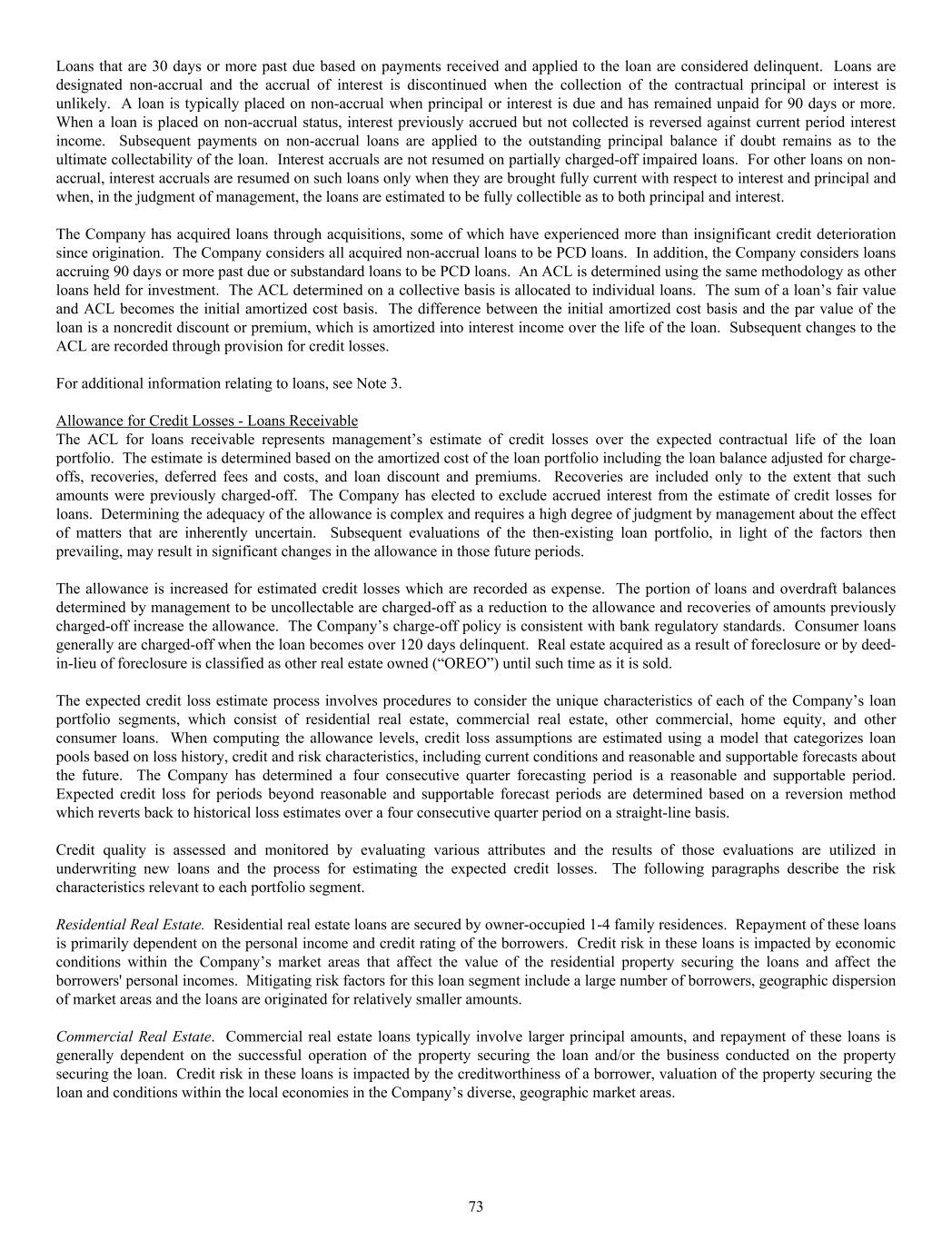 Loans that are 30 days or more past due based on payments received and applied to the loan are considered delinquent. Loans are designated non-accrual and the accrual of interest is discontinued when the collection of the contractual principal or interest is unlikely. A loan is typically placed on non-accrual when principal or interest is due and has remained unpaid for 90 days or more. When a loan is placed on non-accrual status, interest previously accrued but not collected is reversed against current period interest income. Subsequent payments on non-accrual loans are applied to the outstanding principal balance if doubt remains as to the ultimate collectability of the loan. Interest accruals are not resumed on partially charged-off impaired loans. For other loans on non- accrual, interest accruals are resumed on such loans only when they are brought fully current with respect to interest and principal and when, in the judgment of management, the loans are estimated to be fully collectible as to both principal and interest. The Company has acquired loans through acquisitions, some of which have experienced more than insignificant credit deterioration since origination. The Company considers all acquired non-accrual loans to be PCD loans. In addition, the Company considers loans accruing 90 days or more past due or substandard loans to be PCD loans. An ACL is determined using the same methodology as other loans held for investment. The ACL determined on a collective basis is allocated to individual loans. The sum of a loan’s fair value and ACL becomes the initial amortized cost basis. The difference between the initial amortized cost basis and the par value of the loan is a noncredit discount or premium, which is amortized into interest income over the life of the loan. Subsequent changes to the ACL are recorded through provision for credit losses. For additional information relating to loans, see Note 3. Allowance for Credit Losses - Loans Receivable The ACL for loans receivable represents management’s estimate of credit losses over the expected contractual life of the loan portfolio. The estimate is determined based on the amortized cost of the loan portfolio including the loan balance adjusted for charge- offs, recoveries, deferred fees and costs, and loan discount and premiums. Recoveries are included only to the extent that such amounts were previously charged-off. The Company has elected to exclude accrued interest from the estimate of credit losses for loans. Determining the adequacy of the allowance is complex and requires a high degree of judgment by management about the effect of matters that are inherently uncertain. Subsequent evaluations of the then-existing loan portfolio, in light of the factors then prevailing, may result in significant changes in the allowance in those future periods. The allowance is increased for estimated credit losses which are recorded as expense. The portion of loans and overdraft balances determined by management to be uncollectable are charged-off as a reduction to the allowance and recoveries of amounts previously charged-off increase the allowance. The Company’s charge-off policy is consistent with bank regulatory standards. Consumer loans generally are charged-off when the loan becomes over 120 days delinquent. Real estate acquired as a result of foreclosure or by deed- in-lieu of foreclosure is classified as other real estate owned (“OREO”) until such time as it is sold. The expected credit loss estimate process involves procedures to consider the unique characteristics of each of the Company’s loan portfolio segments, which consist of residential real estate, commercial real estate, other commercial, home equity, and other consumer loans. When computing the allowance levels, credit loss assumptions are estimated using a model that categorizes loan pools based on loss history, credit and risk characteristics, including current conditions and reasonable and supportable forecasts about the future. The Company has determined a four consecutive quarter forecasting period is a reasonable and supportable period. Expected credit loss for periods beyond reasonable and supportable forecast periods are determined based on a reversion method which reverts back to historical loss estimates over a four consecutive quarter period on a straight-line basis. Credit quality is assessed and monitored by evaluating various attributes and the results of those evaluations are utilized in underwriting new loans and the process for estimating the expected credit losses. The following paragraphs describe the risk characteristics relevant to each portfolio segment. Residential Real Estate. Residential real estate loans are secured by owner-occupied 1-4 family residences. Repayment of these loans is primarily dependent on the personal income and credit rating of the borrowers. Credit risk in these loans is impacted by economic conditions within the Company’s market areas that affect the value of the residential property securing the loans and affect the borrowers' personal incomes. Mitigating risk factors for this loan segment include a large number of borrowers, geographic dispersion of market areas and the loans are originated for relatively smaller amounts. Commercial Real Estate. Commercial real estate loans typically involve larger principal amounts, and repayment of these loans is generally dependent on the successful operation of the property securing the loan and/or the business conducted on the property securing the loan. Credit risk in these loans is impacted by the creditworthiness of a borrower, valuation of the property securing the loan and conditions within the local economies in the Company’s diverse, geographic market areas. 73