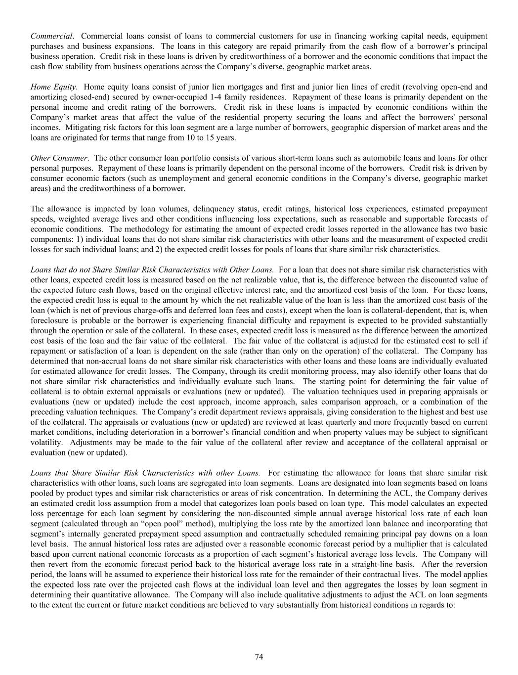 Commercial. Commercial loans consist of loans to commercial customers for use in financing working capital needs, equipment purchases and business expansions. The loans in this category are repaid primarily from the cash flow of a borrower’s principal business operation. Credit risk in these loans is driven by creditworthiness of a borrower and the economic conditions that impact the cash flow stability from business operations across the Company’s diverse, geographic market areas. Home Equity. Home equity loans consist of junior lien mortgages and first and junior lien lines of credit (revolving open-end and amortizing closed-end) secured by owner-occupied 1-4 family residences. Repayment of these loans is primarily dependent on the personal income and credit rating of the borrowers. Credit risk in these loans is impacted by economic conditions within the Company’s market areas that affect the value of the residential property securing the loans and affect the borrowers' personal incomes. Mitigating risk factors for this loan segment are a large number of borrowers, geographic dispersion of market areas and the loans are originated for terms that range from 10 to 15 years. Other Consumer. The other consumer loan portfolio consists of various short-term loans such as automobile loans and loans for other personal purposes. Repayment of these loans is primarily dependent on the personal income of the borrowers. Credit risk is driven by consumer economic factors (such as unemployment and general economic conditions in the Company’s diverse, geographic market areas) and the creditworthiness of a borrower. The allowance is impacted by loan volumes, delinquency status, credit ratings, historical loss experiences, estimated prepayment speeds, weighted average lives and other conditions influencing loss expectations, such as reasonable and supportable forecasts of economic conditions. The methodology for estimating the amount of expected credit losses reported in the allowance has two basic components: 1) individual loans that do not share similar risk characteristics with other loans and the measurement of expected credit losses for such individual loans; and 2) the expected credit losses for pools of loans that share similar risk characteristics. Loans that do not Share Similar Risk Characteristics with Other Loans. For a loan that does not share similar risk characteristics with other loans, expected credit loss is measured based on the net realizable value, that is, the difference between the discounted value of the expected future cash flows, based on the original effective interest rate, and the amortized cost basis of the loan. For these loans, the expected credit loss is equal to the amount by which the net realizable value of the loan is less than the amortized cost basis of the loan (which is net of previous charge-offs and deferred loan fees and costs), except when the loan is collateral-dependent, that is, when foreclosure is probable or the borrower is experiencing financial difficulty and repayment is expected to be provided substantially through the operation or sale of the collateral. In these cases, expected credit loss is measured as the difference between the amortized cost basis of the loan and the fair value of the collateral. The fair value of the collateral is adjusted for the estimated cost to sell if repayment or satisfaction of a loan is dependent on the sale (rather than only on the operation) of the collateral. The Company has determined that non-accrual loans do not share similar risk characteristics with other loans and these loans are individually evaluated for estimated allowance for credit losses. The Company, through its credit monitoring process, may also identify other loans that do not share similar risk characteristics and individually evaluate such loans. The starting point for determining the fair value of collateral is to obtain external appraisals or evaluations (new or updated). The valuation techniques used in preparing appraisals or evaluations (new or updated) include the cost approach, income approach, sales comparison approach, or a combination of the preceding valuation techniques. The Company’s credit department reviews appraisals, giving consideration to the highest and best use of the collateral. The appraisals or evaluations (new or updated) are reviewed at least quarterly and more frequently based on current market conditions, including deterioration in a borrower’s financial condition and when property values may be subject to significant volatility. Adjustments may be made to the fair value of the collateral after review and acceptance of the collateral appraisal or evaluation (new or updated). Loans that Share Similar Risk Characteristics with other Loans. For estimating the allowance for loans that share similar risk characteristics with other loans, such loans are segregated into loan segments. Loans are designated into loan segments based on loans pooled by product types and similar risk characteristics or areas of risk concentration. In determining the ACL, the Company derives an estimated credit loss assumption from a model that categorizes loan pools based on loan type. This model calculates an expected loss percentage for each loan segment by considering the non-discounted simple annual average historical loss rate of each loan segment (calculated through an “open pool” method), multiplying the loss rate by the amortized loan balance and incorporating that segment’s internally generated prepayment speed assumption and contractually scheduled remaining principal pay downs on a loan level basis. The annual historical loss rates are adjusted over a reasonable economic forecast period by a multiplier that is calculated based upon current national economic forecasts as a proportion of each segment’s historical average loss levels. The Company will then revert from the economic forecast period back to the historical av