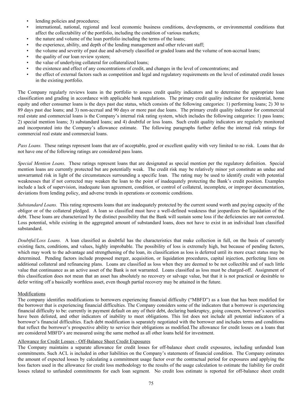 • lending policies and procedures; • international, national, regional and local economic business conditions, developments, or environmental conditions that affect the collectability of the portfolio, including the condition of various markets; • the nature and volume of the loan portfolio including the terms of the loans; • the experience, ability, and depth of the lending management and other relevant staff; • the volume and severity of past due and adversely classified or graded loans and the volume of non-accrual loans; • the quality of our loan review system; • the value of underlying collateral for collateralized loans; • the existence and effect of any concentrations of credit, and changes in the level of concentrations; and • the effect of external factors such as competition and legal and regulatory requirements on the level of estimated credit losses in the existing portfolio. The Company regularly reviews loans in the portfolio to assess credit quality indicators and to determine the appropriate loan classification and grading in accordance with applicable bank regulations. The primary credit quality indicator for residential, home equity and other consumer loans is the days past due status, which consists of the following categories: 1) performing loans; 2) 30 to 89 days past due loans; and 3) non-accrual and 90 days or more past due loans. The primary credit quality indicator for commercial real estate and commercial loans is the Company’s internal risk rating system, which includes the following categories: 1) pass loans; 2) special mention loans; 3) substandard loans; and 4) doubtful or loss loans. Such credit quality indicators are regularly monitored and incorporated into the Company’s allowance estimate. The following paragraphs further define the internal risk ratings for commercial real estate and commercial loans. Pass Loans. These ratings represent loans that are of acceptable, good or excellent quality with very limited to no risk. Loans that do not have one of the following ratings are considered pass loans. Special Mention Loans. These ratings represent loans that are designated as special mention per the regulatory definition. Special mention loans are currently protected but are potentially weak. The credit risk may be relatively minor yet constitute an undue and unwarranted risk in light of the circumstances surrounding a specific loan. The rating may be used to identify credit with potential weaknesses that if not corrected may weaken the loan to the point of inadequately protecting the Bank’s credit position. Examples include a lack of supervision, inadequate loan agreement, condition, or control of collateral, incomplete, or improper documentation, deviations from lending policy, and adverse trends in operations or economic conditions. Substandard Loans. This rating represents loans that are inadequately protected by the current sound worth and paying capacity of the obligor or of the collateral pledged. A loan so classified must have a well-defined weakness that jeopardizes the liquidation of the debt. These loans are characterized by the distinct possibility that the Bank will sustain some loss if the deficiencies are not corrected. Loss potential, while existing in the aggregated amount of substandard loans, does not have to exist in an individual loan classified substandard. Doubtful/Loss Loans. A loan classified as doubtful has the characteristics that make collection in full, on the basis of currently existing facts, conditions, and values, highly improbable. The possibility of loss is extremely high, but because of pending factors, which may work to the advantage and strengthening of the loan, its classification as loss is deferred until its more exact status may be determined. Pending factors include proposed merger, acquisition, or liquidation procedures, capital injection, perfecting liens on additional collateral and refinancing plans. Loans are classified as loss when they are deemed to be not collectible and of such little value that continuance as an active asset of the Bank is not warranted. Loans classified as loss must be charged-off. Assignment of this classification does not mean that an asset has absolutely no recovery or salvage value, but that it is not practical or desirable to defer writing off a basically worthless asset, even though partial recovery may be attained in the future. Modifications The company identifies modifications to borrowers experiencing financial difficulty (“MBFD”) as a loan that has been modified for the borrower that is experiencing financial difficulties. The Company considers some of the indicators that a borrower is experiencing financial difficulty to be: currently in payment default on any of their debt, declaring bankruptcy, going concern, borrower’s securities have been delisted, and other indicators of inability to meet obligations. This list does not include all potential indicators of a borrower’s financial difficulties. Each debt modification is separately negotiated with the borrower and includes terms and conditions that reflect the borrower’s prospective ability to service their obligations as modified.The allowance for credit losses on a loans that are considered MBFD’s are measured using the same method as all other loans held for investment. Allowance for Credit Losses - Off-Balance Sheet Credit Exposures The Company maintains a separate allowance for credit losses for off-balance sheet credit exposures, including unfunded loan commitments. Such ACL is included in other liabilities on the Company’s statements of financial condition. The Company estimates the amount of expected losses by calculating a commitment usage factor over the contractual period for exposures and applying the loss factors used in the allowance for credit loss methodology to the results of the usage calculation to estimate the liability for credit losses related to unfunded commitmen