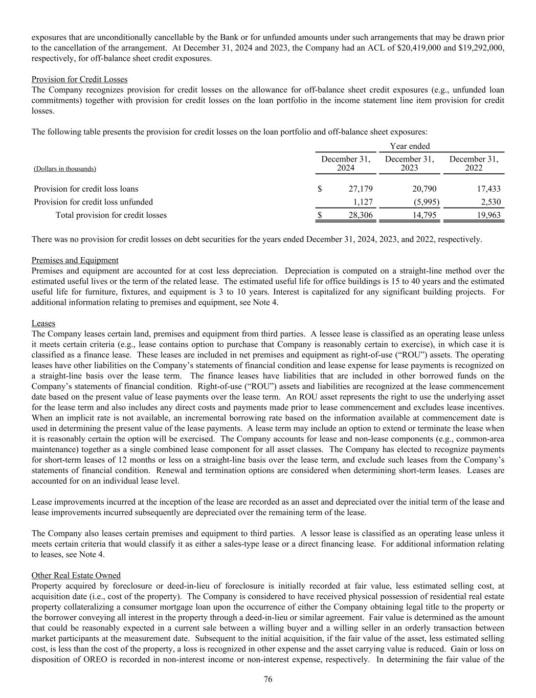 exposures that are unconditionally cancellable by the Bank or for unfunded amounts under such arrangements that may be drawn prior to the cancellation of the arrangement. At December 31, 2024 and 2023, the Company had an ACL of $20,419,000 and $19,292,000, respectively, for off-balance sheet credit exposures. Provision for Credit Losses The Company recognizes provision for credit losses on the allowance for off-balance sheet credit exposures (e.g., unfunded loan commitments) together with provision for credit losses on the loan portfolio in the income statement line item provision for credit losses. The following table presents the provision for credit losses on the loan portfolio and off-balance sheet exposures: Year ended (Dollars in thousands) December 31, 2024 December 31, 2023 December 31, 2022 Provision for credit loss loans $ 27,179 20,790 17,433 Provision for credit loss unfunded 1,127 (5,995) 2,530 Total provision for credit losses $ 28,306 14,795 19,963 There was no provision for credit losses on debt securities for the years ended December 31, 2024, 2023, and 2022, respectively. Premises and Equipment Premises and equipment are accounted for at cost less depreciation. Depreciation is computed on a straight-line method over the estimated useful lives or the term of the related lease. The estimated useful life for office buildings is 15 to 40 years and the estimated useful life for furniture, fixtures, and equipment is 3 to 10 years. Interest is capitalized for any significant building projects. For additional information relating to premises and equipment, see Note 4. Leases The Company leases certain land, premises and equipment from third parties. A lessee lease is classified as an operating lease unless it meets certain criteria (e.g., lease contains option to purchase that Company is reasonably certain to exercise), in which case it is classified as a finance lease. These leases are included in net premises and equipment as right-of-use (“ROU”) assets. The operating leases have other liabilities on the Company’s statements of financial condition and lease expense for lease payments is recognized on a straight-line basis over the lease term. The finance leases have liabilities that are included in other borrowed funds on the Company’s statements of financial condition. Right-of-use (“ROU”) assets and liabilities are recognized at the lease commencement date based on the present value of lease payments over the lease term. An ROU asset represents the right to use the underlying asset for the lease term and also includes any direct costs and payments made prior to lease commencement and excludes lease incentives. When an implicit rate is not available, an incremental borrowing rate based on the information available at commencement date is used in determining the present value of the lease payments. A lease term may include an option to extend or terminate the lease when it is reasonably certain the option will be exercised. The Company accounts for lease and non-lease components (e.g., common-area maintenance) together as a single combined lease component for all asset classes. The Company has elected to recognize payments for short-term leases of 12 months or less on a straight-line basis over the lease term, and exclude such leases from the Company’s statements of financial condition. Renewal and termination options are considered when determining short-term leases. Leases are accounted for on an individual lease level. Lease improvements incurred at the inception of the lease are recorded as an asset and depreciated over the initial term of the lease and lease improvements incurred subsequently are depreciated over the remaining term of the lease. The Company also leases certain premises and equipment to third parties. A lessor lease is classified as an operating lease unless it meets certain criteria that would classify it as either a sales-type lease or a direct financing lease. For additional information relating to leases, see Note 4. Other Real Estate Owned Property acquired by foreclosure or deed-in-lieu of foreclosure is initially recorded at fair value, less estimated selling cost, at acquisition date (i.e., cost of the property). The Company is considered to have received physical possession of residential real estate property collateralizing a consumer mortgage loan upon the occurrence of either the Company obtaining legal title to the property or the borrower conveying all interest in the property through a deed-in-lieu or similar agreement. Fair value is determined as the amount that could be reasonably expected in a current sale between a willing buyer and a willing seller in an orderly transaction between market participants at the measurement date. Subsequent to the initial acquisition, if the fair value of the asset, less estimated selling cost, is less than the cost of the property, a loss is recognized in other expense and the asset carrying value is reduced. Gain or loss on disposition of OREO is recorded in non-interest income or non-interest expense, respectively. In determining the fair value of the 76