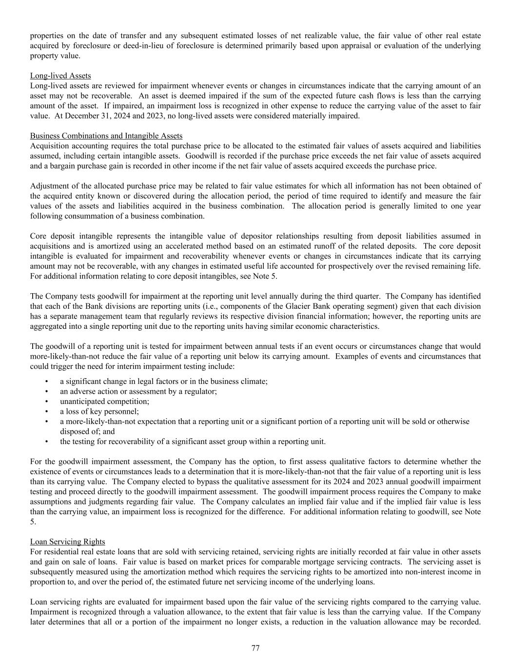 properties on the date of transfer and any subsequent estimated losses of net realizable value, the fair value of other real estate acquired by foreclosure or deed-in-lieu of foreclosure is determined primarily based upon appraisal or evaluation of the underlying property value. Long-lived Assets Long-lived assets are reviewed for impairment whenever events or changes in circumstances indicate that the carrying amount of an asset may not be recoverable. An asset is deemed impaired if the sum of the expected future cash flows is less than the carrying amount of the asset. If impaired, an impairment loss is recognized in other expense to reduce the carrying value of the asset to fair value. At December 31, 2024 and 2023, no long-lived assets were considered materially impaired. Business Combinations and Intangible Assets Acquisition accounting requires the total purchase price to be allocated to the estimated fair values of assets acquired and liabilities assumed, including certain intangible assets. Goodwill is recorded if the purchase price exceeds the net fair value of assets acquired and a bargain purchase gain is recorded in other income if the net fair value of assets acquired exceeds the purchase price. Adjustment of the allocated purchase price may be related to fair value estimates for which all information has not been obtained of the acquired entity known or discovered during the allocation period, the period of time required to identify and measure the fair values of the assets and liabilities acquired in the business combination. The allocation period is generally limited to one year following consummation of a business combination. Core deposit intangible represents the intangible value of depositor relationships resulting from deposit liabilities assumed in acquisitions and is amortized using an accelerated method based on an estimated runoff of the related deposits. The core deposit intangible is evaluated for impairment and recoverability whenever events or changes in circumstances indicate that its carrying amount may not be recoverable, with any changes in estimated useful life accounted for prospectively over the revised remaining life. For additional information relating to core deposit intangibles, see Note 5. The Company tests goodwill for impairment at the reporting unit level annually during the third quarter. The Company has identified that each of the Bank divisions are reporting units (i.e., components of the Glacier Bank operating segment) given that each division has a separate management team that regularly reviews its respective division financial information; however, the reporting units are aggregated into a single reporting unit due to the reporting units having similar economic characteristics. The goodwill of a reporting unit is tested for impairment between annual tests if an event occurs or circumstances change that would more-likely-than-not reduce the fair value of a reporting unit below its carrying amount. Examples of events and circumstances that could trigger the need for interim impairment testing include: • a significant change in legal factors or in the business climate; • an adverse action or assessment by a regulator; • unanticipated competition; • a loss of key personnel; • a more-likely-than-not expectation that a reporting unit or a significant portion of a reporting unit will be sold or otherwise disposed of; and • the testing for recoverability of a significant asset group within a reporting unit. For the goodwill impairment assessment, the Company has the option, to first assess qualitative factors to determine whether the existence of events or circumstances leads to a determination that it is more-likely-than-not that the fair value of a reporting unit is less than its carrying value. The Company elected to bypass the qualitative assessment for its 2024 and 2023 annual goodwill impairment testing and proceed directly to the goodwill impairment assessment. The goodwill impairment process requires the Company to make assumptions and judgments regarding fair value. The Company calculates an implied fair value and if the implied fair value is less than the carrying value, an impairment loss is recognized for the difference. For additional information relating to goodwill, see Note 5. Loan Servicing Rights For residential real estate loans that are sold with servicing retained, servicing rights are initially recorded at fair value in other assets and gain on sale of loans. Fair value is based on market prices for comparable mortgage servicing contracts. The servicing asset is subsequently measured using the amortization method which requires the servicing rights to be amortized into non-interest income in proportion to, and over the period of, the estimated future net servicing income of the underlying loans. Loan servicing rights are evaluated for impairment based upon the fair value of the servicing rights compared to the carrying value. Impairment is recognized through a valuation allowance, to the extent that fair value is less than the carrying value. If the Company later determines that all or a portion of the impairment no longer exists, a reduction in the valuation allowance may be recorded. 77