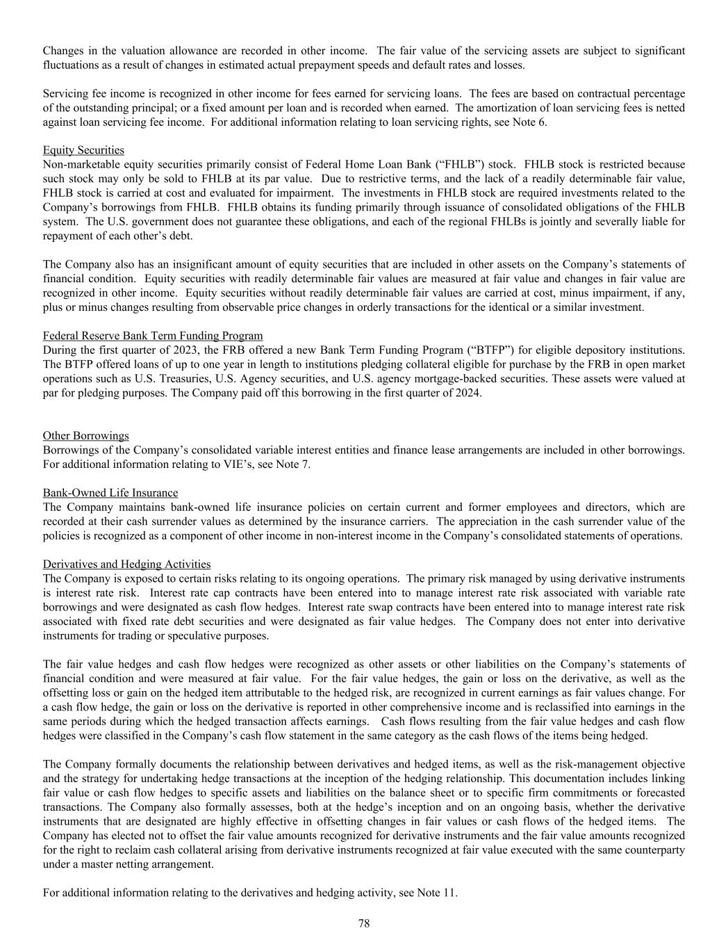 Changes in the valuation allowance are recorded in other income. The fair value of the servicing assets are subject to significant fluctuations as a result of changes in estimated actual prepayment speeds and default rates and losses. Servicing fee income is recognized in other income for fees earned for servicing loans. The fees are based on contractual percentage of the outstanding principal; or a fixed amount per loan and is recorded when earned. The amortization of loan servicing fees is netted against loan servicing fee income. For additional information relating to loan servicing rights, see Note 6. Equity Securities Non-marketable equity securities primarily consist of Federal Home Loan Bank (“FHLB”) stock. FHLB stock is restricted because such stock may only be sold to FHLB at its par value. Due to restrictive terms, and the lack of a readily determinable fair value, FHLB stock is carried at cost and evaluated for impairment. The investments in FHLB stock are required investments related to the Company’s borrowings from FHLB. FHLB obtains its funding primarily through issuance of consolidated obligations of the FHLB system. The U.S. government does not guarantee these obligations, and each of the regional FHLBs is jointly and severally liable for repayment of each other’s debt. The Company also has an insignificant amount of equity securities that are included in other assets on the Company’s statements of financial condition. Equity securities with readily determinable fair values are measured at fair value and changes in fair value are recognized in other income. Equity securities without readily determinable fair values are carried at cost, minus impairment, if any, plus or minus changes resulting from observable price changes in orderly transactions for the identical or a similar investment. Federal Reserve Bank Term Funding Program During the first quarter of 2023, the FRB offered a new Bank Term Funding Program (“BTFP”) for eligible depository institutions. The BTFP offered loans of up to one year in length to institutions pledging collateral eligible for purchase by the FRB in open market operations such as U.S. Treasuries, U.S. Agency securities, and U.S. agency mortgage-backed securities. These assets were valued at par for pledging purposes. The Company paid off this borrowing in the first quarter of 2024. Other Borrowings Borrowings of the Company’s consolidated variable interest entities and finance lease arrangements are included in other borrowings. For additional information relating to VIE’s, see Note 7. Bank-Owned Life Insurance The Company maintains bank-owned life insurance policies on certain current and former employees and directors, which are recorded at their cash surrender values as determined by the insurance carriers. The appreciation in the cash surrender value of the policies is recognized as a component of other income in non-interest income in the Company’s consolidated statements of operations. Derivatives and Hedging Activities The Company is exposed to certain risks relating to its ongoing operations. The primary risk managed by using derivative instruments is interest rate risk. Interest rate cap contracts have been entered into to manage interest rate risk associated with variable rate borrowings and were designated as cash flow hedges. Interest rate swap contracts have been entered into to manage interest rate risk associated with fixed rate debt securities and were designated as fair value hedges. The Company does not enter into derivative instruments for trading or speculative purposes. The fair value hedges and cash flow hedges were recognized as other assets or other liabilities on the Company’s statements of financial condition and were measured at fair value. For the fair value hedges, the gain or loss on the derivative, as well as the offsetting loss or gain on the hedged item attributable to the hedged risk, are recognized in current earnings as fair values change. For a cash flow hedge, the gain or loss on the derivative is reported in other comprehensive income and is reclassified into earnings in the same periods during which the hedged transaction affects earnings. Cash flows resulting from the fair value hedges and cash flow hedges were classified in the Company’s cash flow statement in the same category as the cash flows of the items being hedged. The Company formally documents the relationship between derivatives and hedged items, as well as the risk-management objective and the strategy for undertaking hedge transactions at the inception of the hedging relationship. This documentation includes linking fair value or cash flow hedges to specific assets and liabilities on the balance sheet or to specific firm commitments or forecasted transactions. The Company also formally assesses, both at the hedge’s inception and on an ongoing basis, whether the derivative instruments that are designated are highly effective in offsetting changes in fair values or cash flows of the hedged items. The Company has elected not to offset the fair value amounts recognized for derivative instruments and the fair value amounts recognized for the right to reclaim cash collateral arising from derivative instruments recognized at fair value executed with the same counterparty under a master netting arrangement. For additional information relating to the derivatives and hedging activity, see Note 11. 78