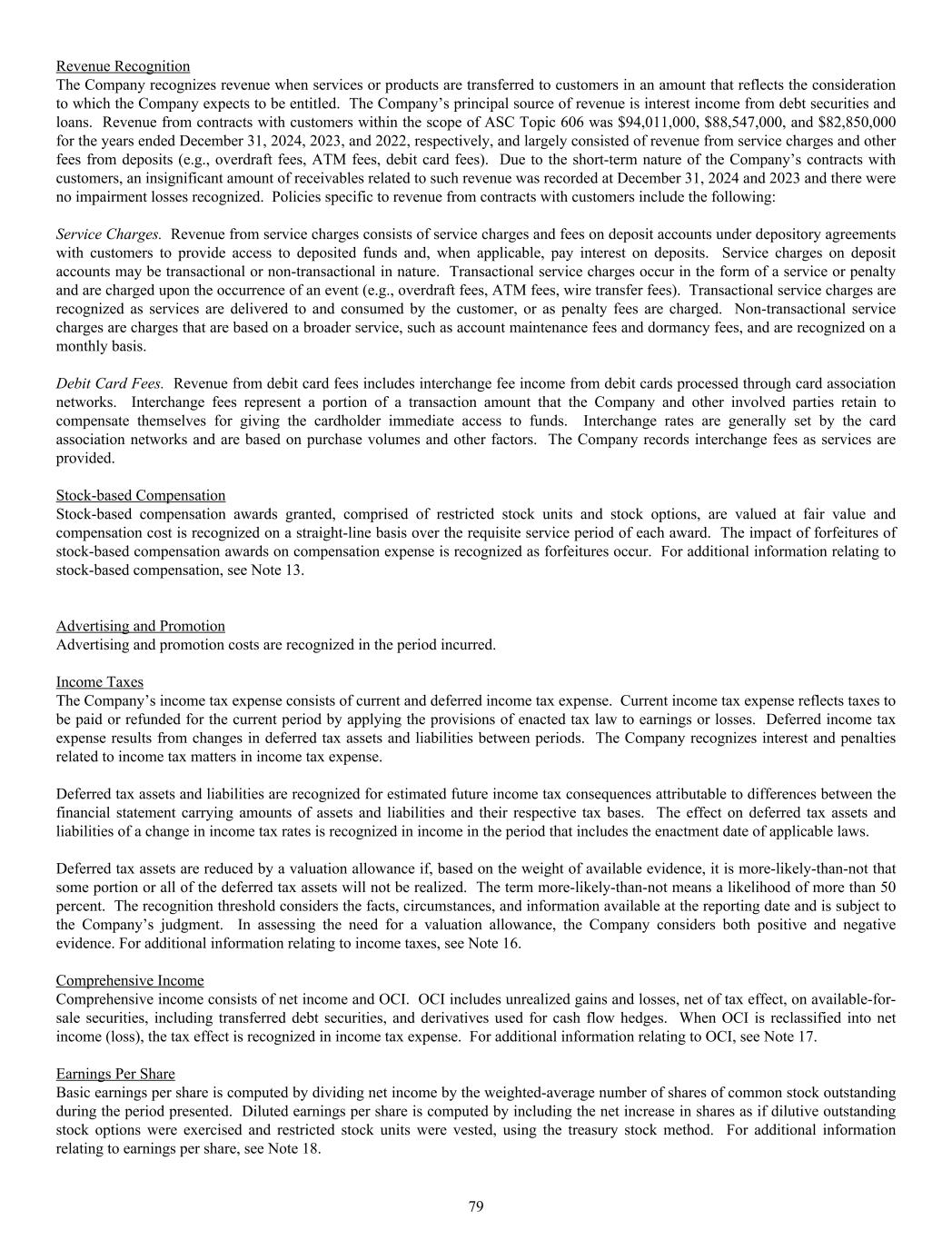Revenue Recognition The Company recognizes revenue when services or products are transferred to customers in an amount that reflects the consideration to which the Company expects to be entitled. The Company’s principal source of revenue is interest income from debt securities and loans. Revenue from contracts with customers within the scope of ASC Topic 606 was $94,011,000, $88,547,000, and $82,850,000 for the years ended December 31, 2024, 2023, and 2022, respectively, and largely consisted of revenue from service charges and other fees from deposits (e.g., overdraft fees, ATM fees, debit card fees). Due to the short-term nature of the Company’s contracts with customers, an insignificant amount of receivables related to such revenue was recorded at December 31, 2024 and 2023 and there were no impairment losses recognized. Policies specific to revenue from contracts with customers include the following: Service Charges. Revenue from service charges consists of service charges and fees on deposit accounts under depository agreements with customers to provide access to deposited funds and, when applicable, pay interest on deposits. Service charges on deposit accounts may be transactional or non-transactional in nature. Transactional service charges occur in the form of a service or penalty and are charged upon the occurrence of an event (e.g., overdraft fees, ATM fees, wire transfer fees). Transactional service charges are recognized as services are delivered to and consumed by the customer, or as penalty fees are charged. Non-transactional service charges are charges that are based on a broader service, such as account maintenance fees and dormancy fees, and are recognized on a monthly basis. Debit Card Fees. Revenue from debit card fees includes interchange fee income from debit cards processed through card association networks. Interchange fees represent a portion of a transaction amount that the Company and other involved parties retain to compensate themselves for giving the cardholder immediate access to funds. Interchange rates are generally set by the card association networks and are based on purchase volumes and other factors. The Company records interchange fees as services are provided. Stock-based Compensation Stock-based compensation awards granted, comprised of restricted stock units and stock options, are valued at fair value and compensation cost is recognized on a straight-line basis over the requisite service period of each award. The impact of forfeitures of stock-based compensation awards on compensation expense is recognized as forfeitures occur. For additional information relating to stock-based compensation, see Note 13. Advertising and Promotion Advertising and promotion costs are recognized in the period incurred. Income Taxes The Company’s income tax expense consists of current and deferred income tax expense. Current income tax expense reflects taxes to be paid or refunded for the current period by applying the provisions of enacted tax law to earnings or losses. Deferred income tax expense results from changes in deferred tax assets and liabilities between periods. The Company recognizes interest and penalties related to income tax matters in income tax expense. Deferred tax assets and liabilities are recognized for estimated future income tax consequences attributable to differences between the financial statement carrying amounts of assets and liabilities and their respective tax bases. The effect on deferred tax assets and liabilities of a change in income tax rates is recognized in income in the period that includes the enactment date of applicable laws. Deferred tax assets are reduced by a valuation allowance if, based on the weight of available evidence, it is more-likely-than-not that some portion or all of the deferred tax assets will not be realized. The term more-likely-than-not means a likelihood of more than 50 percent. The recognition threshold considers the facts, circumstances, and information available at the reporting date and is subject to the Company’s judgment. In assessing the need for a valuation allowance, the Company considers both positive and negative evidence. For additional information relating to income taxes, see Note 16. Comprehensive Income Comprehensive income consists of net income and OCI. OCI includes unrealized gains and losses, net of tax effect, on available-for- sale securities, including transferred debt securities, and derivatives used for cash flow hedges. When OCI is reclassified into net income (loss), the tax effect is recognized in income tax expense. For additional information relating to OCI, see Note 17. Earnings Per Share Basic earnings per share is computed by dividing net income by the weighted-average number of shares of common stock outstanding during the period presented. Diluted earnings per share is computed by including the net increase in shares as if dilutive outstanding stock options were exercised and restricted stock units were vested, using the treasury stock method. For additional information relating to earnings per share, see Note 18. 79