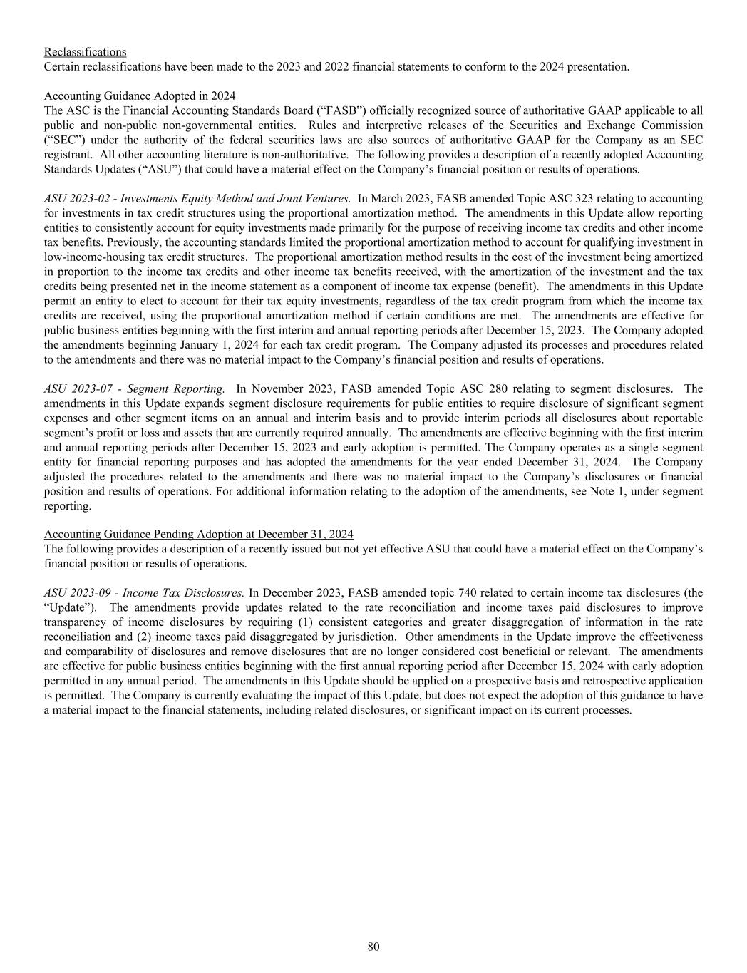 Reclassifications Certain reclassifications have been made to the 2023 and 2022 financial statements to conform to the 2024 presentation. Accounting Guidance Adopted in 2024 The ASC is the Financial Accounting Standards Board (“FASB”) officially recognized source of authoritative GAAP applicable to all public and non-public non-governmental entities. Rules and interpretive releases of the Securities and Exchange Commission (“SEC”) under the authority of the federal securities laws are also sources of authoritative GAAP for the Company as an SEC registrant. All other accounting literature is non-authoritative. The following provides a description of a recently adopted Accounting Standards Updates (“ASU”) that could have a material effect on the Company’s financial position or results of operations. ASU 2023-02 - Investments Equity Method and Joint Ventures. In March 2023, FASB amended Topic ASC 323 relating to accounting for investments in tax credit structures using the proportional amortization method. The amendments in this Update allow reporting entities to consistently account for equity investments made primarily for the purpose of receiving income tax credits and other income tax benefits. Previously, the accounting standards limited the proportional amortization method to account for qualifying investment in low-income-housing tax credit structures. The proportional amortization method results in the cost of the investment being amortized in proportion to the income tax credits and other income tax benefits received, with the amortization of the investment and the tax credits being presented net in the income statement as a component of income tax expense (benefit). The amendments in this Update permit an entity to elect to account for their tax equity investments, regardless of the tax credit program from which the income tax credits are received, using the proportional amortization method if certain conditions are met. The amendments are effective for public business entities beginning with the first interim and annual reporting periods after December 15, 2023. The Company adopted the amendments beginning January 1, 2024 for each tax credit program. The Company adjusted its processes and procedures related to the amendments and there was no material impact to the Company’s financial position and results of operations. ASU 2023-07 - Segment Reporting. In November 2023, FASB amended Topic ASC 280 relating to segment disclosures. The amendments in this Update expands segment disclosure requirements for public entities to require disclosure of significant segment expenses and other segment items on an annual and interim basis and to provide interim periods all disclosures about reportable segment’s profit or loss and assets that are currently required annually. The amendments are effective beginning with the first interim and annual reporting periods after December 15, 2023 and early adoption is permitted. The Company operates as a single segment entity for financial reporting purposes and has adopted the amendments for the year ended December 31, 2024. The Company adjusted the procedures related to the amendments and there was no material impact to the Company’s disclosures or financial position and results of operations. For additional information relating to the adoption of the amendments, see Note 1, under segment reporting. Accounting Guidance Pending Adoption at December 31, 2024 The following provides a description of a recently issued but not yet effective ASU that could have a material effect on the Company’s financial position or results of operations. ASU 2023-09 - Income Tax Disclosures. In December 2023, FASB amended topic 740 related to certain income tax disclosures (the “Update”). The amendments provide updates related to the rate reconciliation and income taxes paid disclosures to improve transparency of income disclosures by requiring (1) consistent categories and greater disaggregation of information in the rate reconciliation and (2) income taxes paid disaggregated by jurisdiction. Other amendments in the Update improve the effectiveness and comparability of disclosures and remove disclosures that are no longer considered cost beneficial or relevant. The amendments are effective for public business entities beginning with the first annual reporting period after December 15, 2024 with early adoption permitted in any annual period. The amendments in this Update should be applied on a prospective basis and retrospective application is permitted. The Company is currently evaluating the impact of this Update, but does not expect the adoption of this guidance to have a material impact to the financial statements, including related disclosures, or significant impact on its current processes. 80
