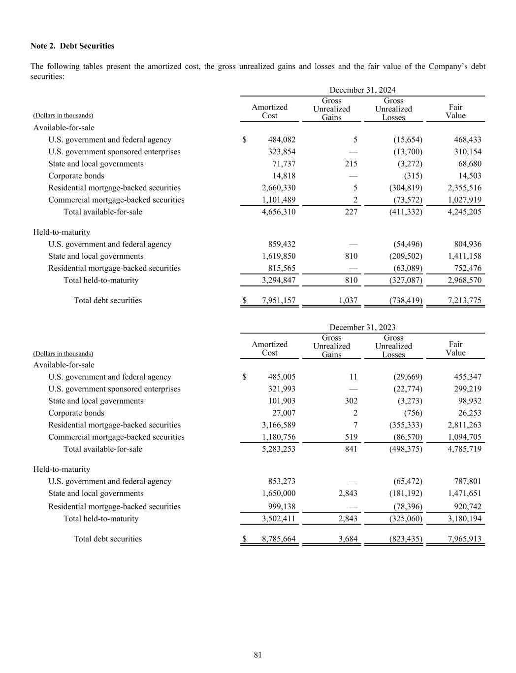 Note 2. Debt Securities The following tables present the amortized cost, the gross unrealized gains and losses and the fair value of the Company’s debt securities: December 31, 2024 Amortized Cost Gross Unrealized Gains Gross Unrealized Losses Fair Value(Dollars in thousands) Available-for-sale U.S. government and federal agency $ 484,082 5 (15,654) 468,433 U.S. government sponsored enterprises 323,854 — (13,700) 310,154 State and local governments 71,737 215 (3,272) 68,680 Corporate bonds 14,818 — (315) 14,503 Residential mortgage-backed securities 2,660,330 5 (304,819) 2,355,516 Commercial mortgage-backed securities 1,101,489 2 (73,572) 1,027,919 Total available-for-sale 4,656,310 227 (411,332) 4,245,205 Held-to-maturity U.S. government and federal agency 859,432 — (54,496) 804,936 State and local governments 1,619,850 810 (209,502) 1,411,158 Residential mortgage-backed securities 815,565 — (63,089) 752,476 Total held-to-maturity 3,294,847 810 (327,087) 2,968,570 Total debt securities $ 7,951,157 1,037 (738,419) 7,213,775 December 31, 2023 Amortized Cost Gross Unrealized Gains Gross Unrealized Losses Fair Value(Dollars in thousands) Available-for-sale U.S. government and federal agency $ 485,005 11 (29,669) 455,347 U.S. government sponsored enterprises 321,993 — (22,774) 299,219 State and local governments 101,903 302 (3,273) 98,932 Corporate bonds 27,007 2 (756) 26,253 Residential mortgage-backed securities 3,166,589 7 (355,333) 2,811,263 Commercial mortgage-backed securities 1,180,756 519 (86,570) 1,094,705 Total available-for-sale 5,283,253 841 (498,375) 4,785,719 Held-to-maturity U.S. government and federal agency 853,273 — (65,472) 787,801 State and local governments 1,650,000 2,843 (181,192) 1,471,651 Residential mortgage-backed securities 999,138 — (78,396) 920,742 Total held-to-maturity 3,502,411 2,843 (325,060) 3,180,194 Total debt securities $ 8,785,664 3,684 (823,435) 7,965,913 81