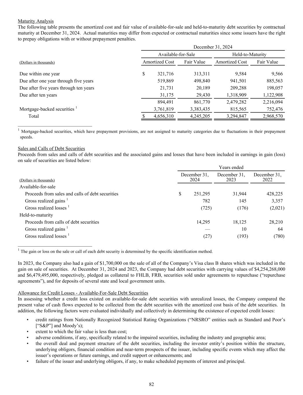 Maturity Analysis The following table presents the amortized cost and fair value of available-for-sale and held-to-maturity debt securities by contractual maturity at December 31, 2024. Actual maturities may differ from expected or contractual maturities since some issuers have the right to prepay obligations with or without prepayment penalties. December 31, 2024 Available-for-Sale Held-to-Maturity (Dollars in thousands) Amortized Cost Fair Value Amortized Cost Fair Value Due within one year $ 321,716 313,311 9,584 9,566 Due after one year through five years 519,869 498,840 941,501 885,563 Due after five years through ten years 21,731 20,189 209,288 198,057 Due after ten years 31,175 29,430 1,318,909 1,122,908 894,491 861,770 2,479,282 2,216,094 Mortgage-backed securities 1 3,761,819 3,383,435 815,565 752,476 Total $ 4,656,310 4,245,205 3,294,847 2,968,570 ______________________________ 1 Mortgage-backed securities, which have prepayment provisions, are not assigned to maturity categories due to fluctuations in their prepayment speeds. Sales and Calls of Debt Securities Proceeds from sales and calls of debt securities and the associated gains and losses that have been included in earnings in gain (loss) on sale of securities are listed below: Years ended (Dollars in thousands) December 31, 2024 December 31, 2023 December 31, 2022 Available-for-sale Proceeds from sales and calls of debt securities $ 251,295 31,944 428,225 Gross realized gains 1 782 145 3,357 Gross realized losses 1 (725) (176) (2,021) Held-to-maturity Proceeds from calls of debt securities 14,295 18,125 28,210 Gross realized gains 1 — 10 64 Gross realized losses 1 (27) (193) (780) ______________________________ 1 The gain or loss on the sale or call of each debt security is determined by the specific identification method. In 2023, the Company also had a gain of $1,700,000 on the sale of all of the Company’s Visa class B shares which was included in the gain on sale of securities. At December 31, 2024 and 2023, the Company had debt securities with carrying values of $4,254,268,000 and $6,479,495,000, respectively, pledged as collateral to FHLB, FRB, securities sold under agreements to repurchase (“repurchase agreements”), and for deposits of several state and local government units. Allowance for Credit Losses - Available-For-Sale Debt Securities In assessing whether a credit loss existed on available-for-sale debt securities with unrealized losses, the Company compared the present value of cash flows expected to be collected from the debt securities with the amortized cost basis of the debt securities. In addition, the following factors were evaluated individually and collectively in determining the existence of expected credit losses: • credit ratings from Nationally Recognized Statistical Rating Organizations (“NRSRO” entities such as Standard and Poor’s [“S&P”] and Moody’s); • extent to which the fair value is less than cost; • adverse conditions, if any, specifically related to the impaired securities, including the industry and geographic area; • the overall deal and payment structure of the debt securities, including the investor entity’s position within the structure, underlying obligors, financial condition and near-term prospects of the issuer, including specific events which may affect the issuer’s operations or future earnings, and credit support or enhancements; and • failure of the issuer and underlying obligors, if any, to make scheduled payments of interest and principal. 82
