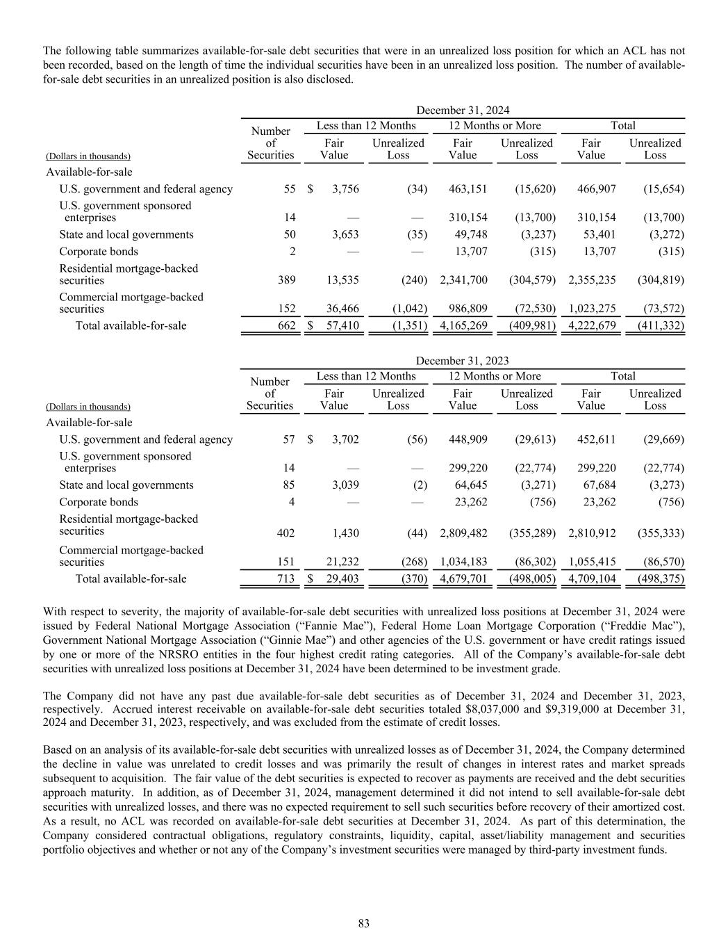The following table summarizes available-for-sale debt securities that were in an unrealized loss position for which an ACL has not been recorded, based on the length of time the individual securities have been in an unrealized loss position. The number of available- for-sale debt securities in an unrealized position is also disclosed. December 31, 2024 Number of Securities Less than 12 Months 12 Months or More Total (Dollars in thousands) Fair Value Unrealized Loss Fair Value Unrealized Loss Fair Value Unrealized Loss Available-for-sale U.S. government and federal agency 55 $ 3,756 (34) 463,151 (15,620) 466,907 (15,654) U.S. government sponsored enterprises 14 — — 310,154 (13,700) 310,154 (13,700) State and local governments 50 3,653 (35) 49,748 (3,237) 53,401 (3,272) Corporate bonds 2 — — 13,707 (315) 13,707 (315) Residential mortgage-backed securities 389 13,535 (240) 2,341,700 (304,579) 2,355,235 (304,819) Commercial mortgage-backed securities 152 36,466 (1,042) 986,809 (72,530) 1,023,275 (73,572) Total available-for-sale 662 $ 57,410 (1,351) 4,165,269 (409,981) 4,222,679 (411,332) December 31, 2023 Number of Securities Less than 12 Months 12 Months or More Total (Dollars in thousands) Fair Value Unrealized Loss Fair Value Unrealized Loss Fair Value Unrealized Loss Available-for-sale U.S. government and federal agency 57 $ 3,702 (56) 448,909 (29,613) 452,611 (29,669) U.S. government sponsored enterprises 14 — — 299,220 (22,774) 299,220 (22,774) State and local governments 85 3,039 (2) 64,645 (3,271) 67,684 (3,273) Corporate bonds 4 — — 23,262 (756) 23,262 (756) Residential mortgage-backed securities 402 1,430 (44) 2,809,482 (355,289) 2,810,912 (355,333) Commercial mortgage-backed securities 151 21,232 (268) 1,034,183 (86,302) 1,055,415 (86,570) Total available-for-sale 713 $ 29,403 (370) 4,679,701 (498,005) 4,709,104 (498,375) With respect to severity, the majority of available-for-sale debt securities with unrealized loss positions at December 31, 2024 were issued by Federal National Mortgage Association (“Fannie Mae”), Federal Home Loan Mortgage Corporation (“Freddie Mac”), Government National Mortgage Association (“Ginnie Mae”) and other agencies of the U.S. government or have credit ratings issued by one or more of the NRSRO entities in the four highest credit rating categories. All of the Company’s available-for-sale debt securities with unrealized loss positions at December 31, 2024 have been determined to be investment grade. The Company did not have any past due available-for-sale debt securities as of December 31, 2024 and December 31, 2023, respectively. Accrued interest receivable on available-for-sale debt securities totaled $8,037,000 and $9,319,000 at December 31, 2024 and December 31, 2023, respectively, and was excluded from the estimate of credit losses. Based on an analysis of its available-for-sale debt securities with unrealized losses as of December 31, 2024, the Company determined the decline in value was unrelated to credit losses and was primarily the result of changes in interest rates and market spreads subsequent to acquisition. The fair value of the debt securities is expected to recover as payments are received and the debt securities approach maturity. In addition, as of December 31, 2024, management determined it did not intend to sell available-for-sale debt securities with unrealized losses, and there was no expected requirement to sell such securities before recovery of their amortized cost. As a result, no ACL was recorded on available-for-sale debt securities at December 31, 2024. As part of this determination, the Company considered contractual obligations, regulatory constraints, liquidity, capital, asset/liability management and securities portfolio objectives and whether or not any of the Company’s investment securities were managed by third-party investment funds. 83