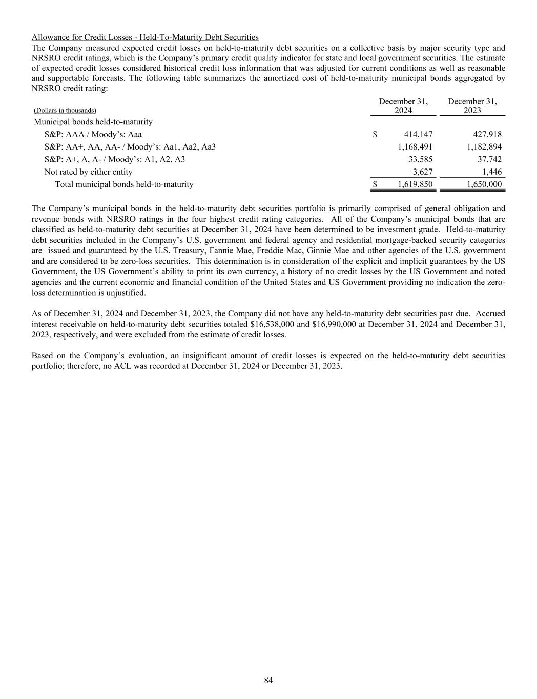 Allowance for Credit Losses - Held-To-Maturity Debt Securities The Company measured expected credit losses on held-to-maturity debt securities on a collective basis by major security type and NRSRO credit ratings, which is the Company’s primary credit quality indicator for state and local government securities. The estimate of expected credit losses considered historical credit loss information that was adjusted for current conditions as well as reasonable and supportable forecasts. The following table summarizes the amortized cost of held-to-maturity municipal bonds aggregated by NRSRO credit rating: (Dollars in thousands) December 31, 2024 December 31, 2023 Municipal bonds held-to-maturity S&P: AAA / Moody’s: Aaa $ 414,147 427,918 S&P: AA+, AA, AA- / Moody’s: Aa1, Aa2, Aa3 1,168,491 1,182,894 S&P: A+, A, A- / Moody’s: A1, A2, A3 33,585 37,742 Not rated by either entity 3,627 1,446 Total municipal bonds held-to-maturity $ 1,619,850 1,650,000 The Company’s municipal bonds in the held-to-maturity debt securities portfolio is primarily comprised of general obligation and revenue bonds with NRSRO ratings in the four highest credit rating categories. All of the Company’s municipal bonds that are classified as held-to-maturity debt securities at December 31, 2024 have been determined to be investment grade. Held-to-maturity debt securities included in the Company’s U.S. government and federal agency and residential mortgage-backed security categories are issued and guaranteed by the U.S. Treasury, Fannie Mae, Freddie Mac, Ginnie Mae and other agencies of the U.S. government and are considered to be zero-loss securities. This determination is in consideration of the explicit and implicit guarantees by the US Government, the US Government’s ability to print its own currency, a history of no credit losses by the US Government and noted agencies and the current economic and financial condition of the United States and US Government providing no indication the zero- loss determination is unjustified. As of December 31, 2024 and December 31, 2023, the Company did not have any held-to-maturity debt securities past due. Accrued interest receivable on held-to-maturity debt securities totaled $16,538,000 and $16,990,000 at December 31, 2024 and December 31, 2023, respectively, and were excluded from the estimate of credit losses. Based on the Company’s evaluation, an insignificant amount of credit losses is expected on the held-to-maturity debt securities portfolio; therefore, no ACL was recorded at December 31, 2024 or December 31, 2023. 84