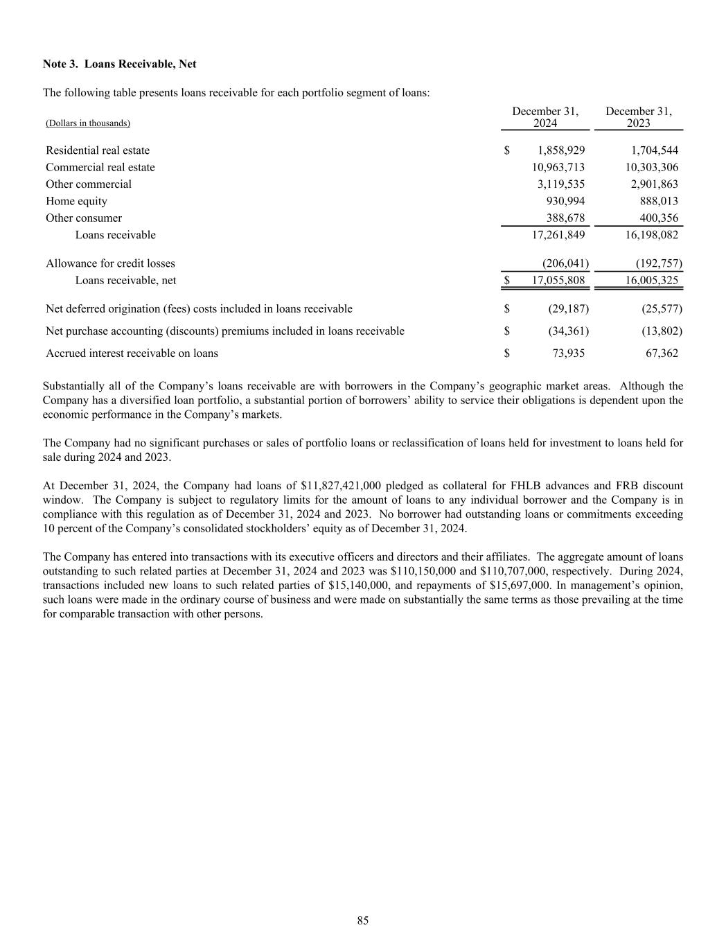Note 3. Loans Receivable, Net The following table presents loans receivable for each portfolio segment of loans: (Dollars in thousands) December 31, 2024 December 31, 2023 Residential real estate $ 1,858,929 1,704,544 Commercial real estate 10,963,713 10,303,306 Other commercial 3,119,535 2,901,863 Home equity 930,994 888,013 Other consumer 388,678 400,356 Loans receivable 17,261,849 16,198,082 Allowance for credit losses (206,041) (192,757) Loans receivable, net $ 17,055,808 16,005,325 Net deferred origination (fees) costs included in loans receivable $ (29,187) (25,577) Net purchase accounting (discounts) premiums included in loans receivable $ (34,361) (13,802) Accrued interest receivable on loans $ 73,935 67,362 Substantially all of the Company’s loans receivable are with borrowers in the Company’s geographic market areas. Although the Company has a diversified loan portfolio, a substantial portion of borrowers’ ability to service their obligations is dependent upon the economic performance in the Company’s markets. The Company had no significant purchases or sales of portfolio loans or reclassification of loans held for investment to loans held for sale during 2024 and 2023. At December 31, 2024, the Company had loans of $11,827,421,000 pledged as collateral for FHLB advances and FRB discount window. The Company is subject to regulatory limits for the amount of loans to any individual borrower and the Company is in compliance with this regulation as of December 31, 2024 and 2023. No borrower had outstanding loans or commitments exceeding 10 percent of the Company’s consolidated stockholders’ equity as of December 31, 2024. The Company has entered into transactions with its executive officers and directors and their affiliates. The aggregate amount of loans outstanding to such related parties at December 31, 2024 and 2023 was $110,150,000 and $110,707,000, respectively. During 2024, transactions included new loans to such related parties of $15,140,000, and repayments of $15,697,000. In management’s opinion, such loans were made in the ordinary course of business and were made on substantially the same terms as those prevailing at the time for comparable transaction with other persons. 85