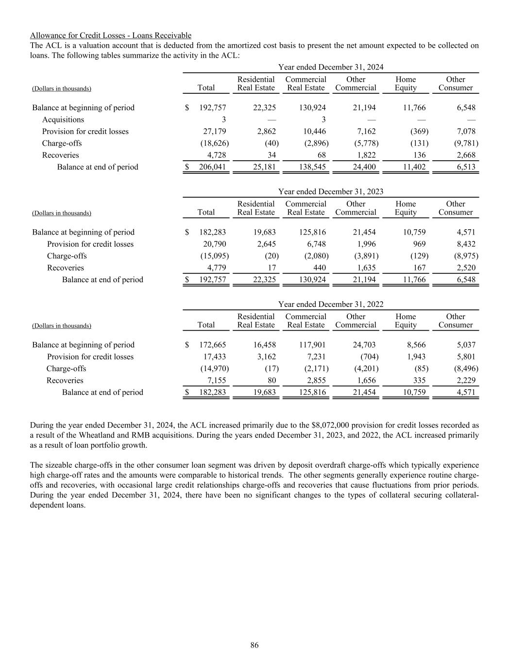 Allowance for Credit Losses - Loans Receivable The ACL is a valuation account that is deducted from the amortized cost basis to present the net amount expected to be collected on loans. The following tables summarize the activity in the ACL: Year ended December 31, 2024 (Dollars in thousands) Total Residential Real Estate Commercial Real Estate Other Commercial Home Equity Other Consumer Balance at beginning of period $ 192,757 22,325 130,924 21,194 11,766 6,548 Acquisitions 3 — 3 — — — Provision for credit losses 27,179 2,862 10,446 7,162 (369) 7,078 Charge-offs (18,626) (40) (2,896) (5,778) (131) (9,781) Recoveries 4,728 34 68 1,822 136 2,668 Balance at end of period $ 206,041 25,181 138,545 24,400 11,402 6,513 Year ended December 31, 2023 (Dollars in thousands) Total Residential Real Estate Commercial Real Estate Other Commercial Home Equity Other Consumer Balance at beginning of period $ 182,283 19,683 125,816 21,454 10,759 4,571 Provision for credit losses 20,790 2,645 6,748 1,996 969 8,432 Charge-offs (15,095) (20) (2,080) (3,891) (129) (8,975) Recoveries 4,779 17 440 1,635 167 2,520 Balance at end of period $ 192,757 22,325 130,924 21,194 11,766 6,548 Year ended December 31, 2022 (Dollars in thousands) Total Residential Real Estate Commercial Real Estate Other Commercial Home Equity Other Consumer Balance at beginning of period $ 172,665 16,458 117,901 24,703 8,566 5,037 Provision for credit losses 17,433 3,162 7,231 (704) 1,943 5,801 Charge-offs (14,970) (17) (2,171) (4,201) (85) (8,496) Recoveries 7,155 80 2,855 1,656 335 2,229 Balance at end of period $ 182,283 19,683 125,816 21,454 10,759 4,571 During the year ended December 31, 2024, the ACL increased primarily due to the $8,072,000 provision for credit losses recorded as a result of the Wheatland and RMB acquisitions. During the years ended December 31, 2023, and 2022, the ACL increased primarily as a result of loan portfolio growth. The sizeable charge-offs in the other consumer loan segment was driven by deposit overdraft charge-offs which typically experience high charge-off rates and the amounts were comparable to historical trends. The other segments generally experience routine charge- offs and recoveries, with occasional large credit relationships charge-offs and recoveries that cause fluctuations from prior periods. During the year ended December 31, 2024, there have been no significant changes to the types of collateral securing collateral- dependent loans. 86