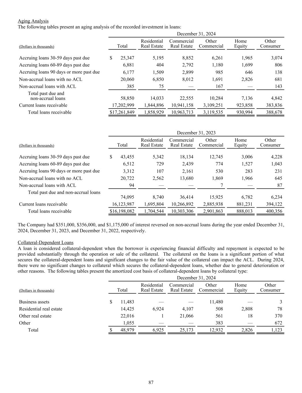 Aging Analysis The following tables present an aging analysis of the recorded investment in loans: December 31, 2024 (Dollars in thousands) Total Residential Real Estate Commercial Real Estate Other Commercial Home Equity Other Consumer Accruing loans 30-59 days past due $ 25,347 5,195 8,852 6,261 1,965 3,074 Accruing loans 60-89 days past due 6,881 404 2,792 1,180 1,699 806 Accruing loans 90 days or more past due 6,177 1,509 2,899 985 646 138 Non-accrual loans with no ACL 20,060 6,850 8,012 1,691 2,826 681 Non-accrual loans with ACL 385 75 — 167 — 143 Total past due and non-accrual loans 58,850 14,033 22,555 10,284 7,136 4,842 Current loans receivable 17,202,999 1,844,896 10,941,158 3,109,251 923,858 383,836 Total loans receivable $ 17,261,849 1,858,929 10,963,713 3,119,535 930,994 388,678 December 31, 2023 (Dollars in thousands) Total Residential Real Estate Commercial Real Estate Other Commercial Home Equity Other Consumer Accruing loans 30-59 days past due $ 43,455 5,342 18,134 12,745 3,006 4,228 Accruing loans 60-89 days past due 6,512 729 2,439 774 1,527 1,043 Accruing loans 90 days or more past due 3,312 107 2,161 530 283 231 Non-accrual loans with no ACL 20,722 2,562 13,680 1,869 1,966 645 Non-accrual loans with ACL 94 — — 7 — 87 Total past due and non-accrual loans 74,095 8,740 36,414 15,925 6,782 6,234 Current loans receivable 16,123,987 1,695,804 10,266,892 2,885,938 881,231 394,122 Total loans receivable $ 16,198,082 1,704,544 10,303,306 2,901,863 888,013 400,356 The Company had $351,000, $356,000, and $1,175,000 of interest reversed on non-accrual loans during the year ended December 31, 2024, December 31, 2023, and December 31, 2022, respectively. Collateral-Dependent Loans A loan is considered collateral-dependent when the borrower is experiencing financial difficulty and repayment is expected to be provided substantially through the operation or sale of the collateral. The collateral on the loans is a significant portion of what secures the collateral-dependent loans and significant changes to the fair value of the collateral can impact the ACL. During 2024, there were no significant changes to collateral which secures the collateral-dependent loans, whether due to general deterioration or other reasons. The following tables present the amortized cost basis of collateral-dependent loans by collateral type: December 31, 2024 (Dollars in thousands) Total Residential Real Estate Commercial Real Estate Other Commercial Home Equity Other Consumer Business assets $ 11,483 — — 11,480 — 3 Residential real estate 14,425 6,924 4,107 508 2,808 78 Other real estate 22,016 1 21,066 561 18 370 Other 1,055 — — 383 — 672 Total $ 48,979 6,925 25,173 12,932 2,826 1,123 87