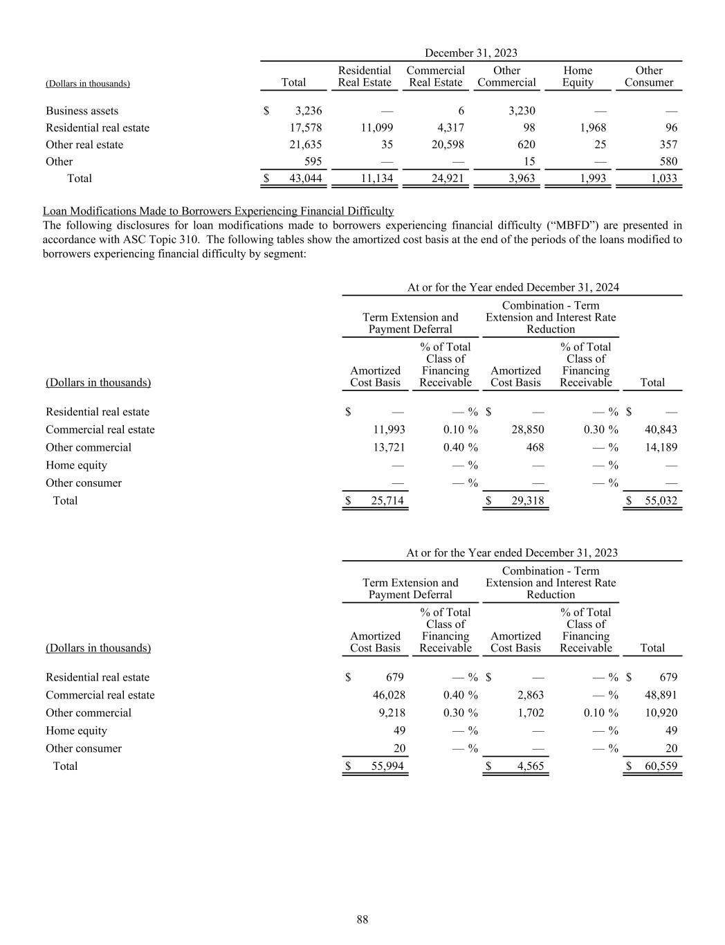 December 31, 2023 (Dollars in thousands) Total Residential Real Estate Commercial Real Estate Other Commercial Home Equity Other Consumer Business assets $ 3,236 — 6 3,230 — — Residential real estate 17,578 11,099 4,317 98 1,968 96 Other real estate 21,635 35 20,598 620 25 357 Other 595 — — 15 — 580 Total $ 43,044 11,134 24,921 3,963 1,993 1,033 Loan Modifications Made to Borrowers Experiencing Financial Difficulty The following disclosures for loan modifications made to borrowers experiencing financial difficulty (“MBFD”) are presented in accordance with ASC Topic 310. The following tables show the amortized cost basis at the end of the periods of the loans modified to borrowers experiencing financial difficulty by segment: At or for the Year ended December 31, 2024 Term Extension and Payment Deferral Combination - Term Extension and Interest Rate Reduction (Dollars in thousands) Amortized Cost Basis % of Total Class of Financing Receivable Amortized Cost Basis % of Total Class of Financing Receivable Total Residential real estate $ — — % $ — — % $ — Commercial real estate 11,993 0.10 % 28,850 0.30 % 40,843 Other commercial 13,721 0.40 % 468 — % 14,189 Home equity — — % — — % — Other consumer — — % — — % — Total $ 25,714 $ 29,318 $ 55,032 At or for the Year ended December 31, 2023 Term Extension and Payment Deferral Combination - Term Extension and Interest Rate Reduction (Dollars in thousands) Amortized Cost Basis % of Total Class of Financing Receivable Amortized Cost Basis % of Total Class of Financing Receivable Total Residential real estate $ 679 — % $ — — % $ 679 Commercial real estate 46,028 0.40 % 2,863 — % 48,891 Other commercial 9,218 0.30 % 1,702 0.10 % 10,920 Home equity 49 — % — — % 49 Other consumer 20 — % — — % 20 Total $ 55,994 $ 4,565 $ 60,559 88