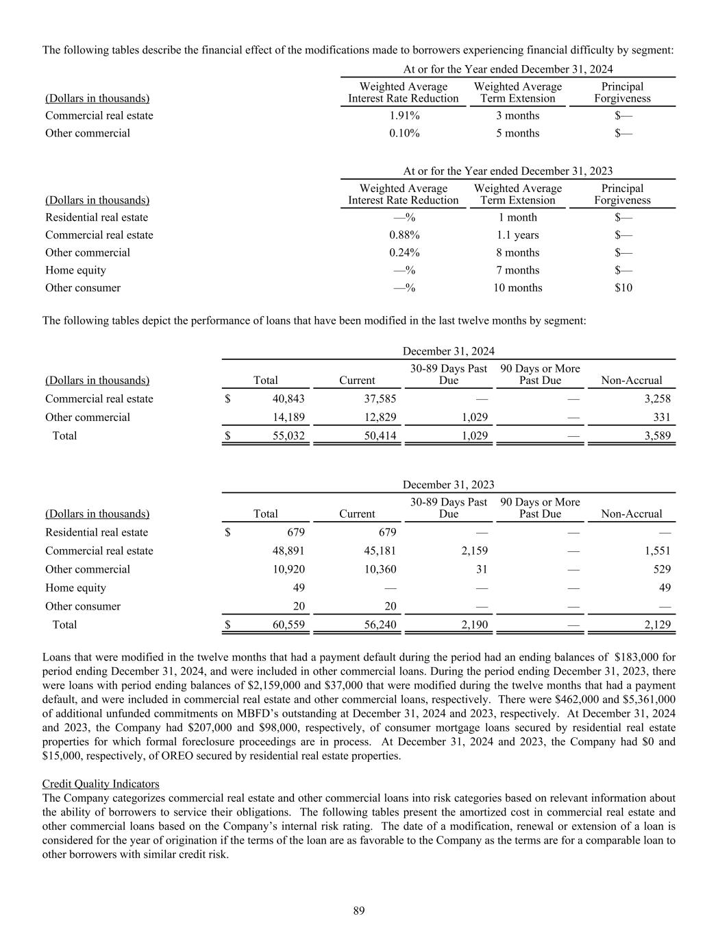 The following tables describe the financial effect of the modifications made to borrowers experiencing financial difficulty by segment: At or for the Year ended December 31, 2024 (Dollars in thousands) Weighted Average Interest Rate Reduction Weighted Average Term Extension Principal Forgiveness Commercial real estate 1.91% 3 months $— Other commercial 0.10% 5 months $— At or for the Year ended December 31, 2023 (Dollars in thousands) Weighted Average Interest Rate Reduction Weighted Average Term Extension Principal Forgiveness Residential real estate —% 1 month $— Commercial real estate 0.88% 1.1 years $— Other commercial 0.24% 8 months $— Home equity —% 7 months $— Other consumer —% 10 months $10 The following tables depict the performance of loans that have been modified in the last twelve months by segment: December 31, 2024 (Dollars in thousands) Total Current 30-89 Days Past Due 90 Days or More Past Due Non-Accrual Commercial real estate $ 40,843 37,585 — — 3,258 Other commercial 14,189 12,829 1,029 — 331 Total $ 55,032 50,414 1,029 — 3,589 December 31, 2023 (Dollars in thousands) Total Current 30-89 Days Past Due 90 Days or More Past Due Non-Accrual Residential real estate $ 679 679 — — — Commercial real estate 48,891 45,181 2,159 — 1,551 Other commercial 10,920 10,360 31 — 529 Home equity 49 — — — 49 Other consumer 20 20 — — — Total $ 60,559 56,240 2,190 — 2,129 Loans that were modified in the twelve months that had a payment default during the period had an ending balances of $183,000 for period ending December 31, 2024, and were included in other commercial loans. During the period ending December 31, 2023, there were loans with period ending balances of $2,159,000 and $37,000 that were modified during the twelve months that had a payment default, and were included in commercial real estate and other commercial loans, respectively. There were $462,000 and $5,361,000 of additional unfunded commitments on MBFD’s outstanding at December 31, 2024 and 2023, respectively. At December 31, 2024 and 2023, the Company had $207,000 and $98,000, respectively, of consumer mortgage loans secured by residential real estate properties for which formal foreclosure proceedings are in process. At December 31, 2024 and 2023, the Company had $0 and $15,000, respectively, of OREO secured by residential real estate properties. Credit Quality Indicators The Company categorizes commercial real estate and other commercial loans into risk categories based on relevant information about the ability of borrowers to service their obligations. The following tables present the amortized cost in commercial real estate and other commercial loans based on the Company’s internal risk rating. The date of a modification, renewal or extension of a loan is considered for the year of origination if the terms of the loan are as favorable to the Company as the terms are for a comparable loan to other borrowers with similar credit risk. 89