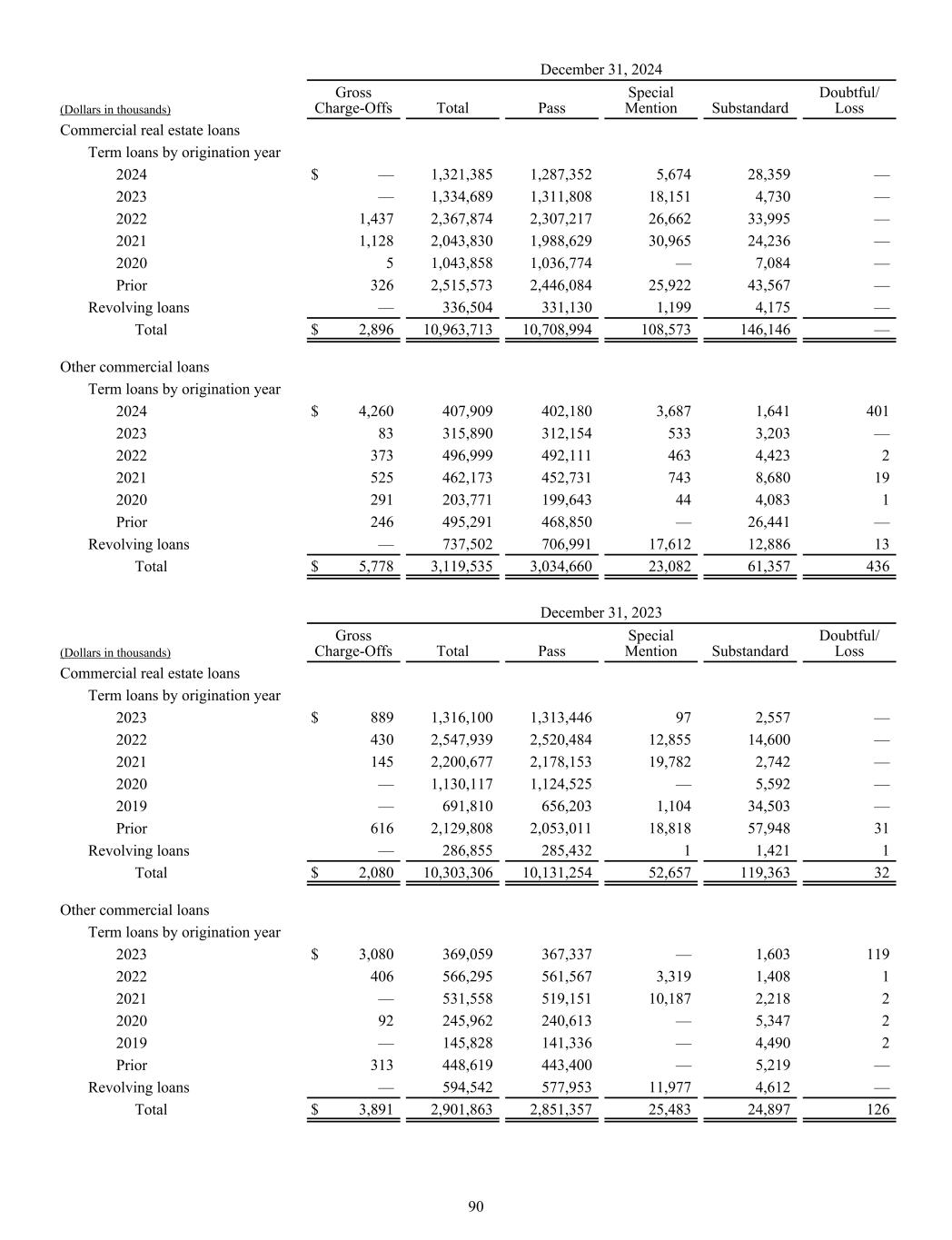 December 31, 2024 (Dollars in thousands) Gross Charge-Offs Total Pass Special Mention Substandard Doubtful/ Loss Commercial real estate loans Term loans by origination year 2024 $ — 1,321,385 1,287,352 5,674 28,359 — 2023 — 1,334,689 1,311,808 18,151 4,730 — 2022 1,437 2,367,874 2,307,217 26,662 33,995 — 2021 1,128 2,043,830 1,988,629 30,965 24,236 — 2020 5 1,043,858 1,036,774 — 7,084 — Prior 326 2,515,573 2,446,084 25,922 43,567 — Revolving loans — 336,504 331,130 1,199 4,175 — Total $ 2,896 10,963,713 10,708,994 108,573 146,146 — Other commercial loans Term loans by origination year 2024 $ 4,260 407,909 402,180 3,687 1,641 401 2023 83 315,890 312,154 533 3,203 — 2022 373 496,999 492,111 463 4,423 2 2021 525 462,173 452,731 743 8,680 19 2020 291 203,771 199,643 44 4,083 1 Prior 246 495,291 468,850 — 26,441 — Revolving loans — 737,502 706,991 17,612 12,886 13 Total $ 5,778 3,119,535 3,034,660 23,082 61,357 436 December 31, 2023 (Dollars in thousands) Gross Charge-Offs Total Pass Special Mention Substandard Doubtful/ Loss Commercial real estate loans Term loans by origination year 2023 $ 889 1,316,100 1,313,446 97 2,557 — 2022 430 2,547,939 2,520,484 12,855 14,600 — 2021 145 2,200,677 2,178,153 19,782 2,742 — 2020 — 1,130,117 1,124,525 — 5,592 — 2019 — 691,810 656,203 1,104 34,503 — Prior 616 2,129,808 2,053,011 18,818 57,948 31 Revolving loans — 286,855 285,432 1 1,421 1 Total $ 2,080 10,303,306 10,131,254 52,657 119,363 32 Other commercial loans Term loans by origination year 2023 $ 3,080 369,059 367,337 — 1,603 119 2022 406 566,295 561,567 3,319 1,408 1 2021 — 531,558 519,151 10,187 2,218 2 2020 92 245,962 240,613 — 5,347 2 2019 — 145,828 141,336 — 4,490 2 Prior 313 448,619 443,400 — 5,219 — Revolving loans — 594,542 577,953 11,977 4,612 — Total $ 3,891 2,901,863 2,851,357 25,483 24,897 126 90
