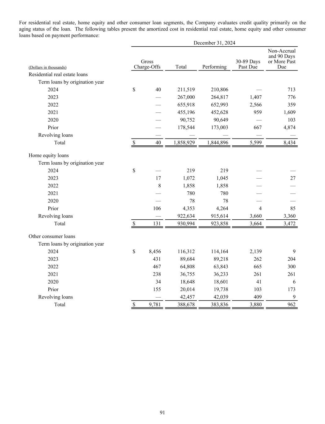 For residential real estate, home equity and other consumer loan segments, the Company evaluates credit quality primarily on the aging status of the loan. The following tables present the amortized cost in residential real estate, home equity and other consumer loans based on payment performance: December 31, 2024 (Dollars in thousands) Gross Charge-Offs Total Performing 30-89 Days Past Due Non-Accrual and 90 Days or More Past Due Residential real estate loans Term loans by origination year 2024 $ 40 211,519 210,806 — 713 2023 — 267,000 264,817 1,407 776 2022 — 655,918 652,993 2,566 359 2021 — 455,196 452,628 959 1,609 2020 — 90,752 90,649 — 103 Prior — 178,544 173,003 667 4,874 Revolving loans — — — — — Total $ 40 1,858,929 1,844,896 5,599 8,434 Home equity loans Term loans by origination year 2024 $ — 219 219 — — 2023 17 1,072 1,045 — 27 2022 8 1,858 1,858 — — 2021 — 780 780 — — 2020 — 78 78 — — Prior 106 4,353 4,264 4 85 Revolving loans — 922,634 915,614 3,660 3,360 Total $ 131 930,994 923,858 3,664 3,472 Other consumer loans Term loans by origination year 2024 $ 8,456 116,312 114,164 2,139 9 2023 431 89,684 89,218 262 204 2022 467 64,808 63,843 665 300 2021 238 36,755 36,233 261 261 2020 34 18,648 18,601 41 6 Prior 155 20,014 19,738 103 173 Revolving loans — 42,457 42,039 409 9 Total $ 9,781 388,678 383,836 3,880 962 91