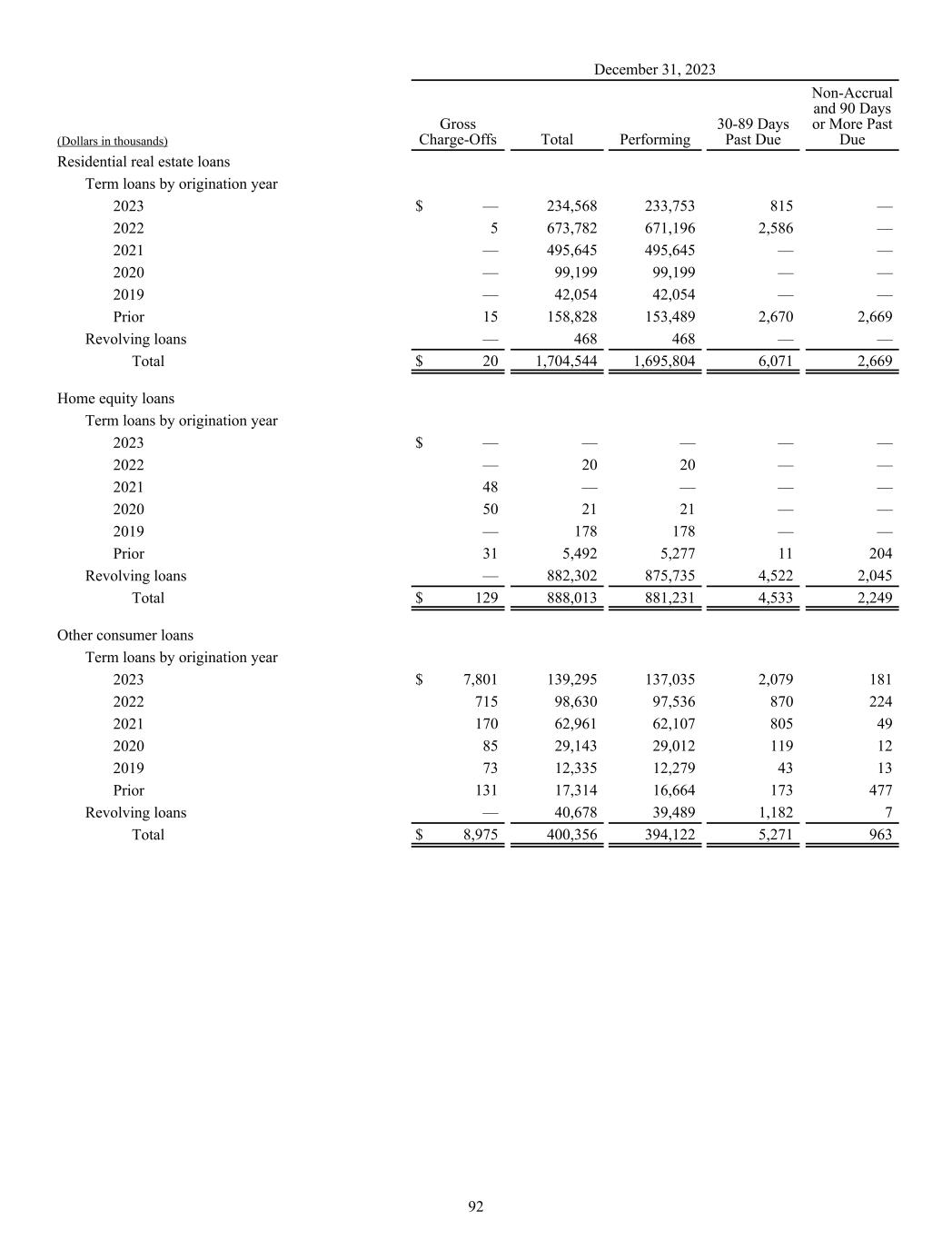 December 31, 2023 (Dollars in thousands) Gross Charge-Offs Total Performing 30-89 Days Past Due Non-Accrual and 90 Days or More Past Due Residential real estate loans Term loans by origination year 2023 $ — 234,568 233,753 815 — 2022 5 673,782 671,196 2,586 — 2021 — 495,645 495,645 — — 2020 — 99,199 99,199 — — 2019 — 42,054 42,054 — — Prior 15 158,828 153,489 2,670 2,669 Revolving loans — 468 468 — — Total $ 20 1,704,544 1,695,804 6,071 2,669 Home equity loans Term loans by origination year 2023 $ — — — — — 2022 — 20 20 — — 2021 48 — — — — 2020 50 21 21 — — 2019 — 178 178 — — Prior 31 5,492 5,277 11 204 Revolving loans — 882,302 875,735 4,522 2,045 Total $ 129 888,013 881,231 4,533 2,249 Other consumer loans Term loans by origination year 2023 $ 7,801 139,295 137,035 2,079 181 2022 715 98,630 97,536 870 224 2021 170 62,961 62,107 805 49 2020 85 29,143 29,012 119 12 2019 73 12,335 12,279 43 13 Prior 131 17,314 16,664 173 477 Revolving loans — 40,678 39,489 1,182 7 Total $ 8,975 400,356 394,122 5,271 963 92