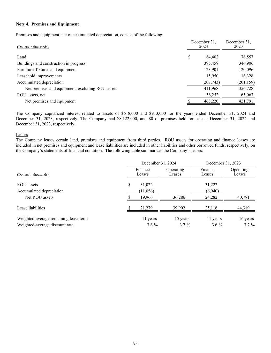 Note 4. Premises and Equipment Premises and equipment, net of accumulated depreciation, consist of the following: (Dollars in thousands) December 31, 2024 December 31, 2023 Land $ 84,402 76,557 Buildings and construction in progress 395,458 344,906 Furniture, fixtures and equipment 123,901 120,096 Leasehold improvements 15,950 16,328 Accumulated depreciation (207,743) (201,159) Net premises and equipment, excluding ROU assets 411,968 356,728 ROU assets, net 56,252 65,063 Net premises and equipment $ 468,220 421,791 The Company capitalized interest related to assets of $618,000 and $913,000 for the years ended December 31, 2024 and December 31, 2023, respectively. The Company had $8,122,000, and $0 of premises held for sale at December 31, 2024 and December 31, 2023, respectively. Leases The Company leases certain land, premises and equipment from third parties. ROU assets for operating and finance leases are included in net premises and equipment and lease liabilities are included in other liabilities and other borrowed funds, respectively, on the Company’s statements of financial condition. The following table summarizes the Company’s leases: December 31, 2024 December 31, 2023 (Dollars in thousands) Finance Leases Operating Leases Finance Leases Operating Leases ROU assets $ 31,022 31,222 Accumulated depreciation (11,056) (6,940) Net ROU assets $ 19,966 36,286 24,282 40,781 Lease liabilities $ 21,279 39,902 25,116 44,319 Weighted-average remaining lease term 11 years 15 years 11 years 16 years Weighted-average discount rate 3.6 % 3.7 % 3.6 % 3.7 % 93