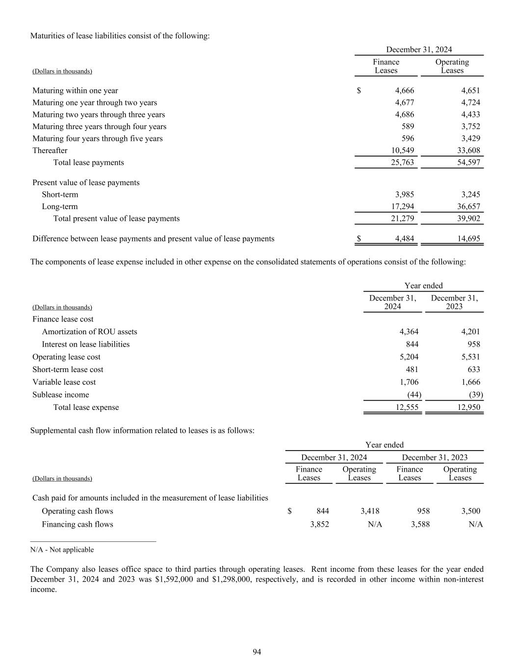 Maturities of lease liabilities consist of the following: December 31, 2024 (Dollars in thousands) Finance Leases Operating Leases Maturing within one year $ 4,666 4,651 Maturing one year through two years 4,677 4,724 Maturing two years through three years 4,686 4,433 Maturing three years through four years 589 3,752 Maturing four years through five years 596 3,429 Thereafter 10,549 33,608 Total lease payments 25,763 54,597 Present value of lease payments Short-term 3,985 3,245 Long-term 17,294 36,657 Total present value of lease payments 21,279 39,902 Difference between lease payments and present value of lease payments $ 4,484 14,695 The components of lease expense included in other expense on the consolidated statements of operations consist of the following: Year ended (Dollars in thousands) December 31, 2024 December 31, 2023 Finance lease cost Amortization of ROU assets 4,364 4,201 Interest on lease liabilities 844 958 Operating lease cost 5,204 5,531 Short-term lease cost 481 633 Variable lease cost 1,706 1,666 Sublease income (44) (39) Total lease expense 12,555 12,950 Supplemental cash flow information related to leases is as follows: Year ended December 31, 2024 December 31, 2023 (Dollars in thousands) Finance Leases Operating Leases Finance Leases Operating Leases Cash paid for amounts included in the measurement of lease liabilities Operating cash flows $ 844 3,418 958 3,500 Financing cash flows 3,852 N/A 3,588 N/A ______________________________ N/A - Not applicable The Company also leases office space to third parties through operating leases. Rent income from these leases for the year ended December 31, 2024 and 2023 was $1,592,000 and $1,298,000, respectively, and is recorded in other income within non-interest income. 94