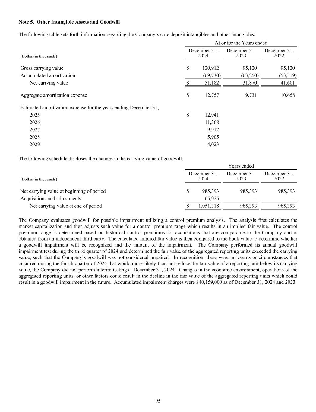 Note 5. Other Intangible Assets and Goodwill The following table sets forth information regarding the Company’s core deposit intangibles and other intangibles: At or for the Years ended (Dollars in thousands) December 31, 2024 December 31, 2023 December 31, 2022 Gross carrying value $ 120,912 95,120 95,120 Accumulated amortization (69,730) (63,250) (53,519) Net carrying value $ 51,182 31,870 41,601 Aggregate amortization expense $ 12,757 9,731 10,658 Estimated amortization expense for the years ending December 31, 2025 $ 12,941 2026 11,368 2027 9,912 2028 5,905 2029 4,023 The following schedule discloses the changes in the carrying value of goodwill: Years ended (Dollars in thousands) December 31, 2024 December 31, 2023 December 31, 2022 Net carrying value at beginning of period $ 985,393 985,393 985,393 Acquisitions and adjustments 65,925 — — Net carrying value at end of period $ 1,051,318 985,393 985,393 The Company evaluates goodwill for possible impairment utilizing a control premium analysis. The analysis first calculates the market capitalization and then adjusts such value for a control premium range which results in an implied fair value. The control premium range is determined based on historical control premiums for acquisitions that are comparable to the Company and is obtained from an independent third party. The calculated implied fair value is then compared to the book value to determine whether a goodwill impairment will be recognized and the amount of the impairment. The Company performed its annual goodwill impairment test during the third quarter of 2024 and determined the fair value of the aggregated reporting units exceeded the carrying value, such that the Company’s goodwill was not considered impaired. In recognition, there were no events or circumstances that occurred during the fourth quarter of 2024 that would more-likely-than-not reduce the fair value of a reporting unit below its carrying value, the Company did not perform interim testing at December 31, 2024. Changes in the economic environment, operations of the aggregated reporting units, or other factors could result in the decline in the fair value of the aggregated reporting units which could result in a goodwill impairment in the future. Accumulated impairment charges were $40,159,000 as of December 31, 2024 and 2023. 95