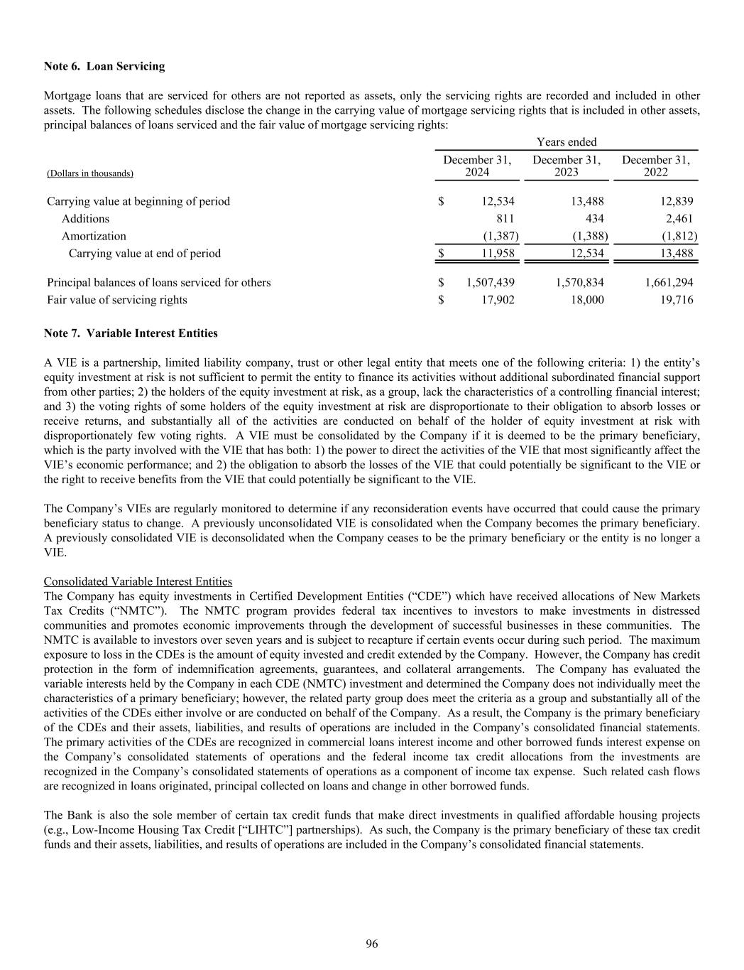 Note 6. Loan Servicing Mortgage loans that are serviced for others are not reported as assets, only the servicing rights are recorded and included in other assets. The following schedules disclose the change in the carrying value of mortgage servicing rights that is included in other assets, principal balances of loans serviced and the fair value of mortgage servicing rights: Years ended (Dollars in thousands) December 31, 2024 December 31, 2023 December 31, 2022 Carrying value at beginning of period $ 12,534 13,488 12,839 Additions 811 434 2,461 Amortization (1,387) (1,388) (1,812) Carrying value at end of period $ 11,958 12,534 13,488 Principal balances of loans serviced for others $ 1,507,439 1,570,834 1,661,294 Fair value of servicing rights $ 17,902 18,000 19,716 Note 7. Variable Interest Entities A VIE is a partnership, limited liability company, trust or other legal entity that meets one of the following criteria: 1) the entity’s equity investment at risk is not sufficient to permit the entity to finance its activities without additional subordinated financial support from other parties; 2) the holders of the equity investment at risk, as a group, lack the characteristics of a controlling financial interest; and 3) the voting rights of some holders of the equity investment at risk are disproportionate to their obligation to absorb losses or receive returns, and substantially all of the activities are conducted on behalf of the holder of equity investment at risk with disproportionately few voting rights. A VIE must be consolidated by the Company if it is deemed to be the primary beneficiary, which is the party involved with the VIE that has both: 1) the power to direct the activities of the VIE that most significantly affect the VIE’s economic performance; and 2) the obligation to absorb the losses of the VIE that could potentially be significant to the VIE or the right to receive benefits from the VIE that could potentially be significant to the VIE. The Company’s VIEs are regularly monitored to determine if any reconsideration events have occurred that could cause the primary beneficiary status to change. A previously unconsolidated VIE is consolidated when the Company becomes the primary beneficiary. A previously consolidated VIE is deconsolidated when the Company ceases to be the primary beneficiary or the entity is no longer a VIE. Consolidated Variable Interest Entities The Company has equity investments in Certified Development Entities (“CDE”) which have received allocations of New Markets Tax Credits (“NMTC”). The NMTC program provides federal tax incentives to investors to make investments in distressed communities and promotes economic improvements through the development of successful businesses in these communities. The NMTC is available to investors over seven years and is subject to recapture if certain events occur during such period. The maximum exposure to loss in the CDEs is the amount of equity invested and credit extended by the Company. However, the Company has credit protection in the form of indemnification agreements, guarantees, and collateral arrangements. The Company has evaluated the variable interests held by the Company in each CDE (NMTC) investment and determined the Company does not individually meet the characteristics of a primary beneficiary; however, the related party group does meet the criteria as a group and substantially all of the activities of the CDEs either involve or are conducted on behalf of the Company. As a result, the Company is the primary beneficiary of the CDEs and their assets, liabilities, and results of operations are included in the Company’s consolidated financial statements. The primary activities of the CDEs are recognized in commercial loans interest income and other borrowed funds interest expense on the Company’s consolidated statements of operations and the federal income tax credit allocations from the investments are recognized in the Company’s consolidated statements of operations as a component of income tax expense. Such related cash flows are recognized in loans originated, principal collected on loans and change in other borrowed funds. The Bank is also the sole member of certain tax credit funds that make direct investments in qualified affordable housing projects (e.g., Low-Income Housing Tax Credit [“LIHTC”] partnerships). As such, the Company is the primary beneficiary of these tax credit funds and their assets, liabilities, and results of operations are included in the Company’s consolidated financial statements. 96