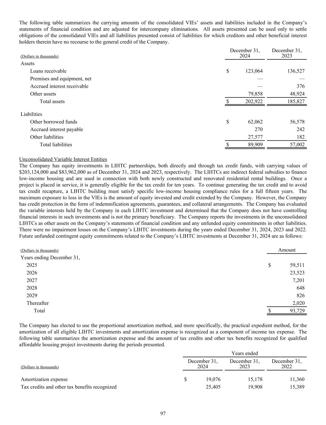 The following table summarizes the carrying amounts of the consolidated VIEs’ assets and liabilities included in the Company’s statements of financial condition and are adjusted for intercompany eliminations. All assets presented can be used only to settle obligations of the consolidated VIEs and all liabilities presented consist of liabilities for which creditors and other beneficial interest holders therein have no recourse to the general credit of the Company. (Dollars in thousands) December 31, 2024 December 31, 2023 Assets Loans receivable $ 123,064 136,527 Premises and equipment, net — — Accrued interest receivable — 376 Other assets 79,858 48,924 Total assets $ 202,922 185,827 Liabilities Other borrowed funds $ 62,062 56,578 Accrued interest payable 270 242 Other liabilities 27,577 182 Total liabilities $ 89,909 57,002 Unconsolidated Variable Interest Entities The Company has equity investments in LIHTC partnerships, both directly and through tax credit funds, with carrying values of $203,124,000 and $83,962,000 as of December 31, 2024 and 2023, respectively. The LIHTCs are indirect federal subsidies to finance low-income housing and are used in connection with both newly constructed and renovated residential rental buildings. Once a project is placed in service, it is generally eligible for the tax credit for ten years. To continue generating the tax credit and to avoid tax credit recapture, a LIHTC building must satisfy specific low-income housing compliance rules for a full fifteen years. The maximum exposure to loss in the VIEs is the amount of equity invested and credit extended by the Company. However, the Company has credit protection in the form of indemnification agreements, guarantees, and collateral arrangements. The Company has evaluated the variable interests held by the Company in each LIHTC investment and determined that the Company does not have controlling financial interests in such investments and is not the primary beneficiary. The Company reports the investments in the unconsolidated LIHTCs as other assets on the Company’s statements of financial condition and any unfunded equity commitments in other liabilities. There were no impairment losses on the Company’s LIHTC investments during the years ended December 31, 2024, 2023 and 2022. Future unfunded contingent equity commitments related to the Company’s LIHTC investments at December 31, 2024 are as follows: 2025 $ 59,511 2026 23,523 2027 7,201 2028 648 2029 826 Thereafter 2,020 Total $ 93,729 (Dollars in thousands) Amount Years ending December 31, The Company has elected to use the proportional amortization method, and more specifically, the practical expedient method, for the amortization of all eligible LIHTC investments and amortization expense is recognized as a component of income tax expense. The following table summarizes the amortization expense and the amount of tax credits and other tax benefits recognized for qualified affordable housing project investments during the periods presented. Years ended (Dollars in thousands) December 31, 2024 December 31, 2023 December 31, 2022 Amortization expense $ 19,076 15,178 11,360 Tax credits and other tax benefits recognized 25,405 19,908 15,389 97